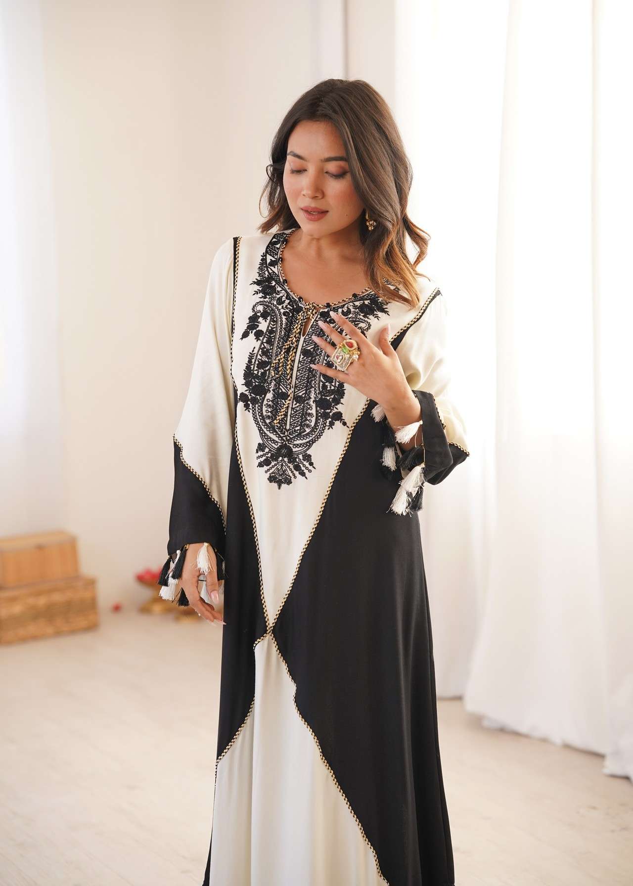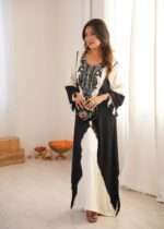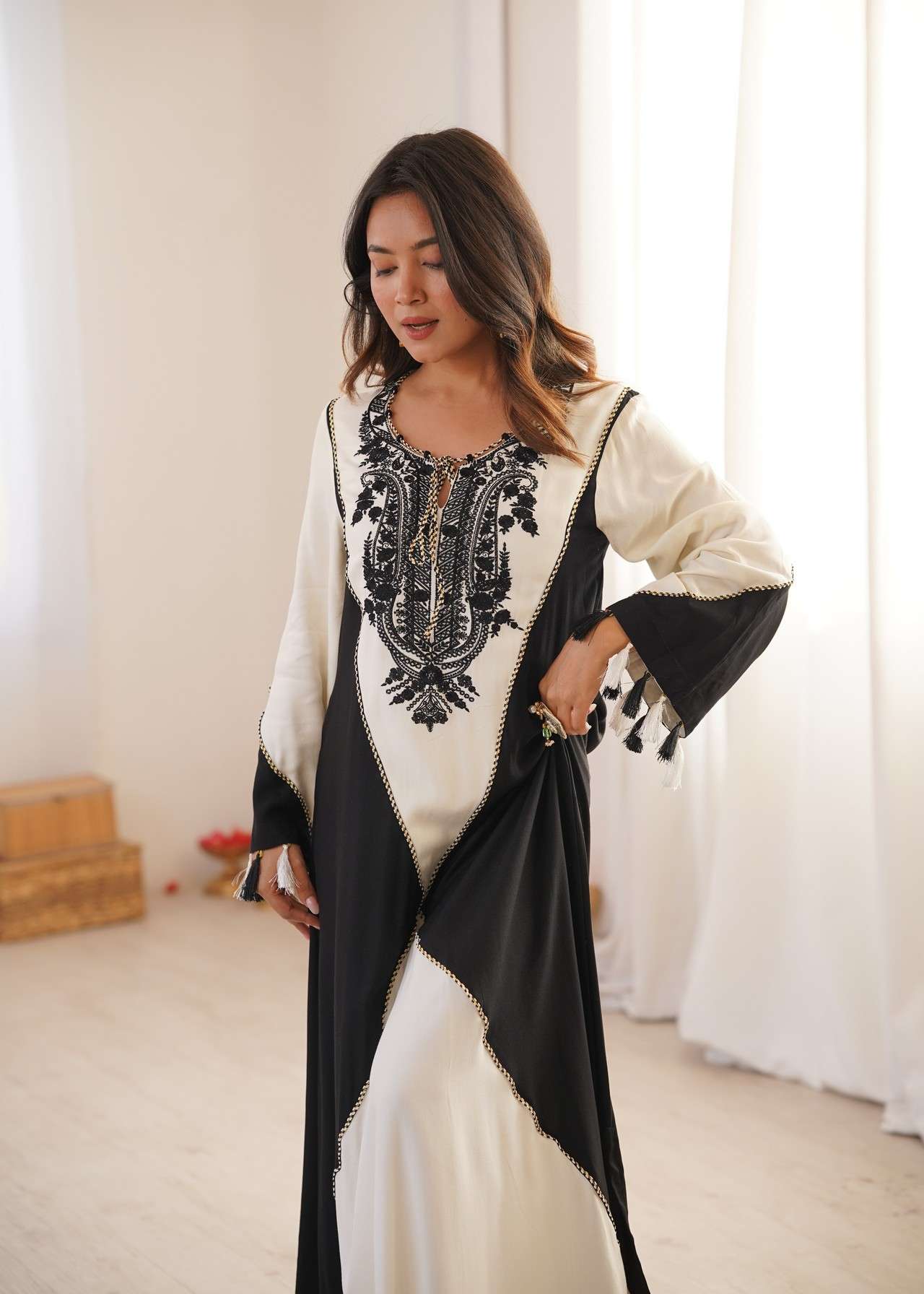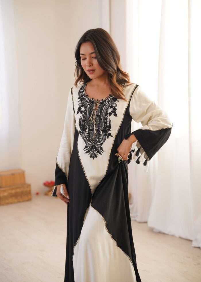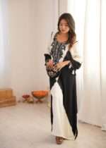 This kaftan blends fluid movement with bold monochrome contrast. Crafted in soft, flowy fabric, this kaftan features a rich ivory base beautifully framed by deep jet-black panels that create a dramatic, elongating silhouette. The neckline is adorned with intricate black embroidery, adding depth, character, and artisanal charm to the design.Delicate tassel details at the sleeves enhance its bohemian-luxe appeal, making it perfect for festive brunches, resort evenings, intimate celebrations, and elevated day-to-night wear.