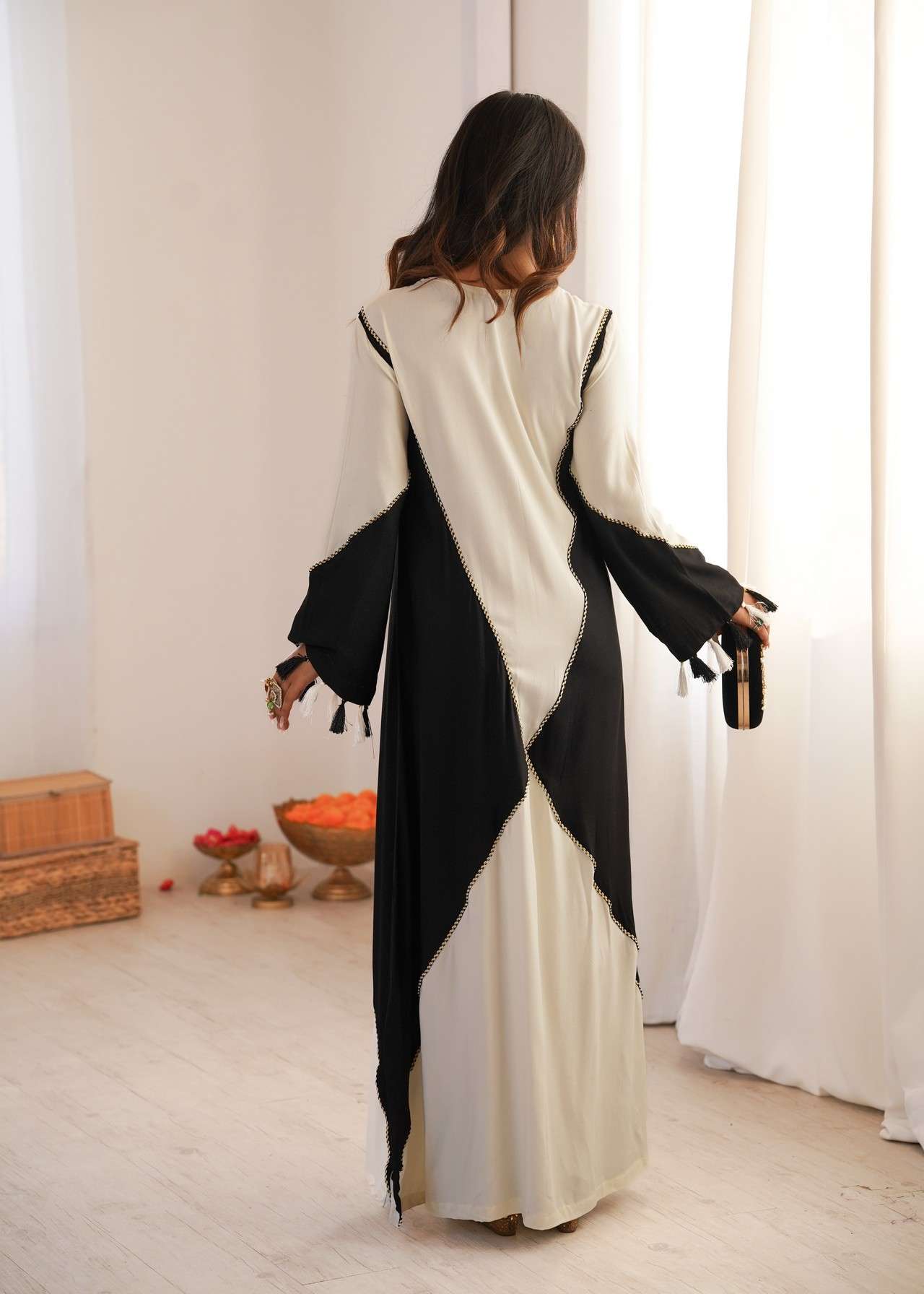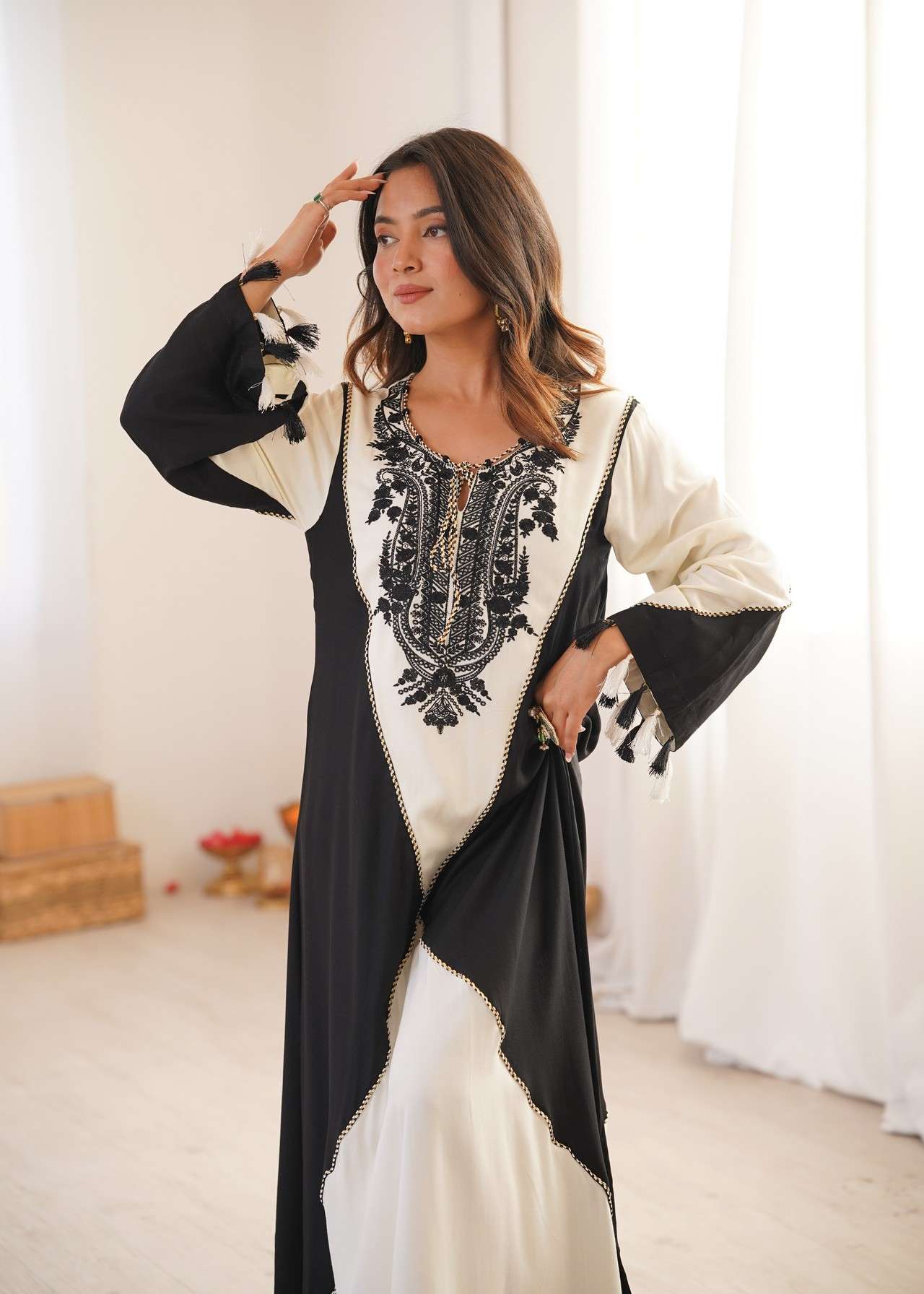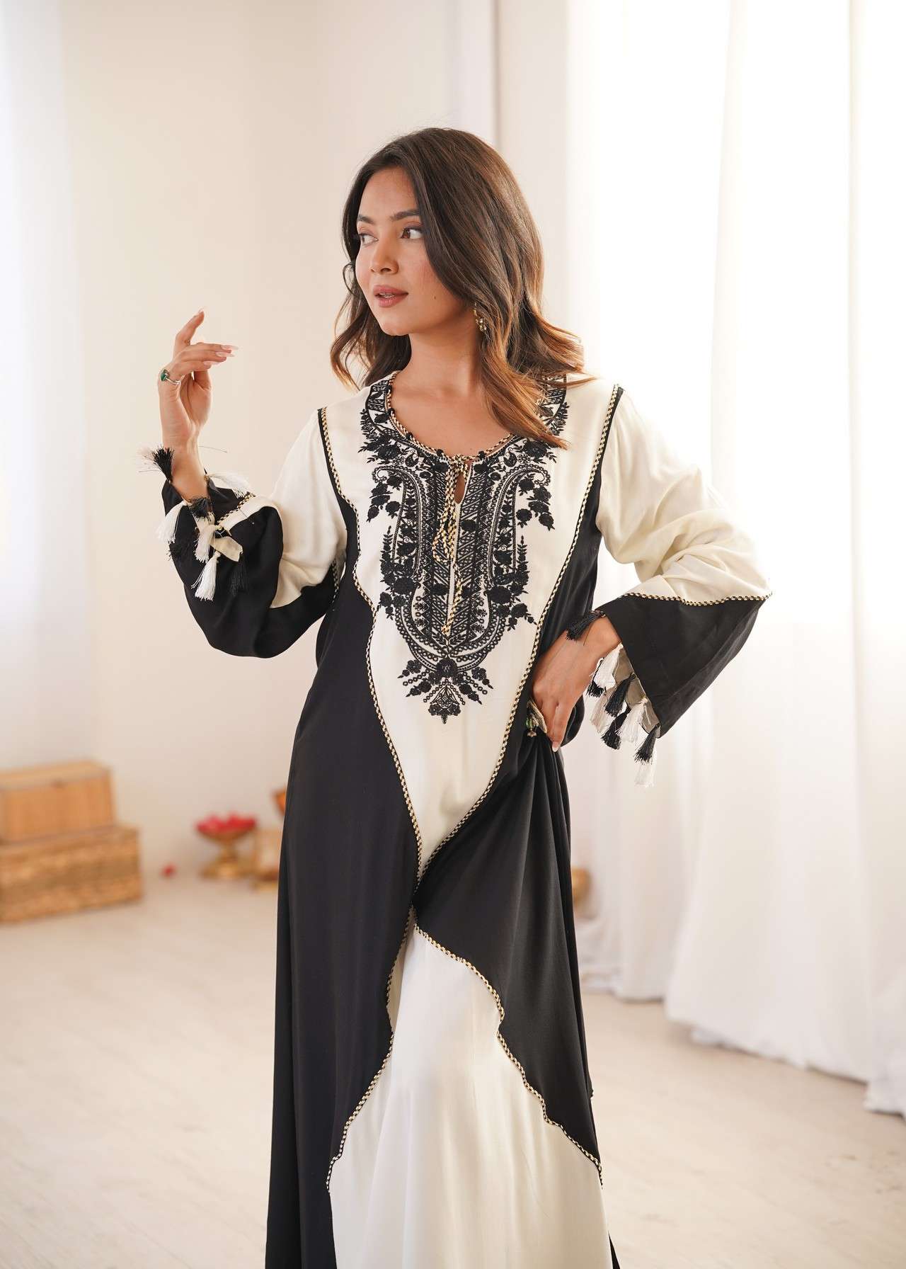 This kaftan blends fluid movement with bold monochrome contrast. Crafted in soft, flowy fabric, this kaftan features a rich ivory base beautifully framed by deep jet-black panels that create a dramatic, elongating silhouette. The neckline is adorned with intricate black embroidery, adding depth, character, and artisanal charm to the design.Delicate tassel details at the sleeves enhance its bohemian-luxe appeal, making it perfect for festive brunches, resort evenings, intimate celebrations, and elevated day-to-night wear.