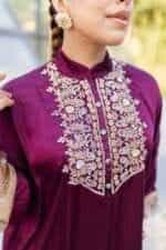 Elevate your everyday style with this knee-length modal satin kaftan, featuring a beautifully embroidered collared neckline. The elegant embroidery adds sophistication to the casual silhouette. Paired perfectly with pants for a polished look.