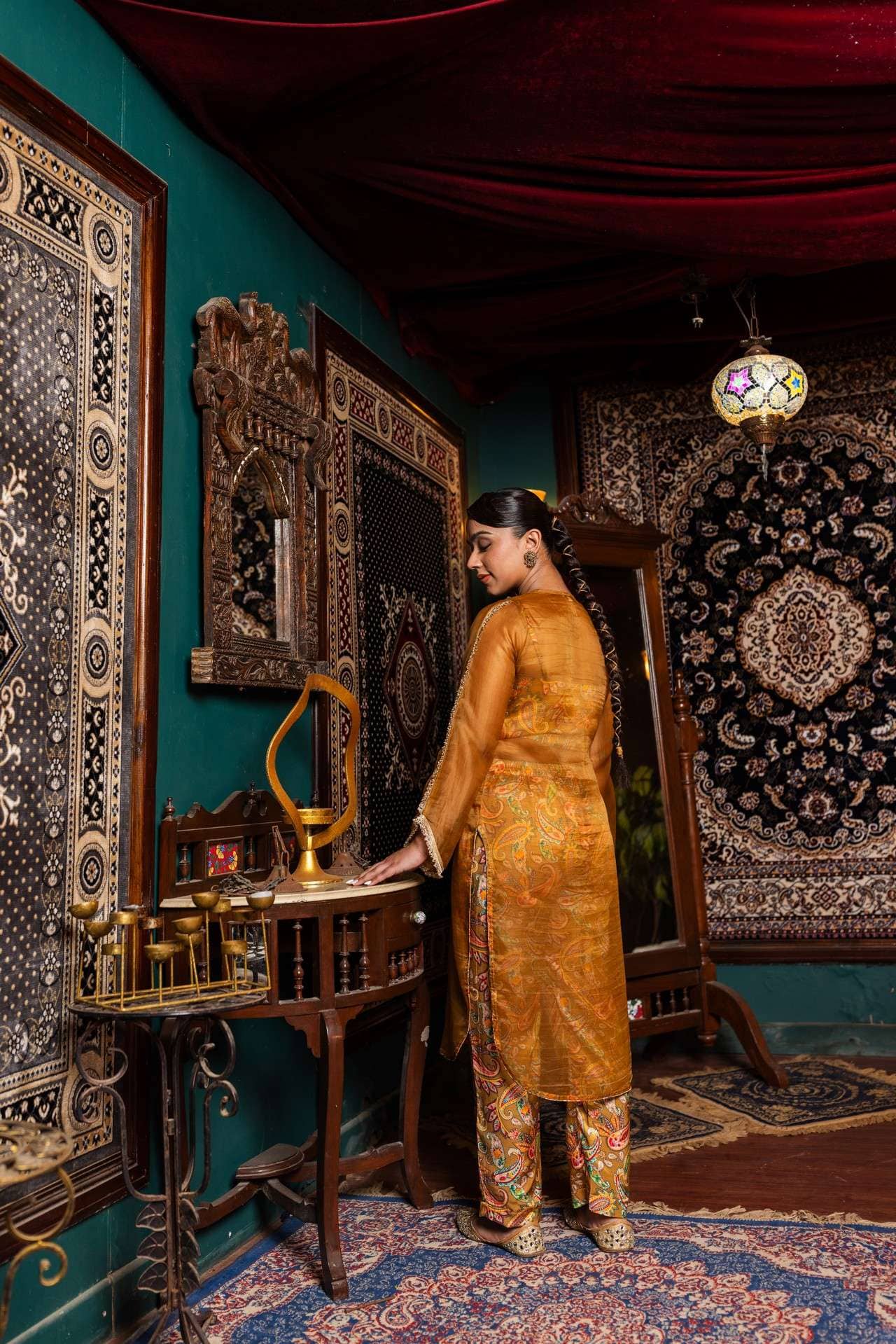 Elevate your festive style with this rust digital-printed Gajji silk bustier suit set, paired effortlessly with a sheer organza overlay. The premium fabric offers unmatched comfort, while the elegant silhouette adds graceful charm to every step.