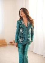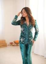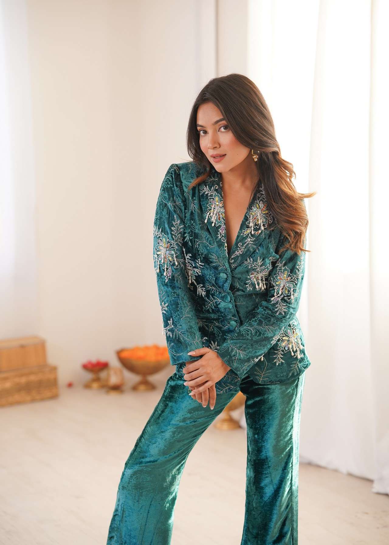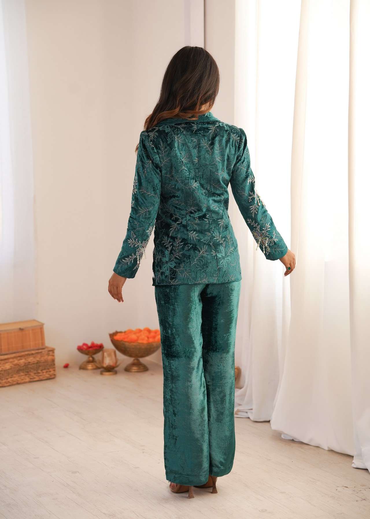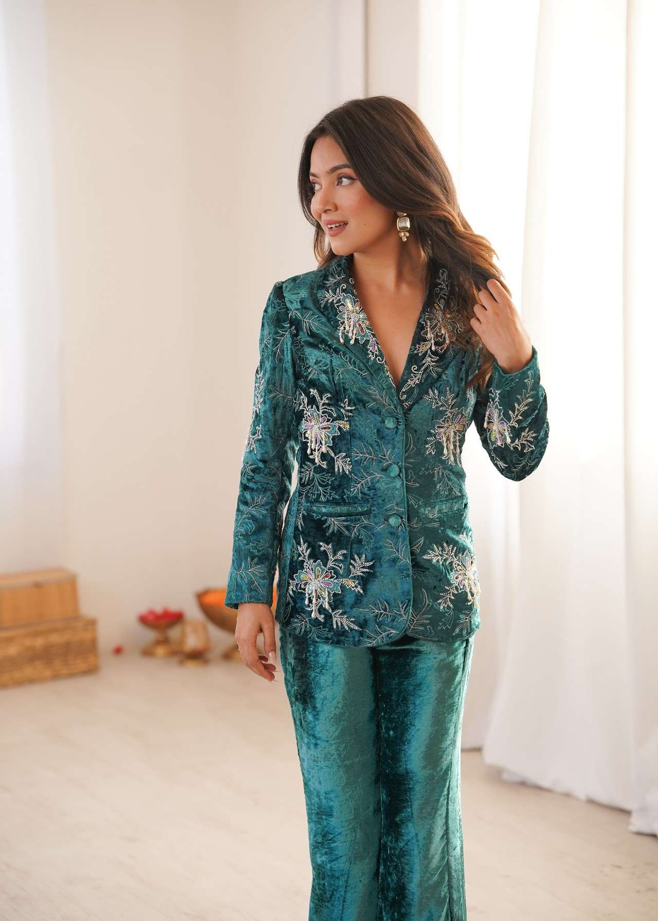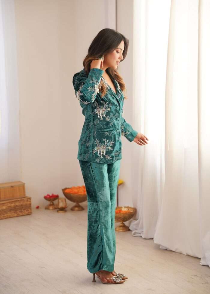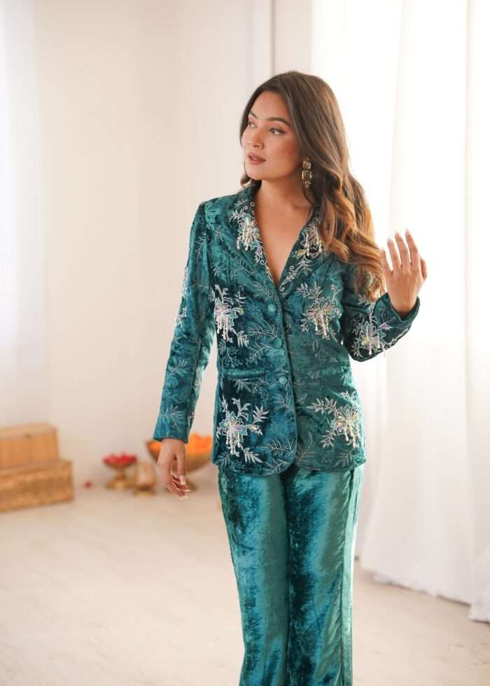 A vision of winter royalty, Zarqa is crafted in plush premium velvet and designed for elevated evening elegance. This statement co-ord features a sharply tailored blazer, adorned with intricate hand-embellished floral motifs. The matching bell bottoms trousers balance structure with fluid sophistication. Rooted in old-world craftsmanship and styled for the modern woman, Zarqa is where soft luxury meets commanding presence. Rich in texture, timeless in appeal—this is your go-to power look for winter festivities, cocktail nights, and intimate celebrations.