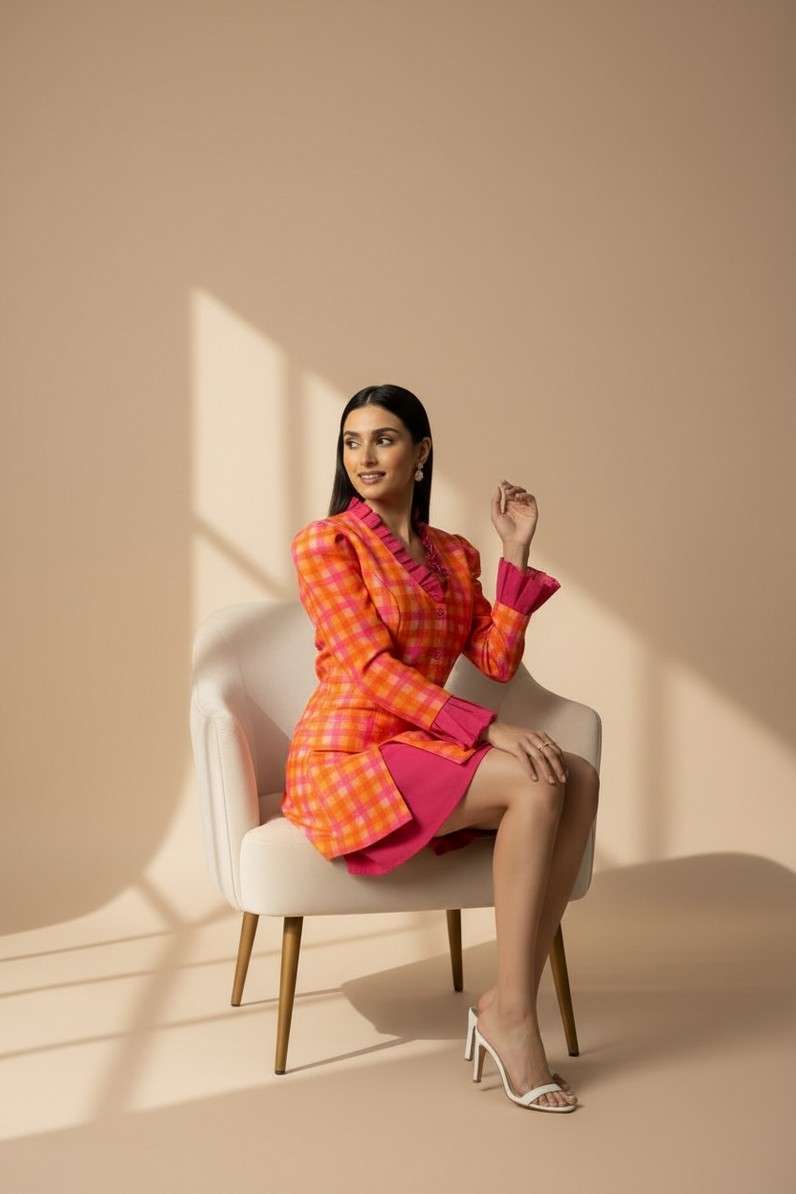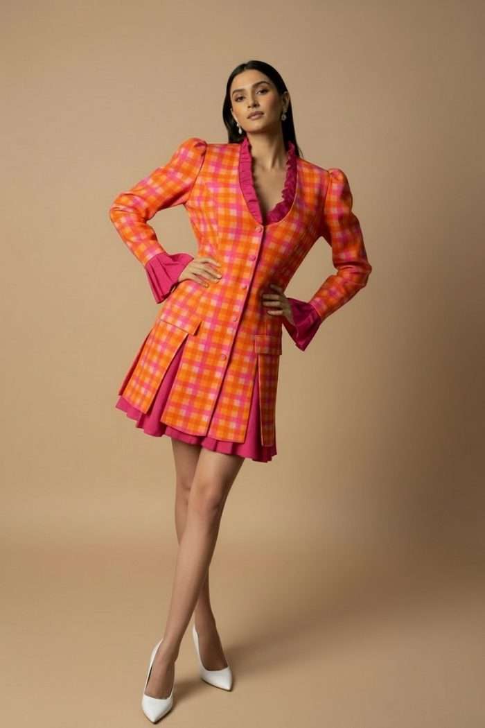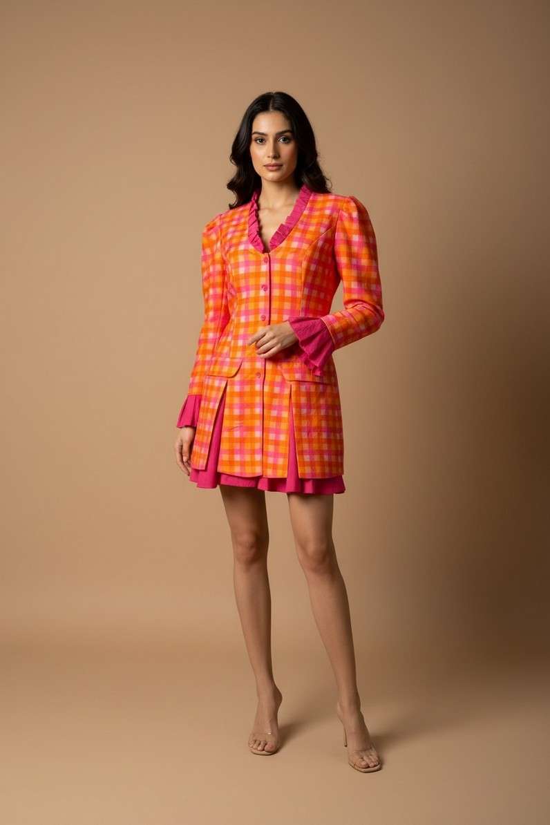 Attached Lining, Blazer With Skirt attached, Neck Frill, Adjustable Back belt and Paded