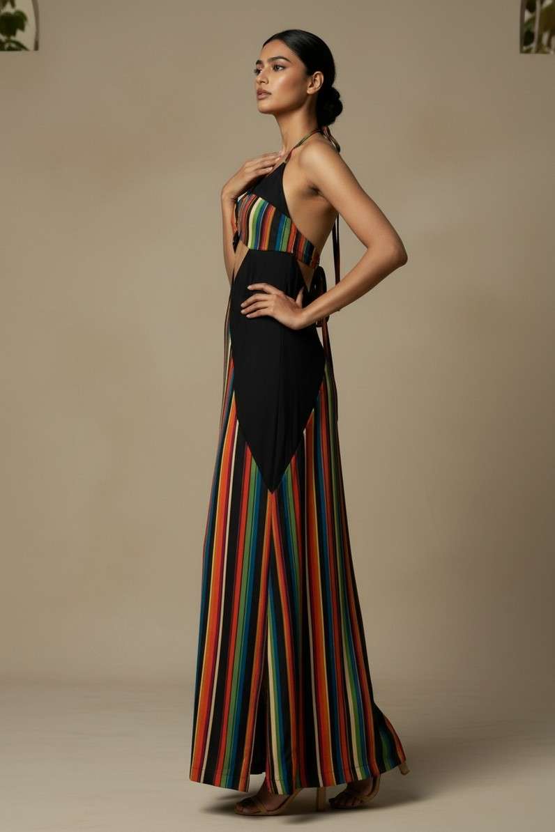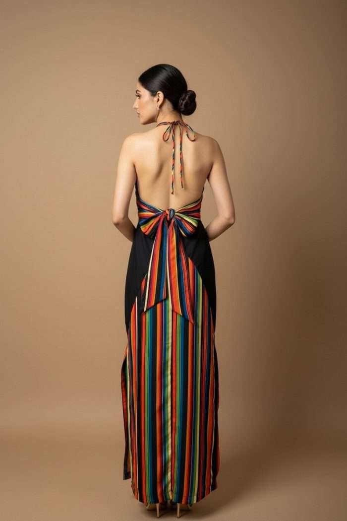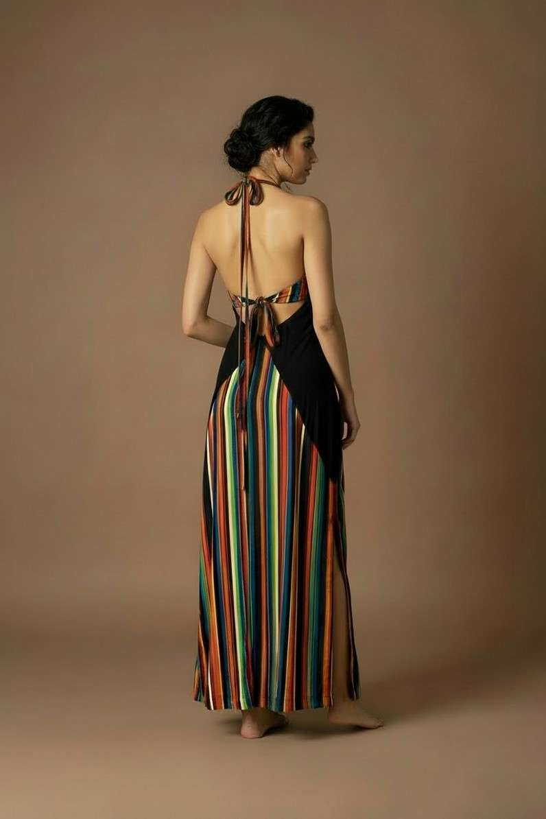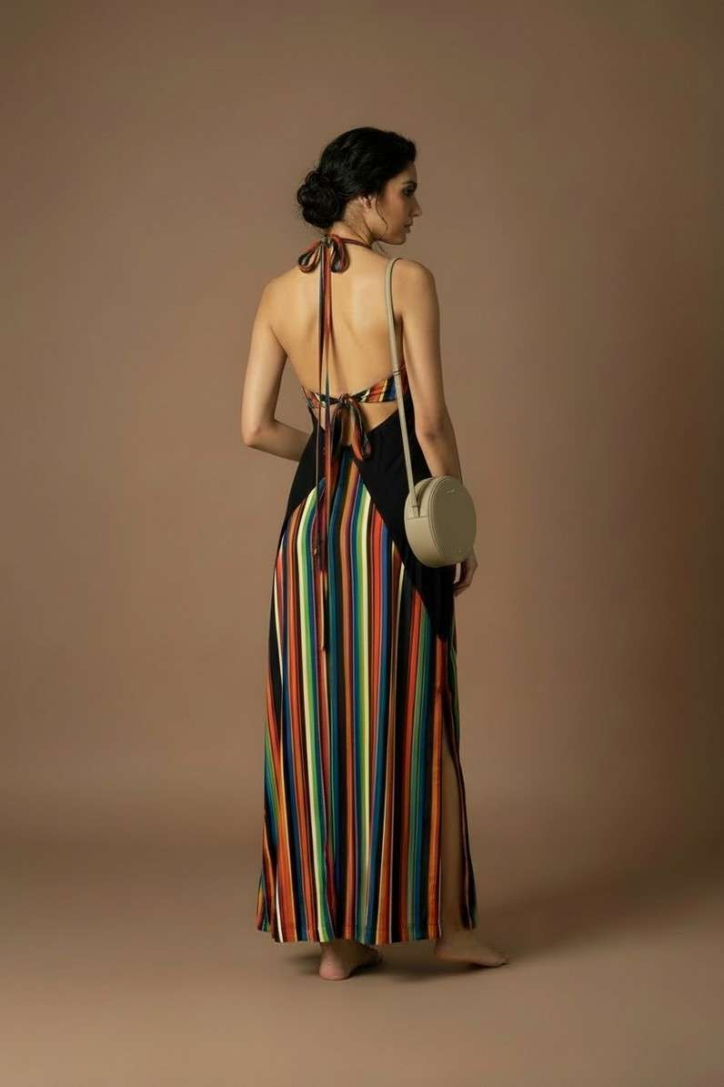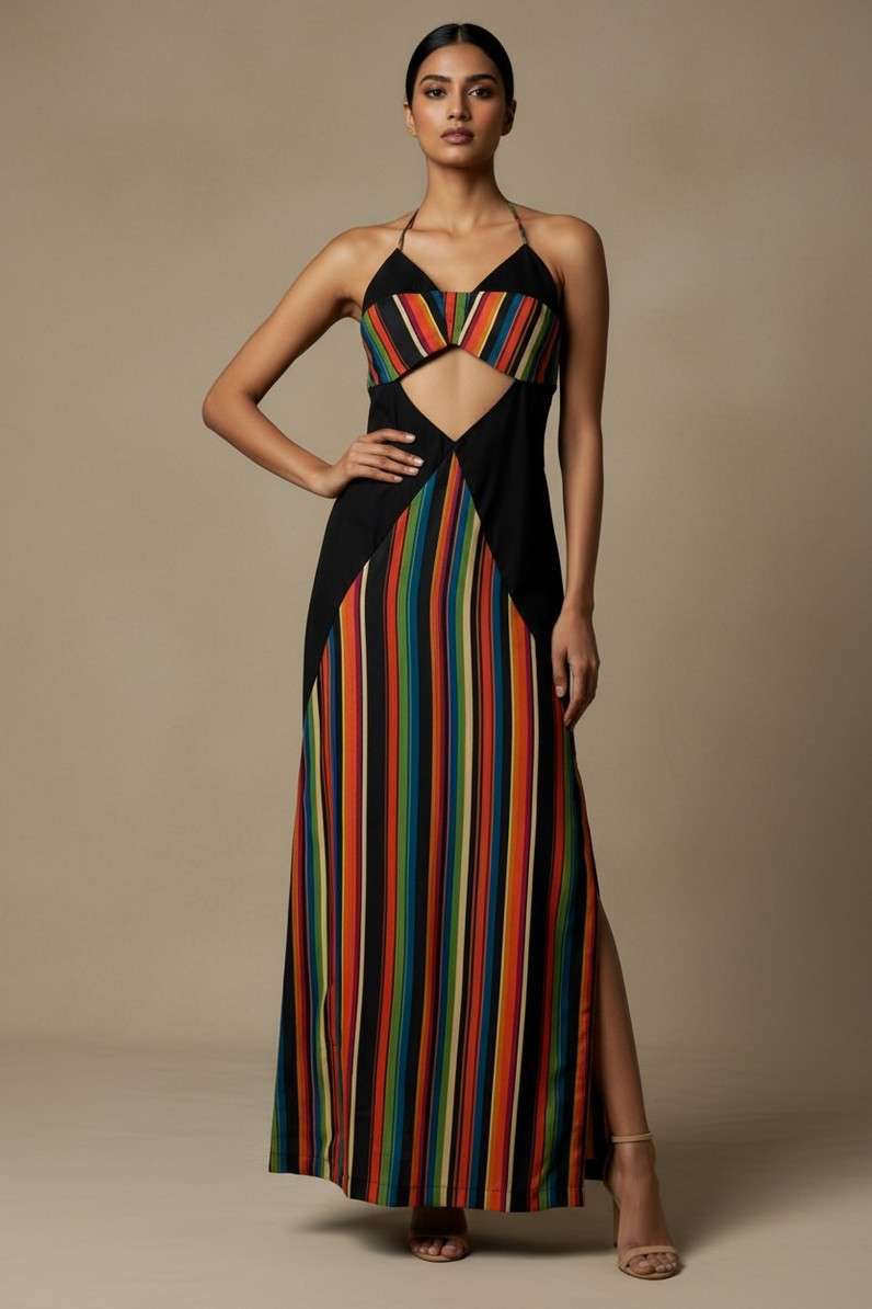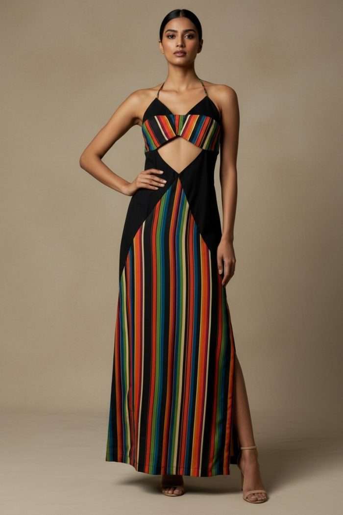Striking and unapologetic, the NOCTRA Dress is made for after-dark moments. The bold cut-outs frame the silhouette, while vibrant stripes add depth and rhythm. Sleek and sculpted, it enhances the body with effortless precision. Designed to command attention, it moves seamlessly from dinner to nightfall. A statement in modern sensuality.