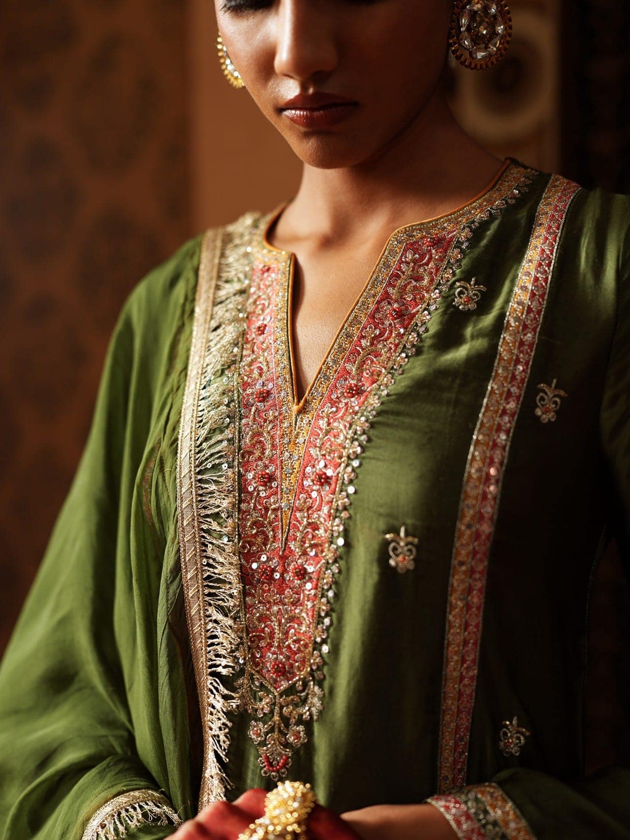 Detailed Gold Embroidery, Rich Olive Green Base, Coral Pink Accents, Traditional Paisley Motifs, Complementary Dupatta