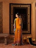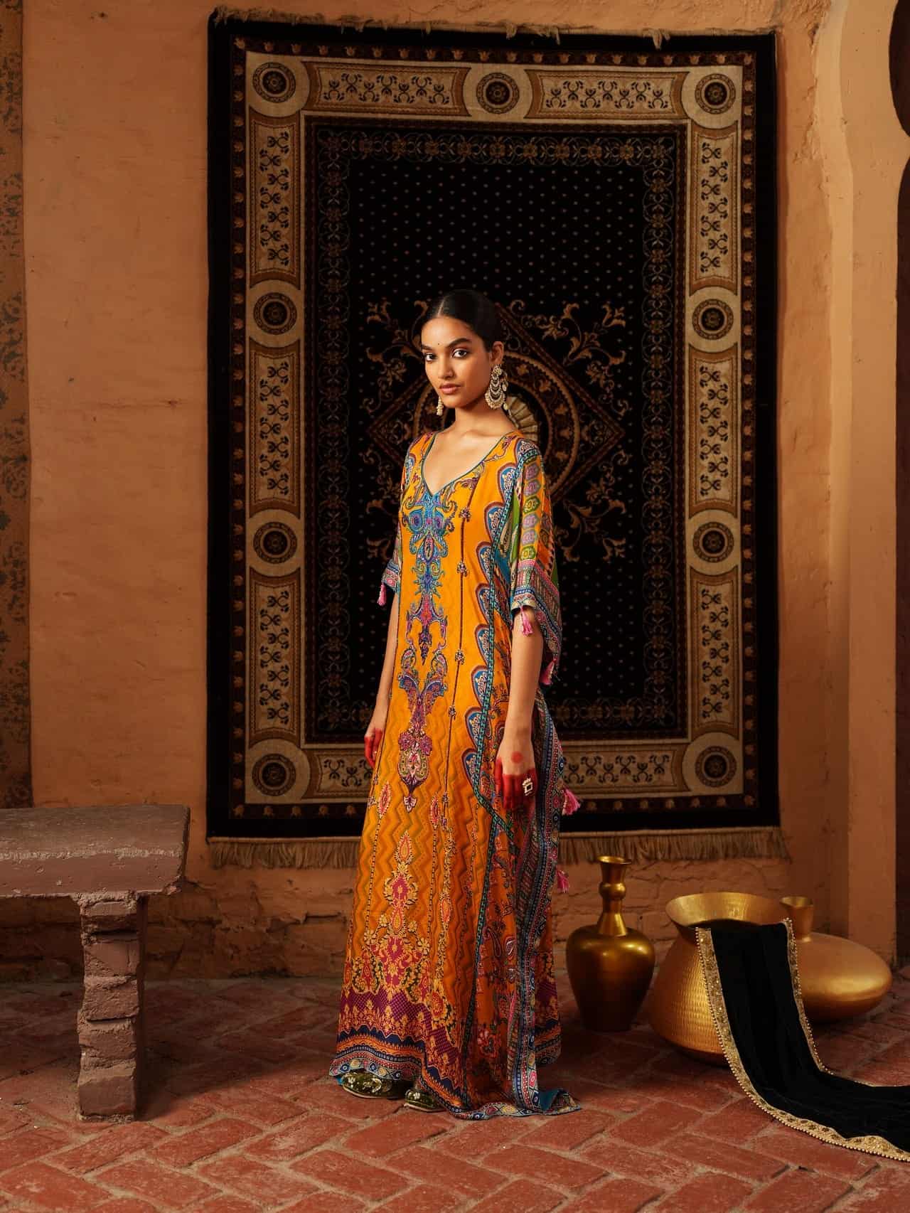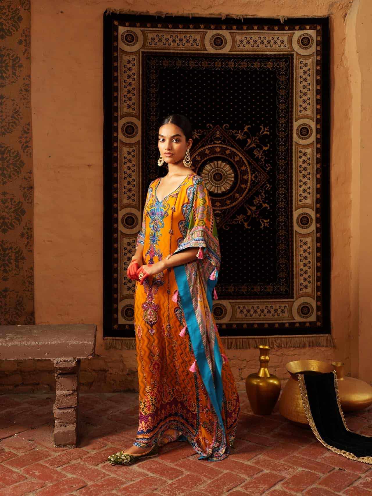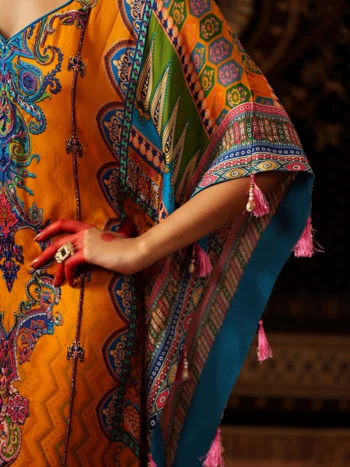 This vibrant orange kaftan features multicolored embroidery with paisley, floral, and geometric motifs in blues, purples, and gold. Crafted from luxurious fabric, it has a wide silhouette with detailed borders. Suitable for formal and festive occasions.