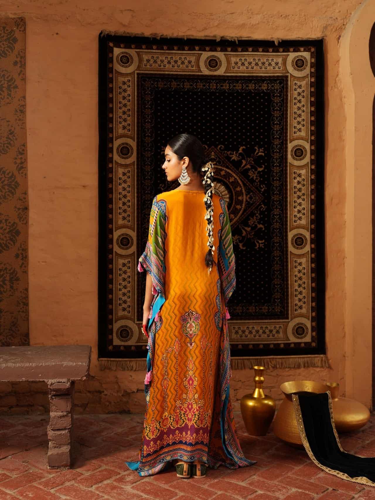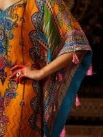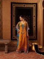 Stand out in this vibrant orange kaftan, richly embroidered with intricate paisley and floral designs. Featuring bold blue, purple, and gold motifs that contrast beautifully with the bright base, this flowing silhouette is finished with eye-catching geometric borders and detailed craftsmanship. Perfect for special events, cultural celebrations, or elegant evenings, this kaftan delivers a stunning statement look.