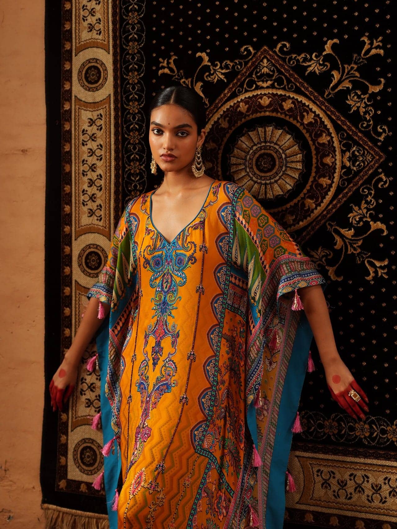 Detailed Multicolored Embroidery, Vibrant Orange Base, Flowing Kaftan Silhouette, Traditional Paisley Motifs, Wide Sleeve Design