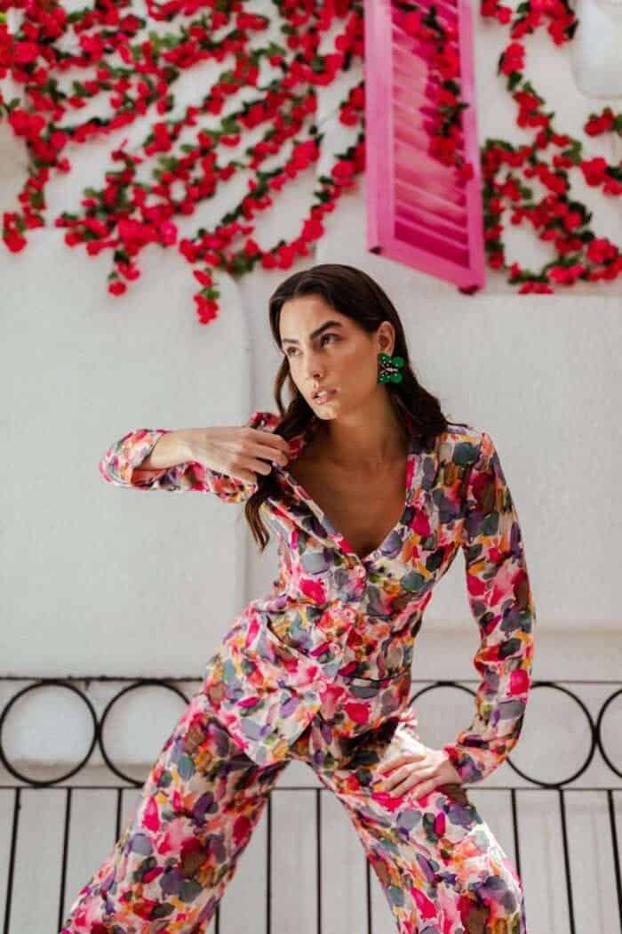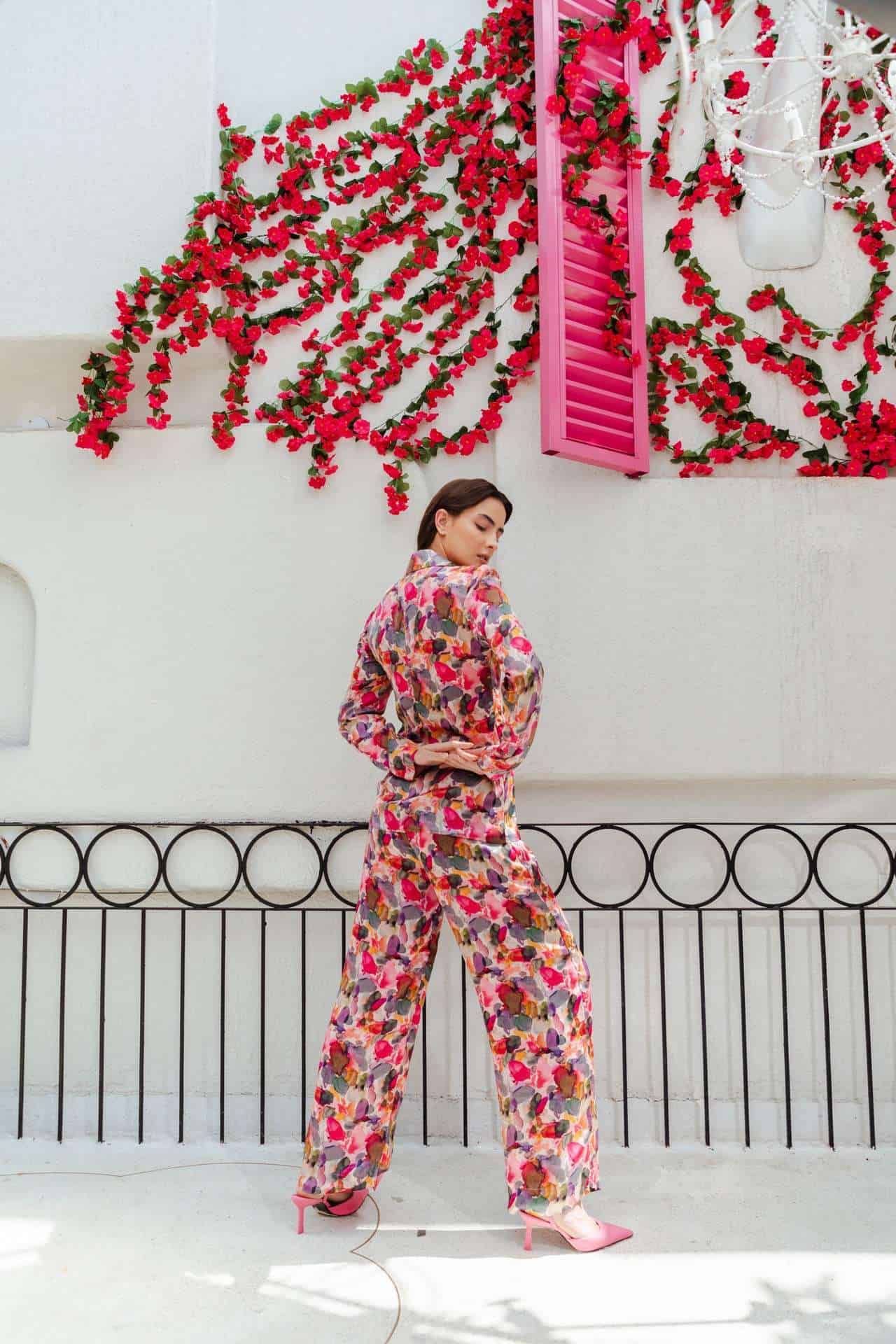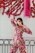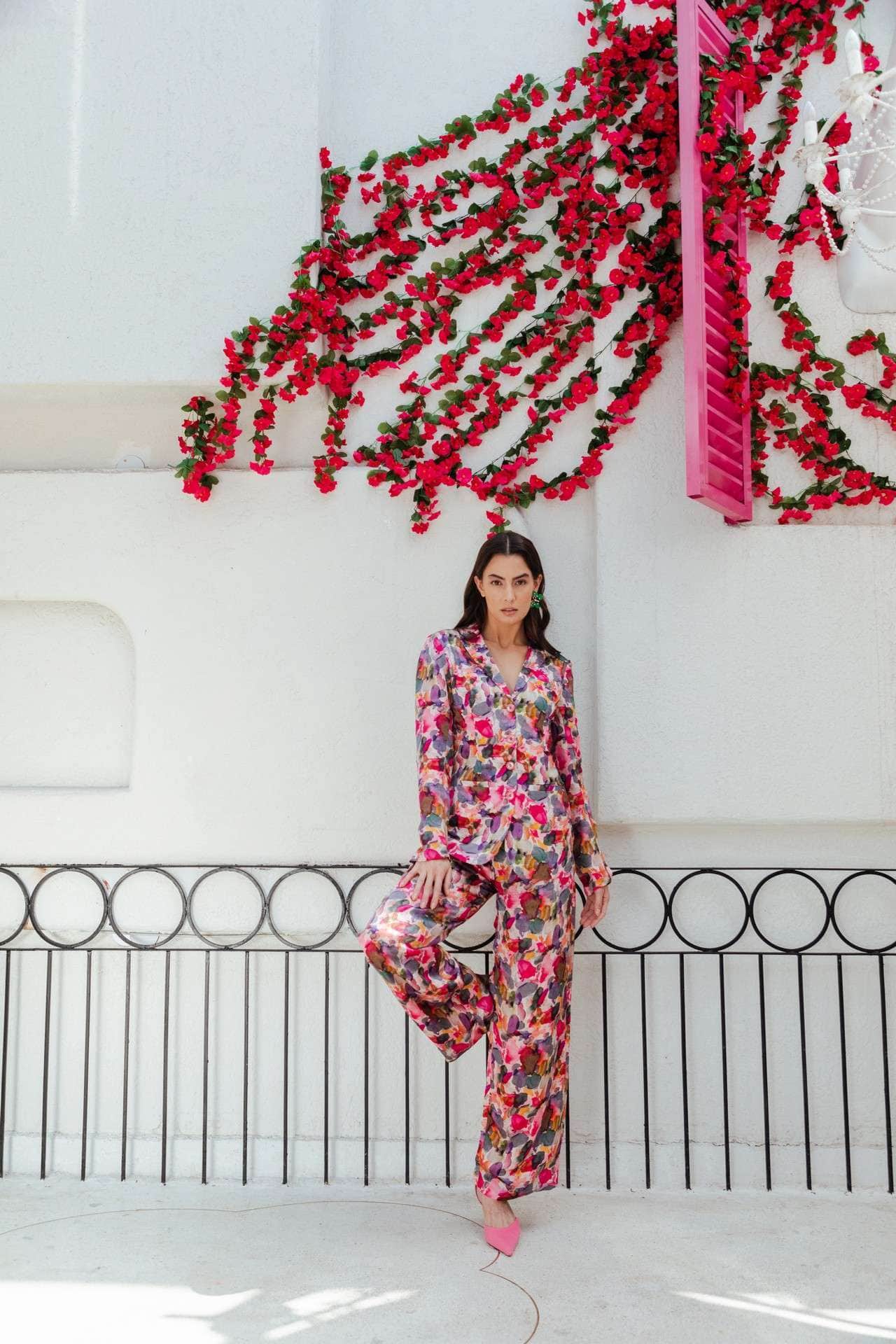 Floral blazer set in pure Bemberg satin. Includes comfort-fit pants and a two-pocket blazer. Soft, luxe finish. Versatile for both casual and formal wear.