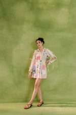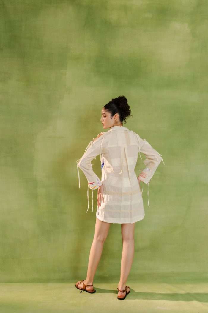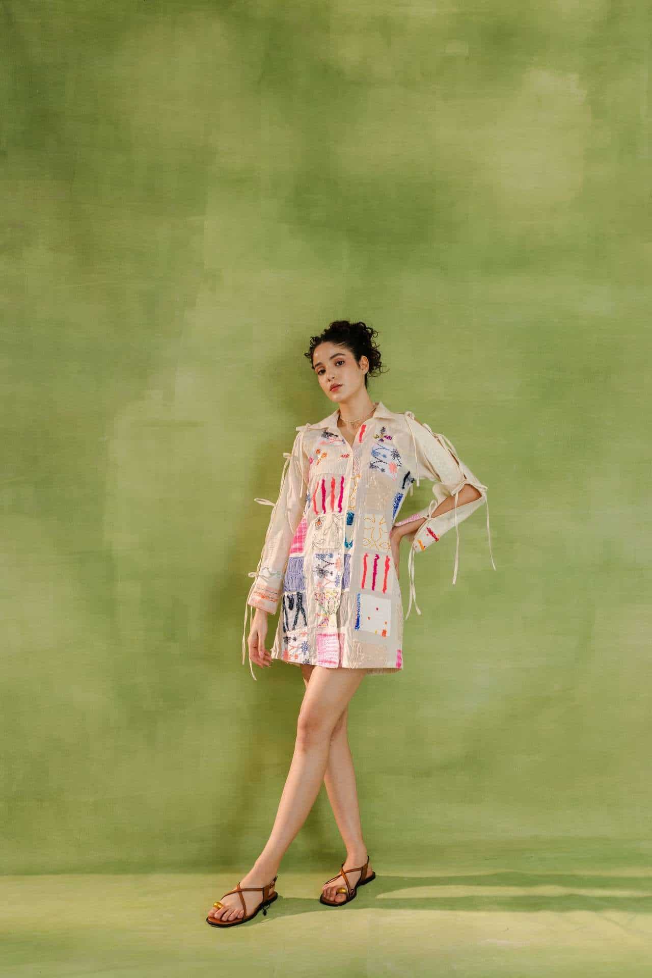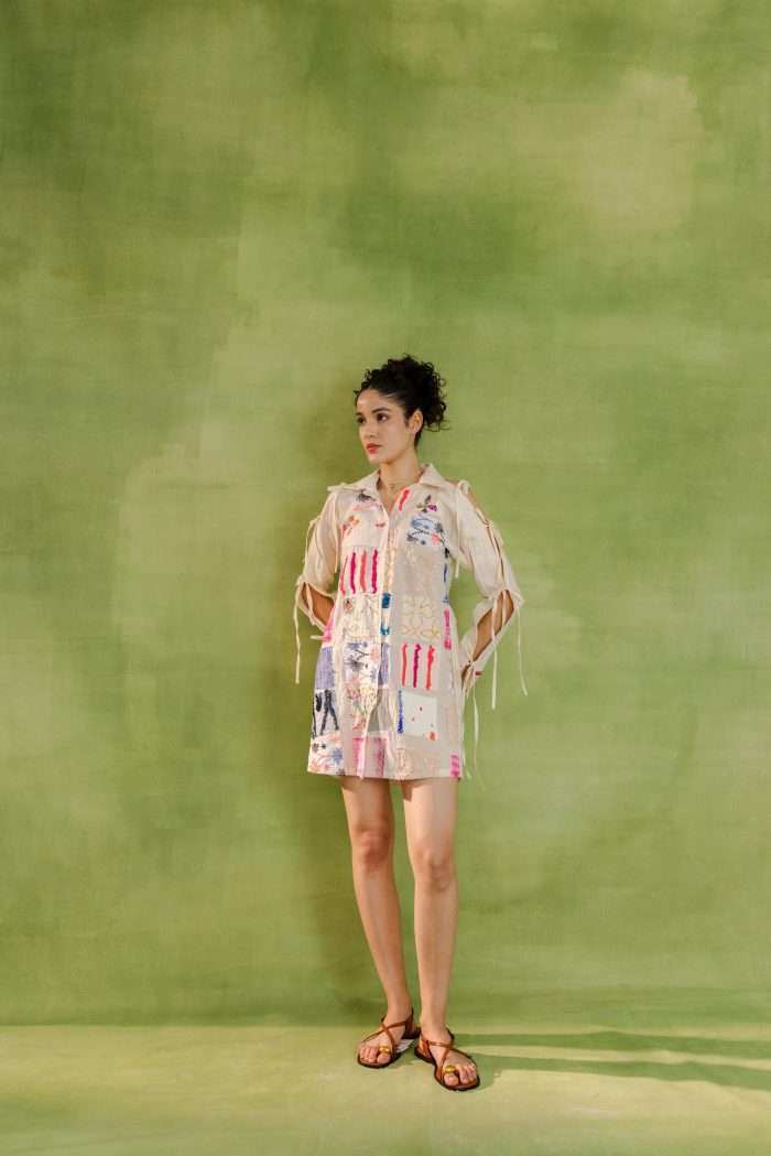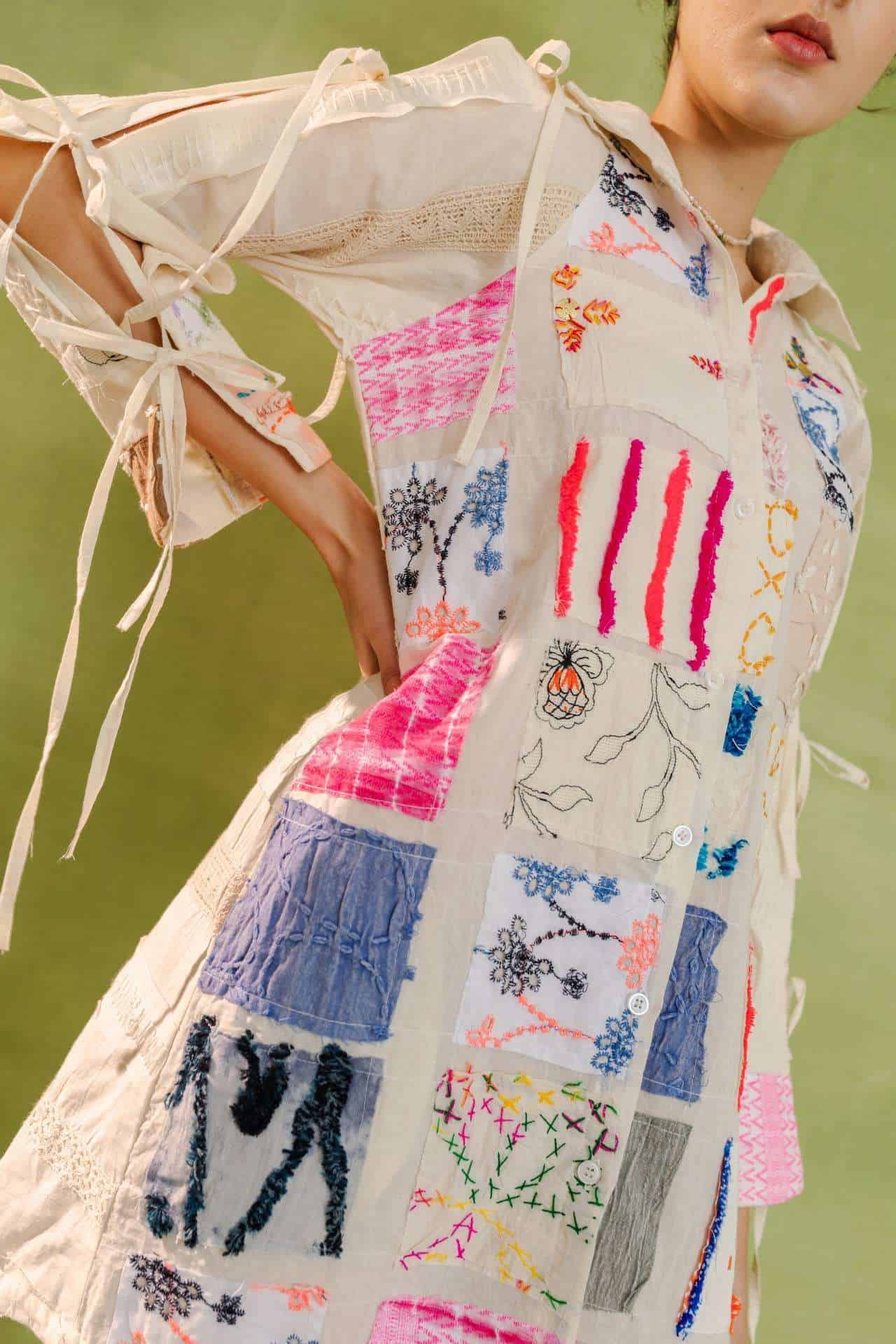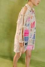 Relaxed-fit shirt dress with a colorful patchwork design combining various patterns and textures. Features a button-down front and lace-up sleeves for added style.