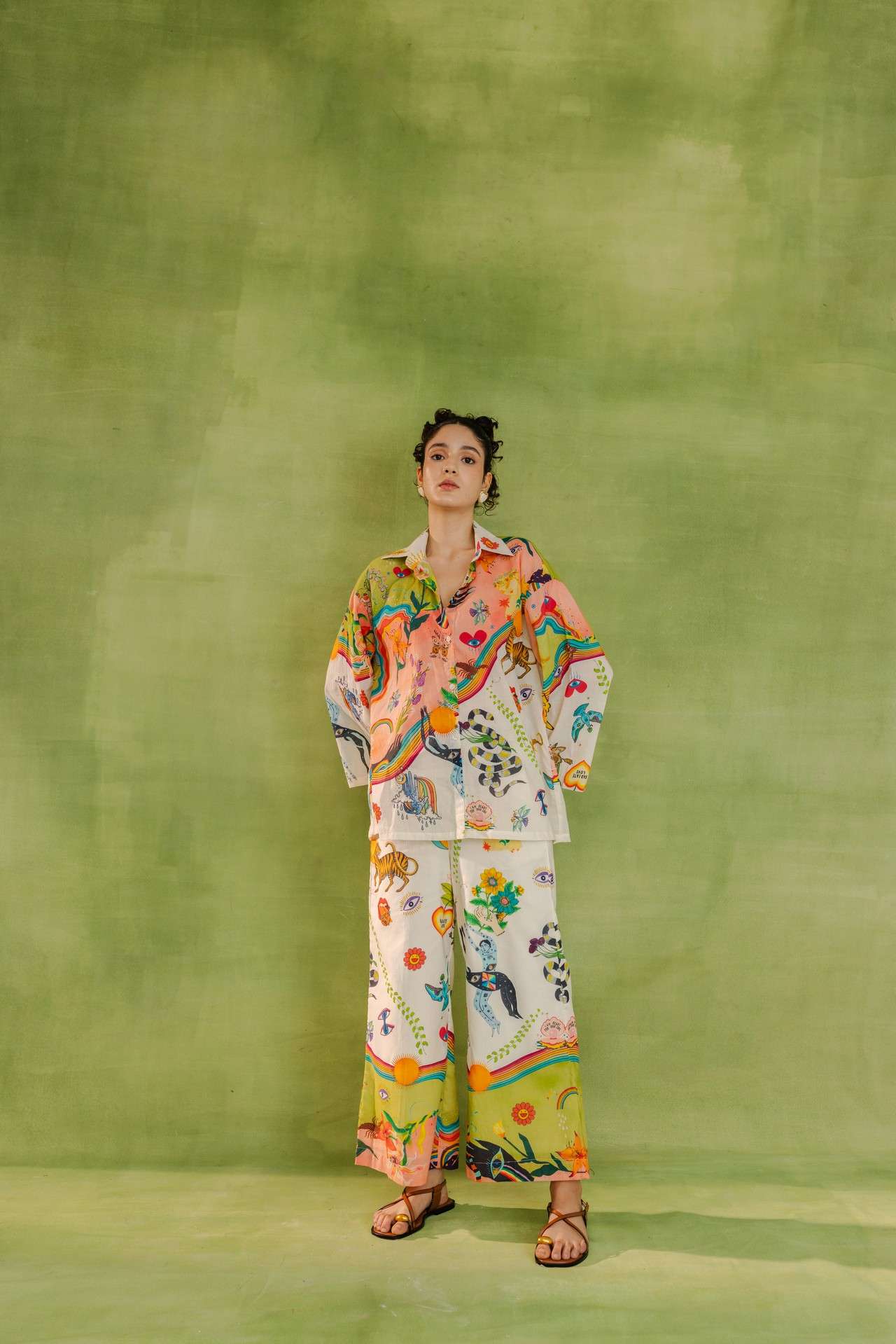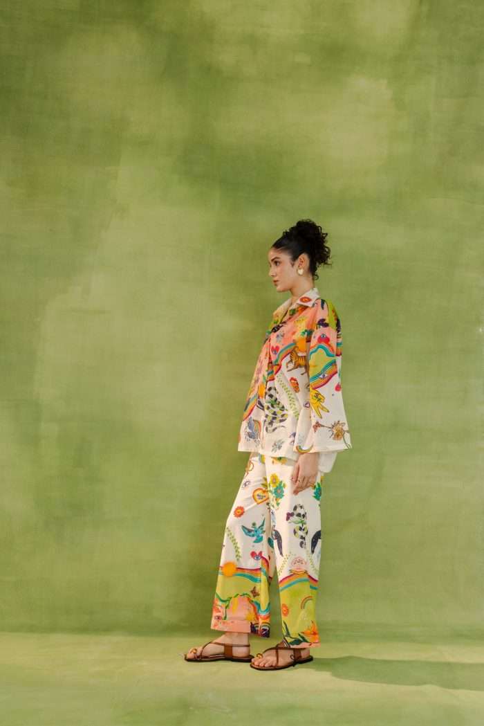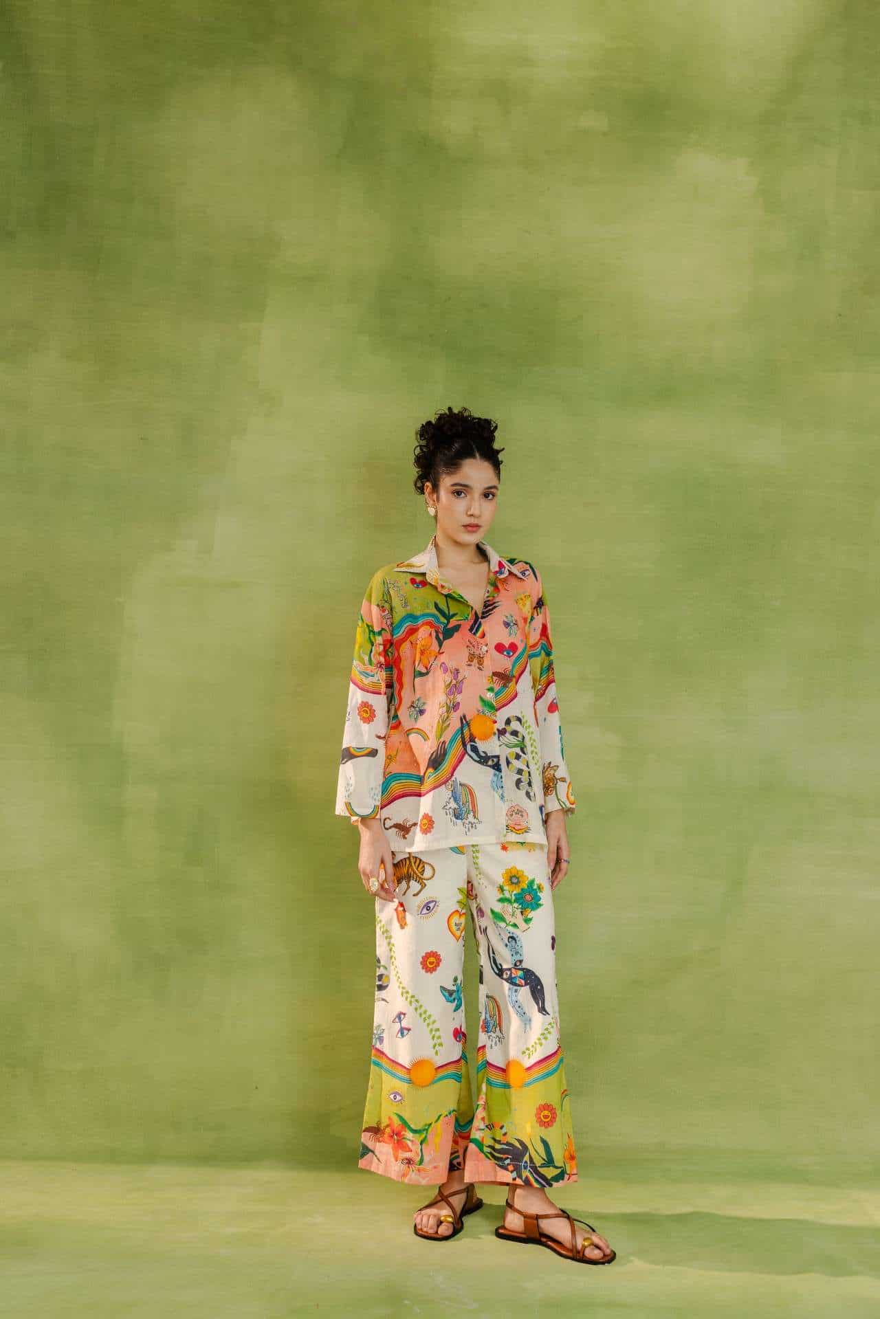 Relaxed-fit button-down shirt and wide-leg trousers featuring nature-inspired prints, abstract illustrations, and whimsical motifs.