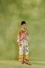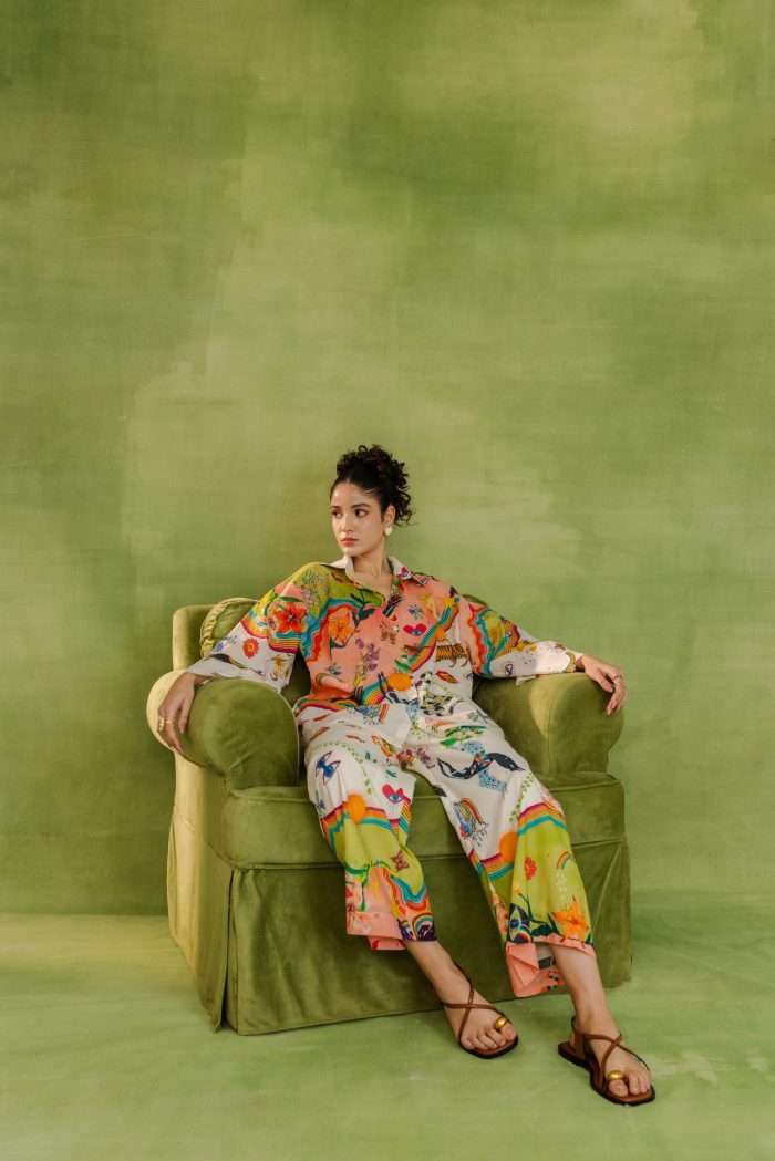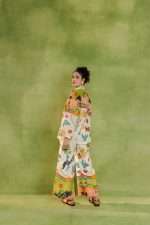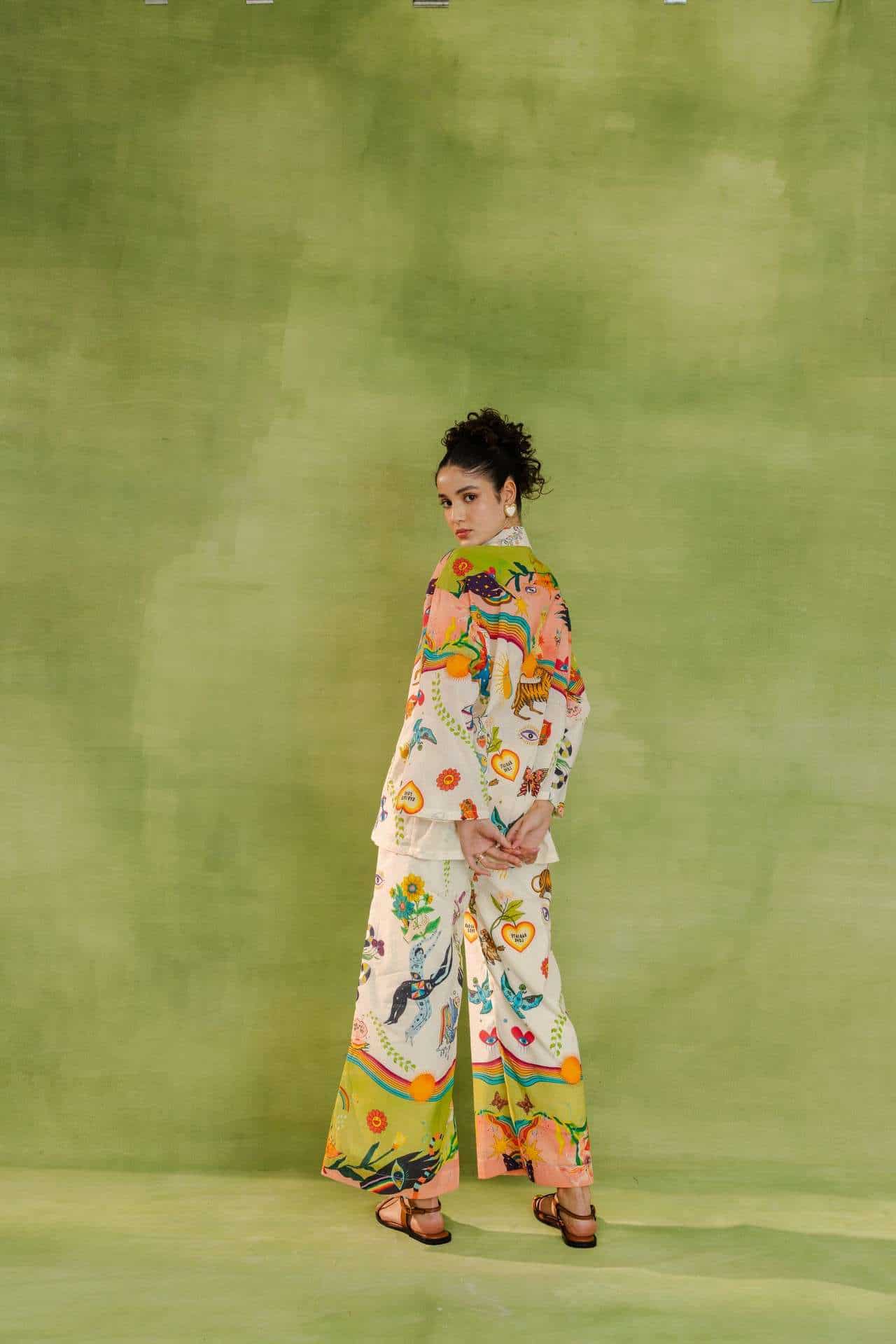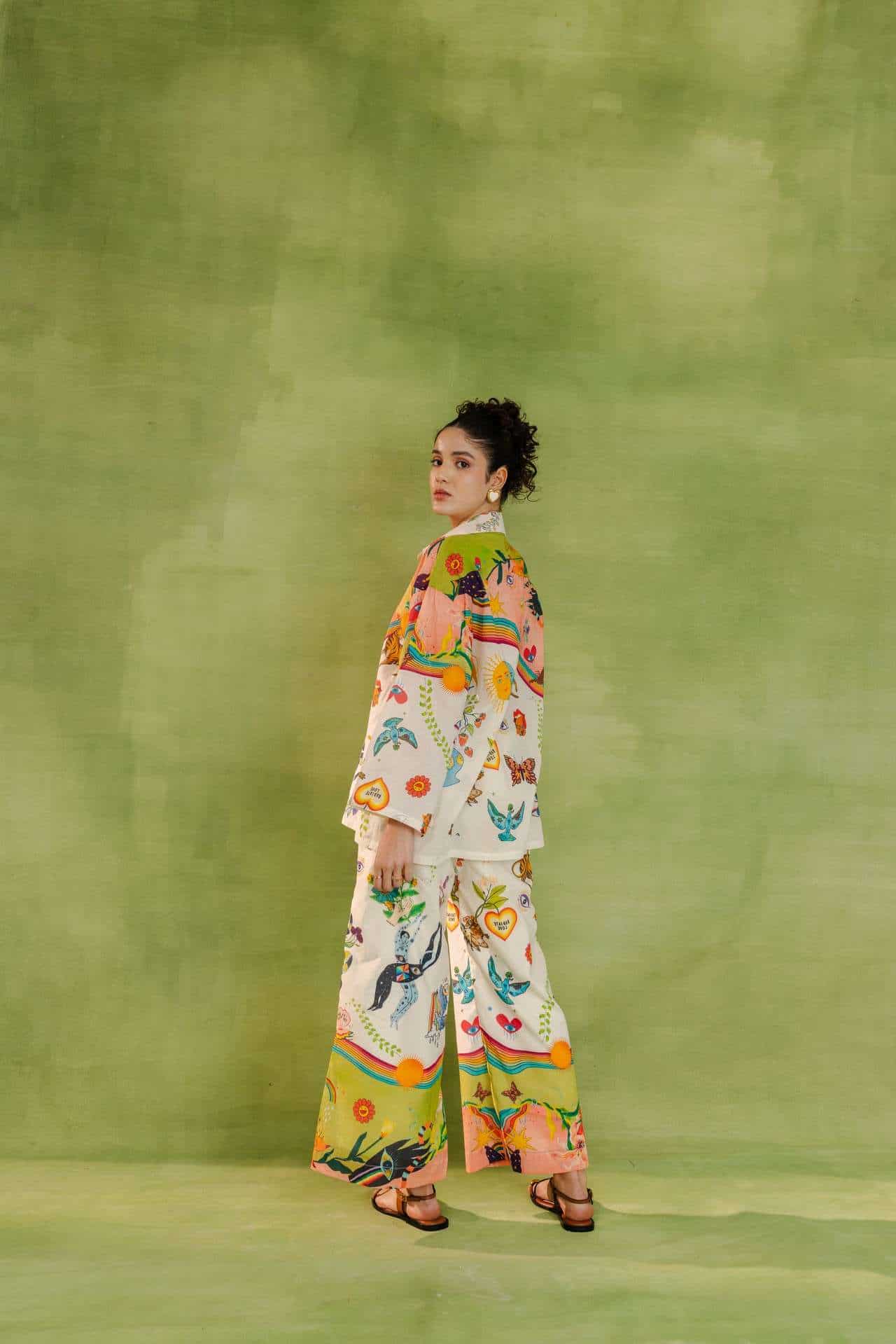 Relaxed-fit button-down shirt and wide-leg trousers featuring nature-inspired prints, abstract illustrations, and whimsical motifs.
