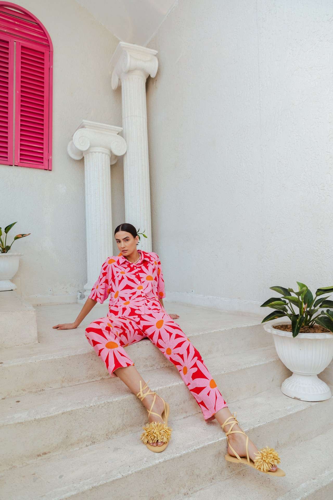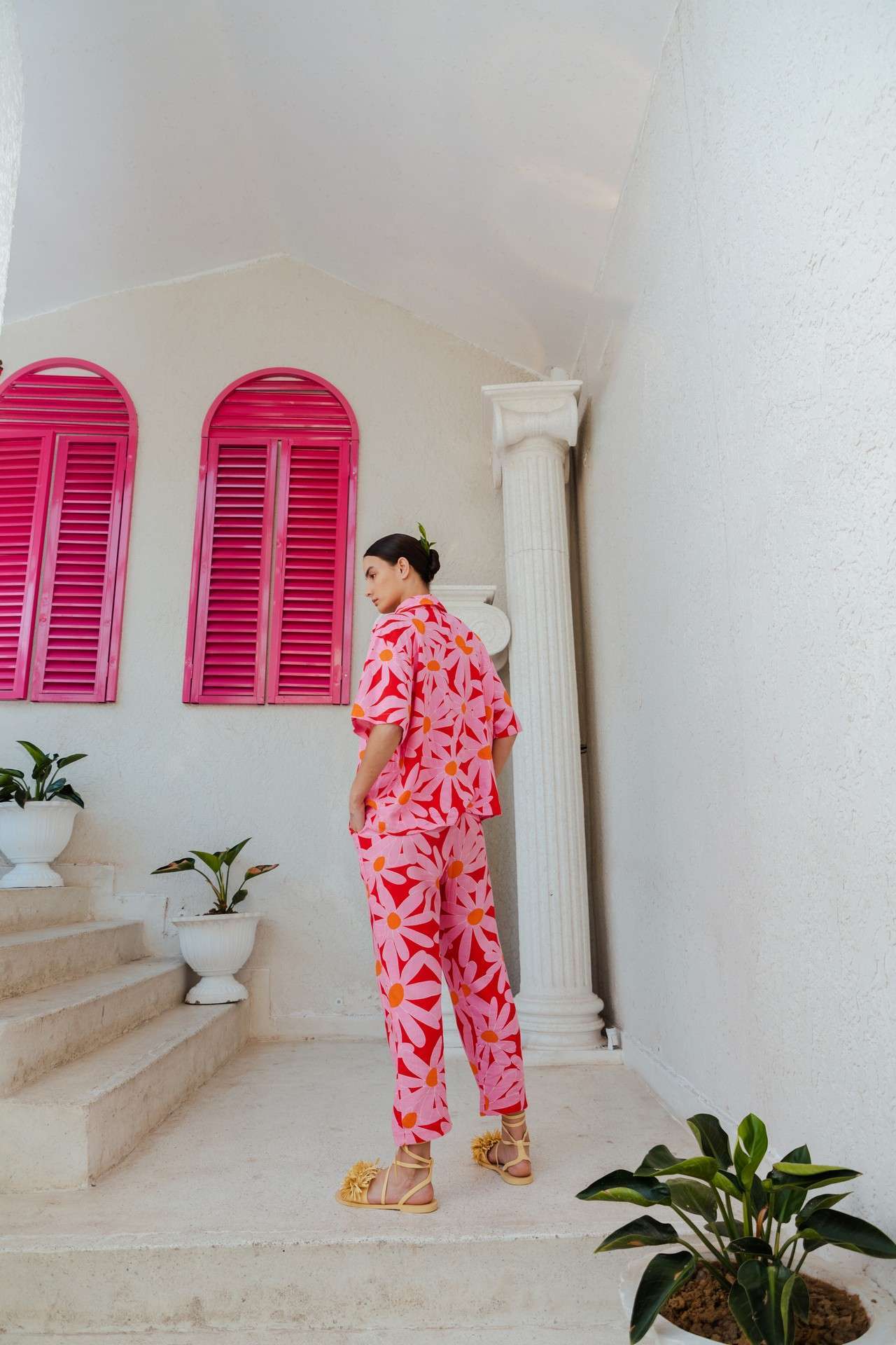 Relaxed-fit co-ord set with hand-printed fabric. Includes a loose buttoned shirt and ankle-length palazzo pants. Ideal for casual daytime or evening wear.