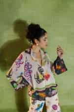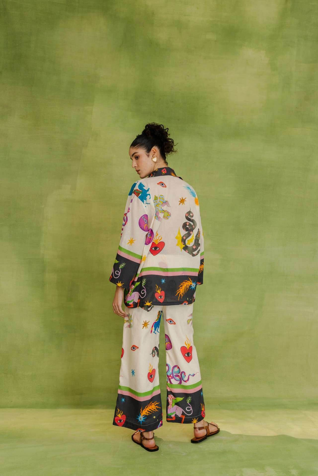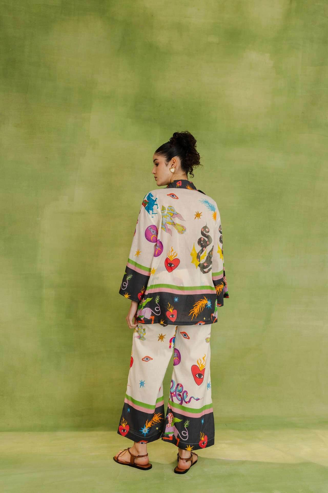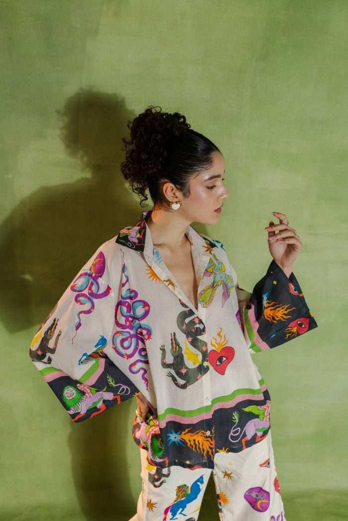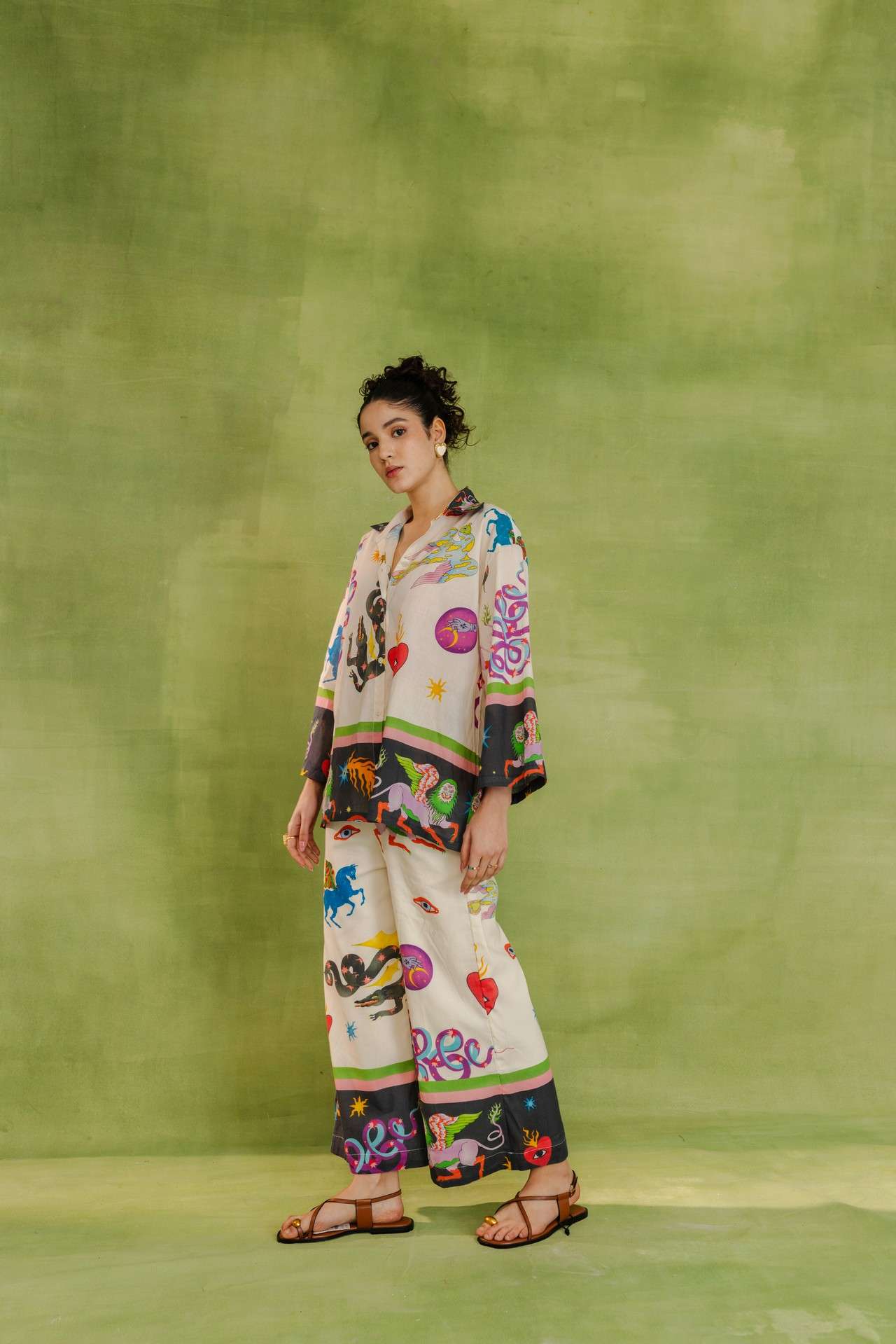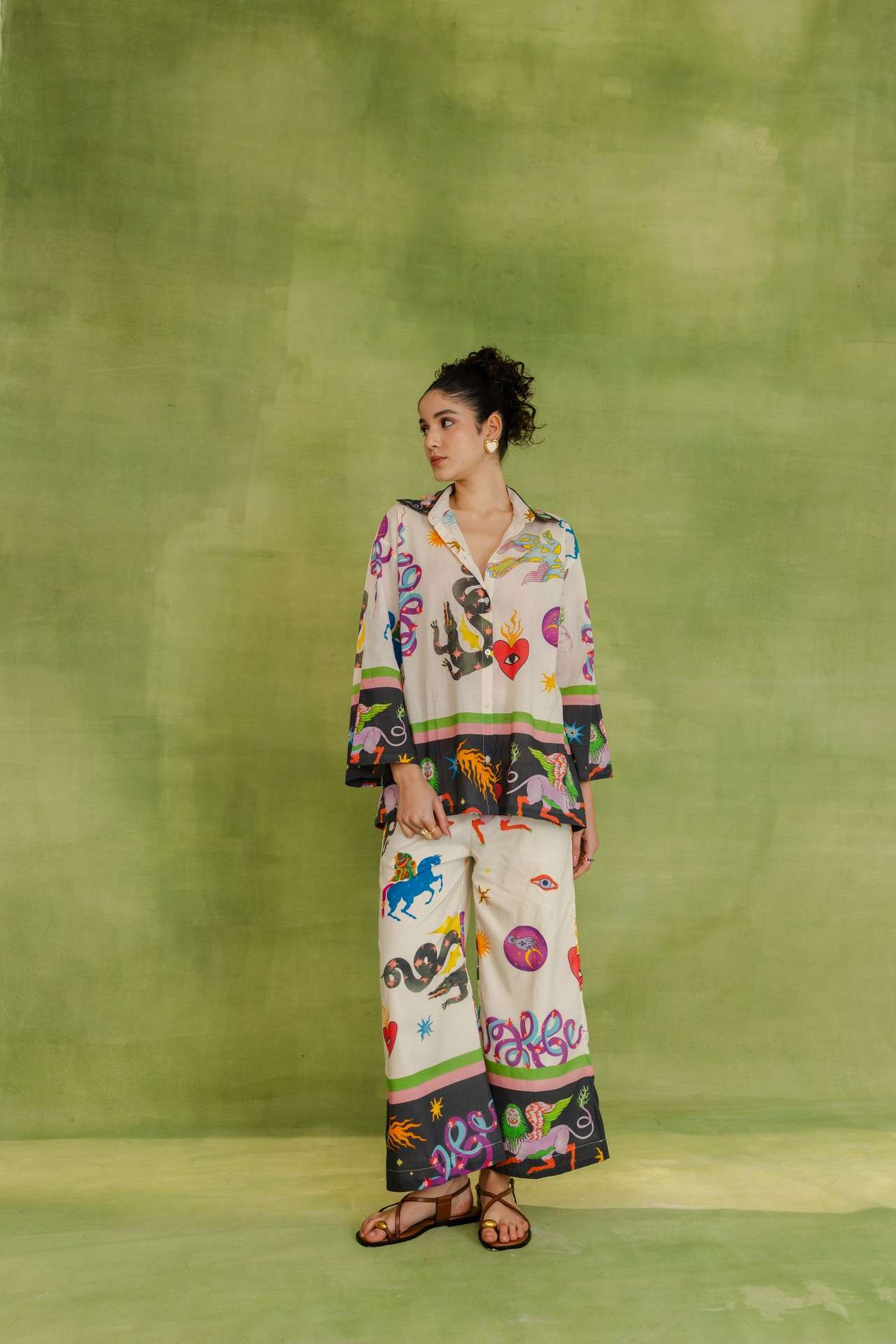 Electic Printed Co-ord Set featuring a relaxed-fit button-down shirt and wide-leg trousers. Adorned with vibrant surrealist prints of mythical creatures, hearts, flames, and celestial motifs. Contrasting deep-toned borders add definition to the neutral base.
