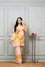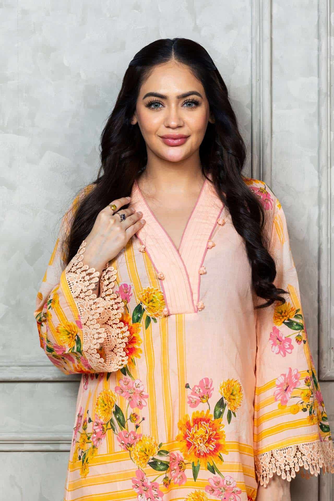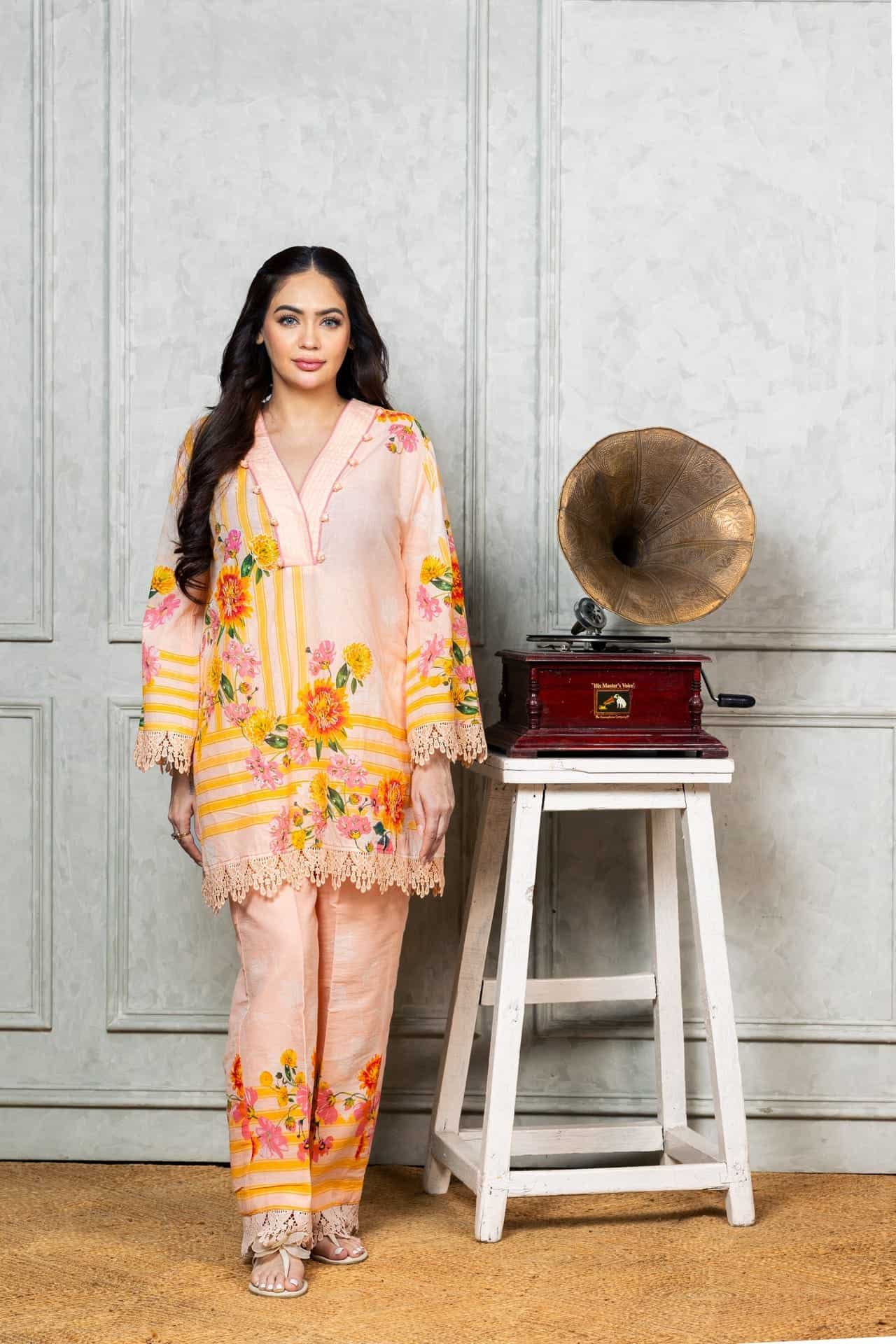 Step into summer with this stunning peach co-ord set! Featuring vibrant floral bouquets and warm yellow stripes, this breezy kurta is beautifully finished with intricate lace trims for an added touch of elegance. Paired perfectly with matching printed trousers, it’s the ultimate outfit to brighten your wardrobe and keep you cool in style.