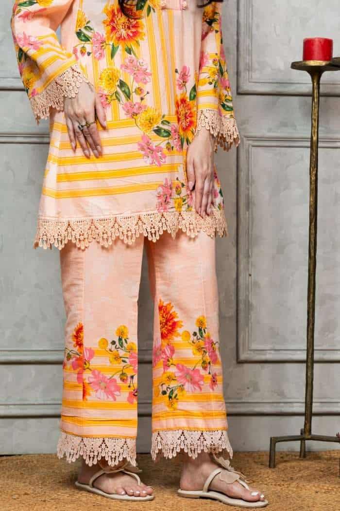 Peach co-ord set with straight kurta featuring yellow stripes and multicolor floral prints. Lace trimming on hem and sleeves. Matching trousers with the same print. Lightweight and breathable fabric.