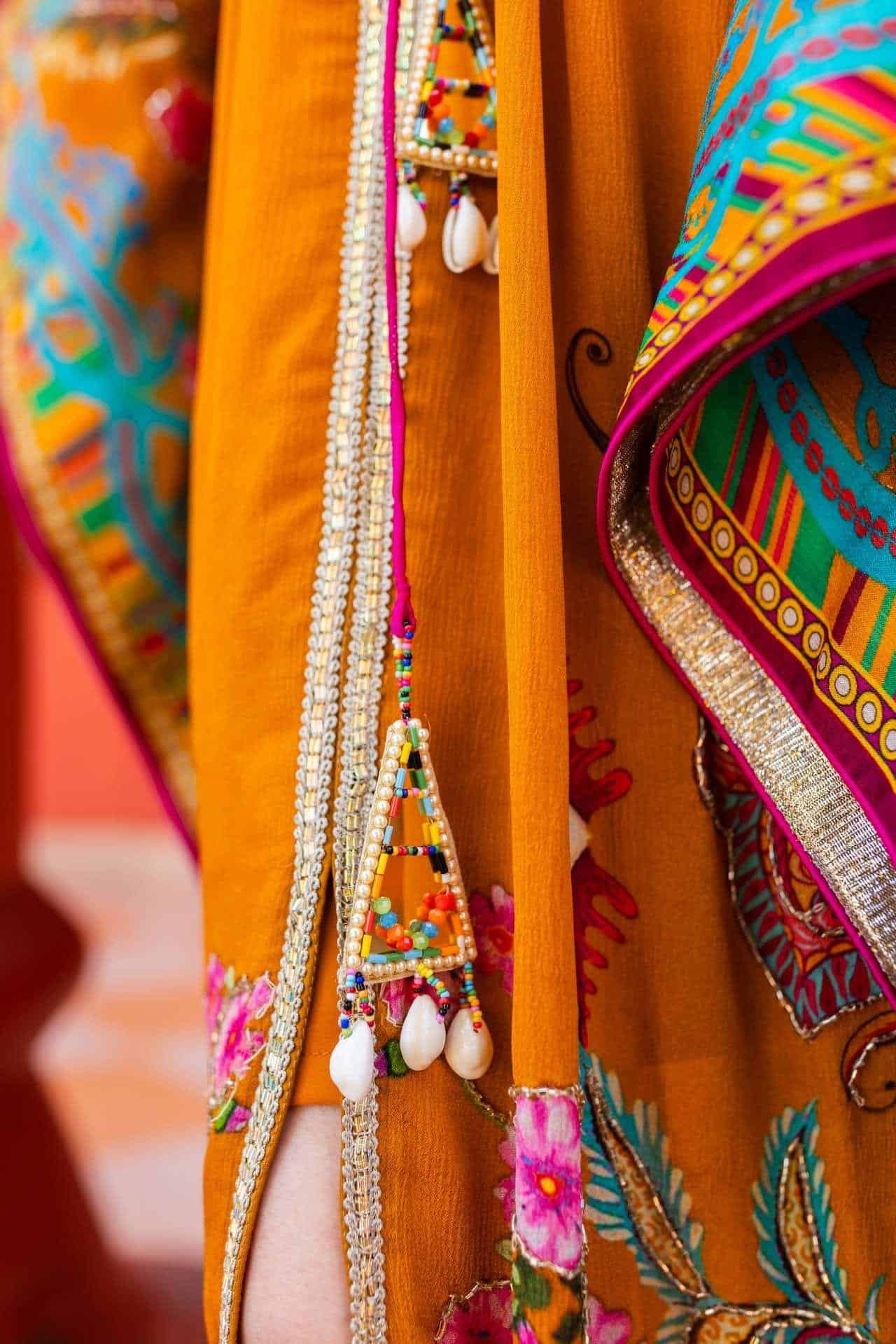 A one-piece stitched Chinon kaftan with hand embroidery on the print, lace-embellished V-neckline, hanging tassels, and an inner lining.