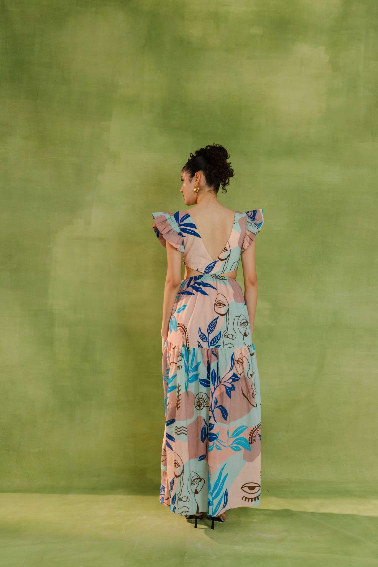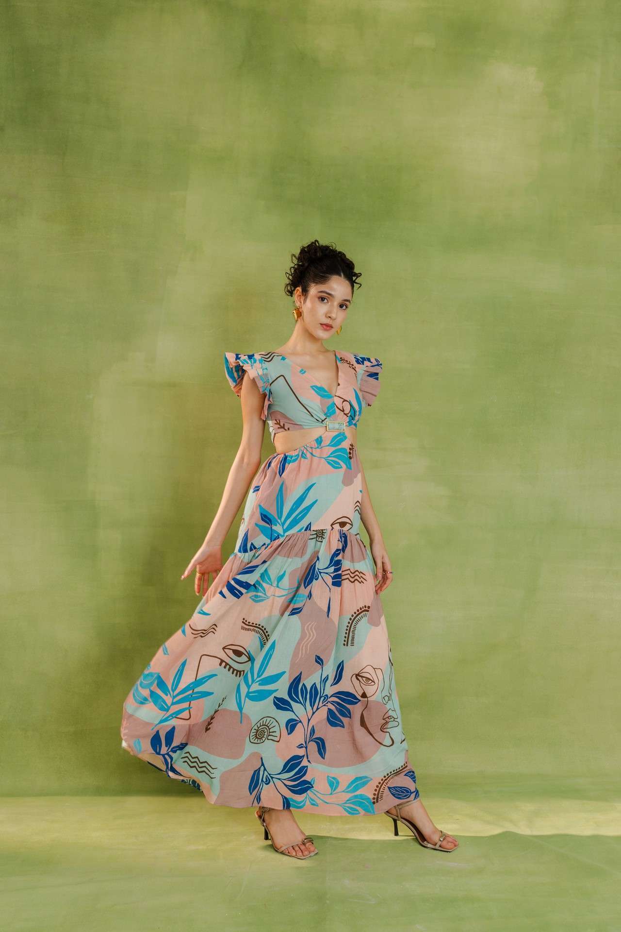 Bohemian floral maxi dress in soft peach with vintage-inspired patterns, fitted bodice, deep neckline, tiered skirt, and cut-out sleeves with contrasting fabric.