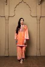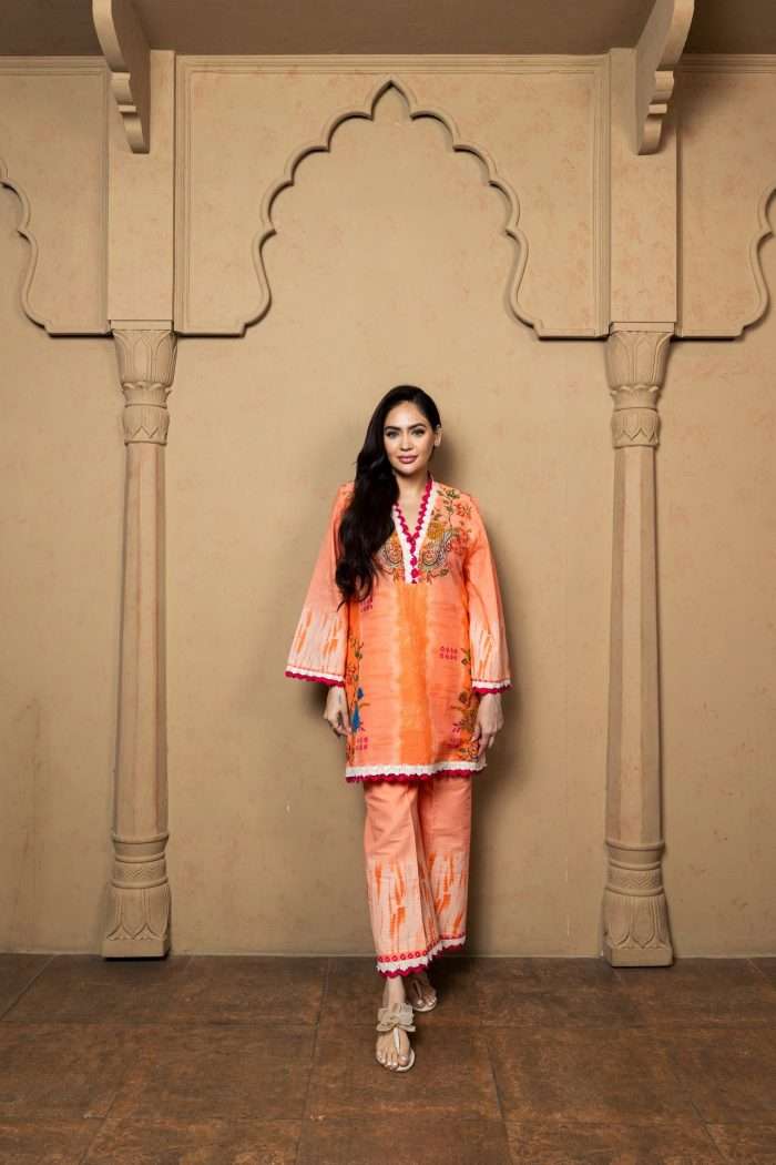 Illuminate your wardrobe with this elegant peach cotton kurta set, perfectly crafted for comfort and charm. Featuring intricate floral embroidery highlighted by vibrant blue and gold accents, subtle ethnic motifs, and a playful tie-dye effect, this kurta is a true standout. Delicate lace trims on the sleeves, hem, and neckline add a feminine touch, while the straight-cut pants reflect the soft patterns and matching lace, completing the graceful ensemble.