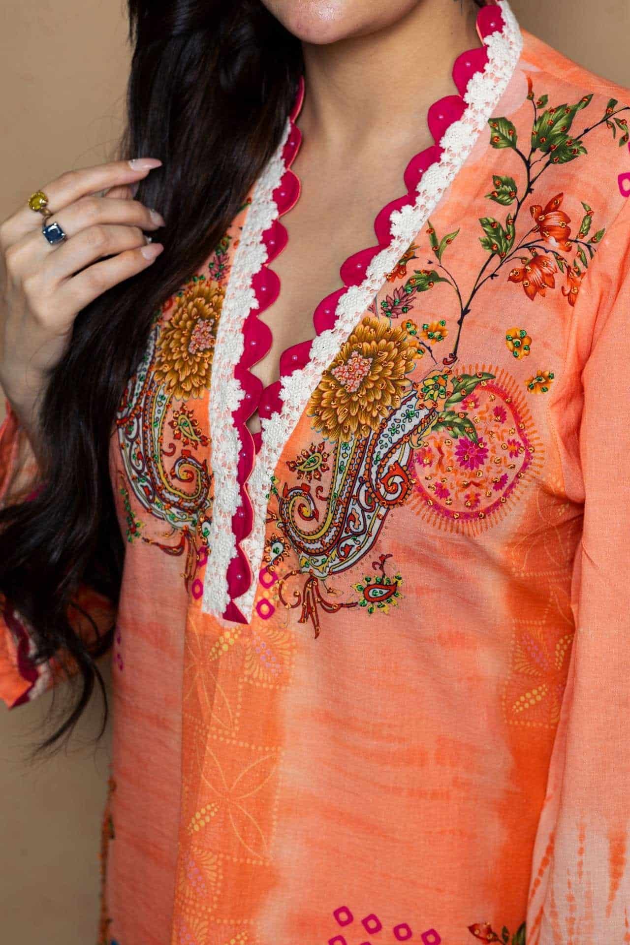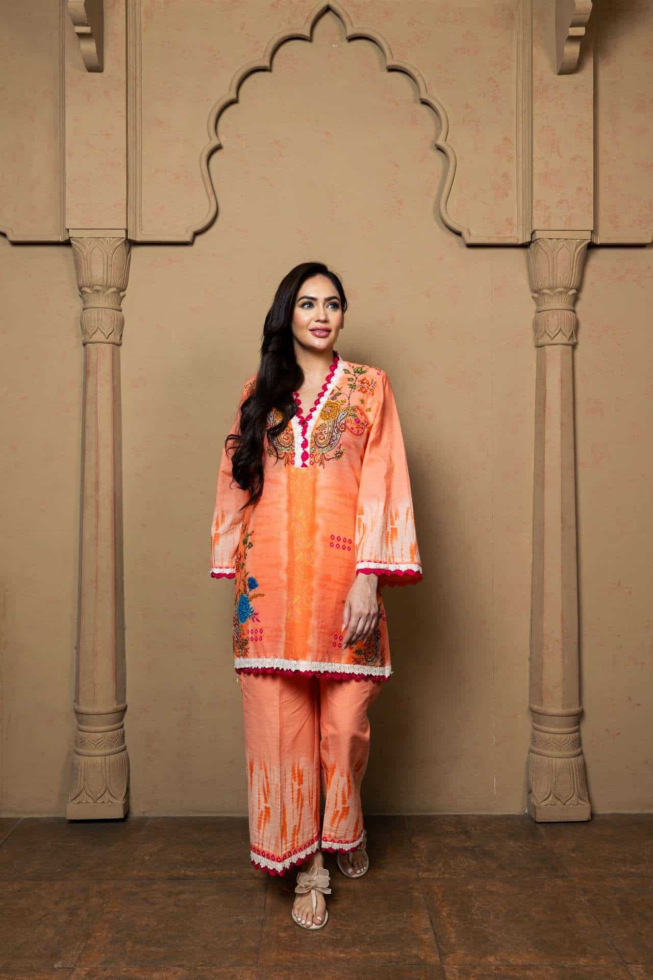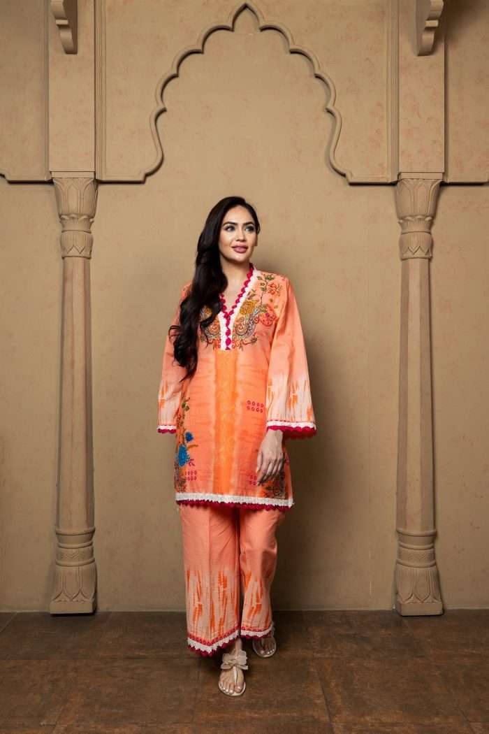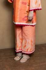 Brighten your wardrobe with this peach cotton kurta set designed for comfort and style. The kurta features intricate floral embroidery with blue and gold accents, subtle ethnic motifs, and a tie-dye effect. Lace trim decorates the sleeves, hem, and neckline. Straight-cut pants carry the same soft pattern and matching lace details.