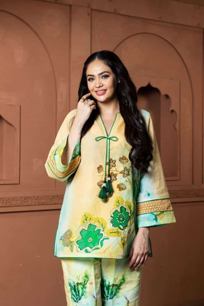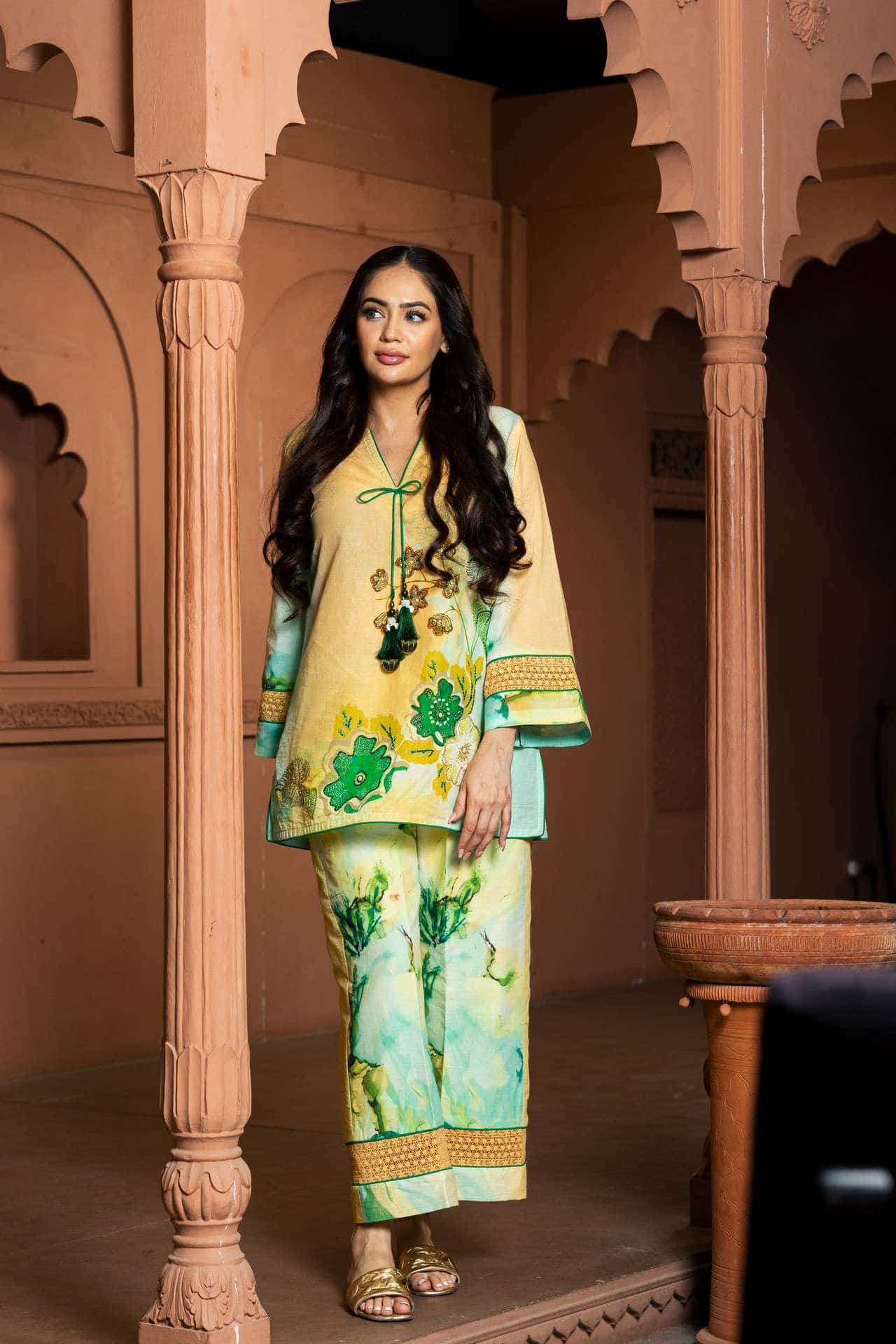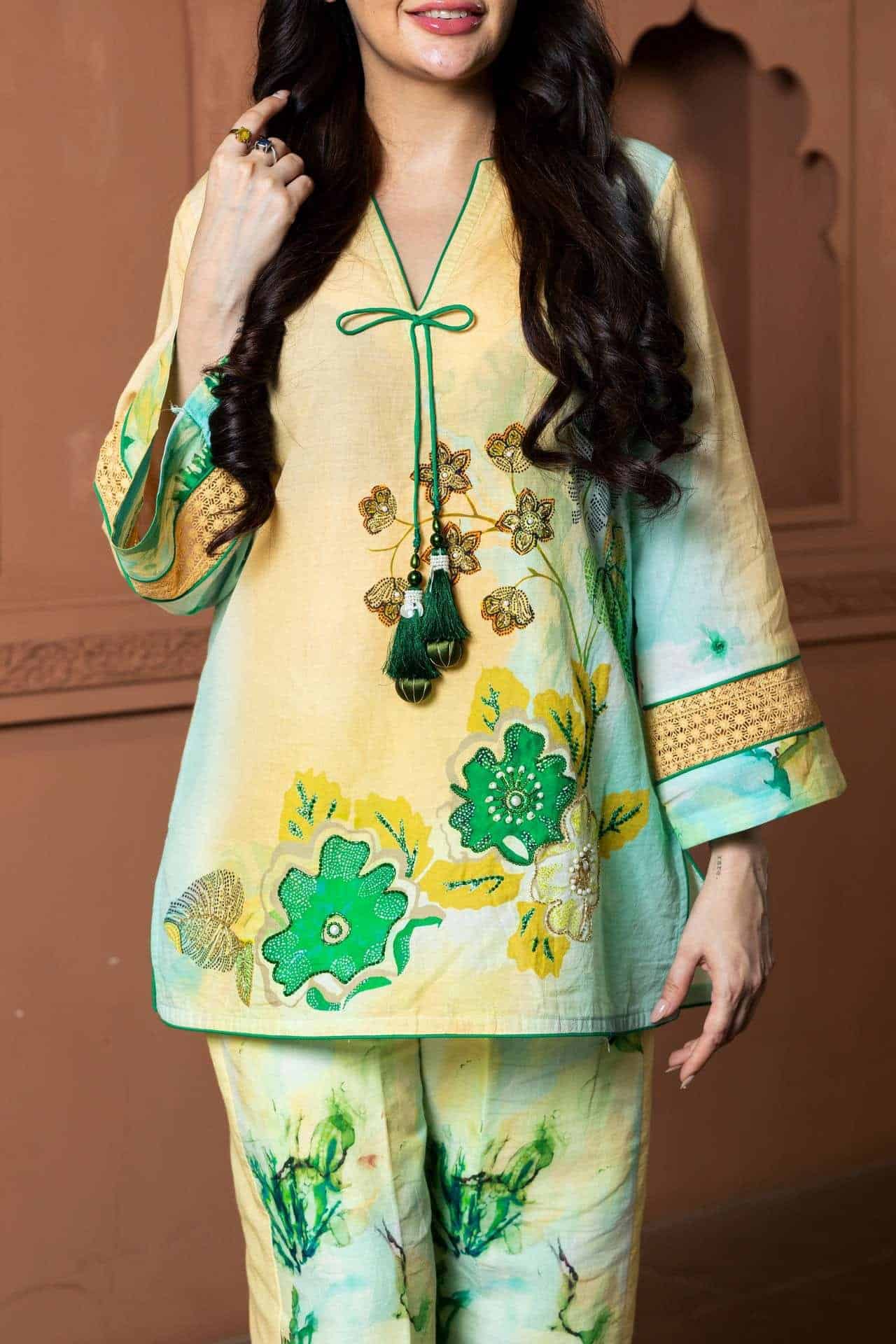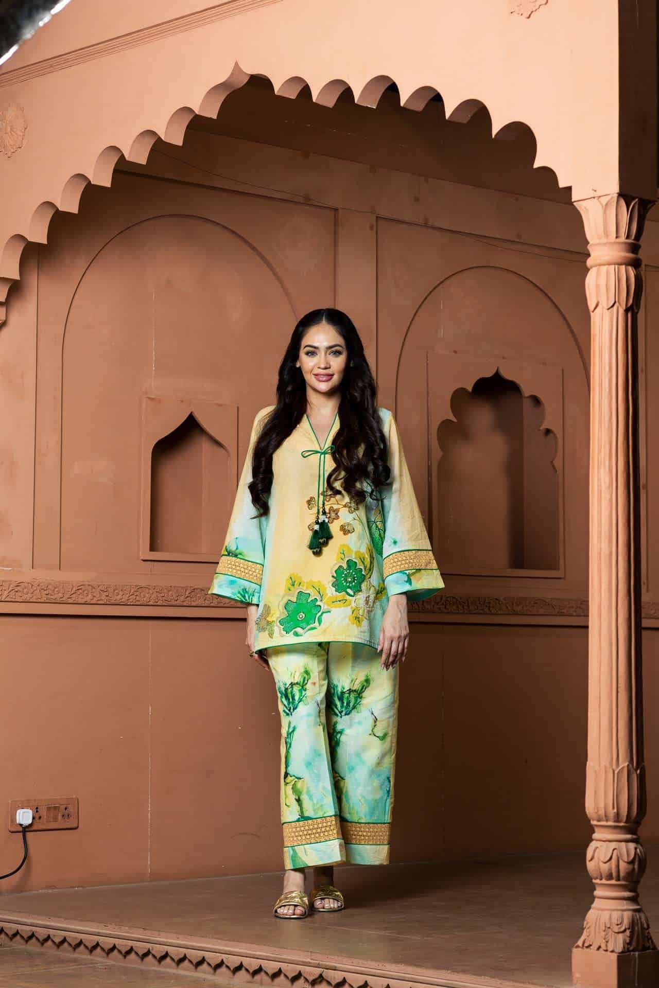 This lemon-yellow and mint-green kurta set features a relaxed-fit tunic with digitally printed botanical designs in green and gold-printed borders on sleeves and pants. It has a tie-up neckline with green tassels and watercolor-inspired pants for a fresh and comfortable look.