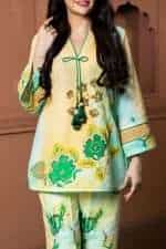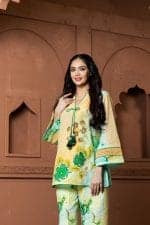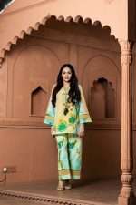 Step into sunshine and serenity with this vibrant lemon-yellow and mint-green kurta set. Featuring digitally printed botanical artwork and elegant gold borders, this relaxed-fit ensemble balances ethnic charm with modern freshness. The playful tie-up neckline with green tassels and watercolor-inspired pants create a stylish, breezy look—perfect for elevating your ethnic wardrobe this season.