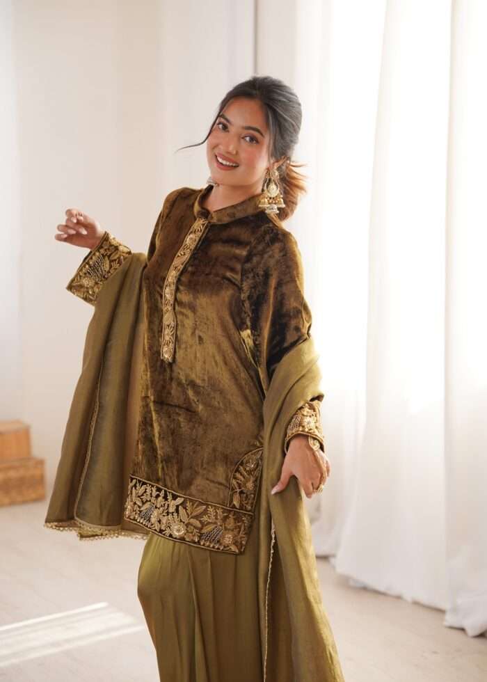 An ode to regal winter elegance, this exquisite three-piece set is crafted in rich premium velvet and paired with flowing satin Farshi salwar pants for a graceful, heritage-inspired silhouette. The straight velvet kurta is adorned with intricate thread hand embroidery along the neckline, sleeves, and hem, showcasing refined artisanal craftsmanship in every detail.Completing the ensemble is a soft, fluid dupatta finished with delicate edging that adds movement and softness to the structured velvet.