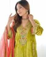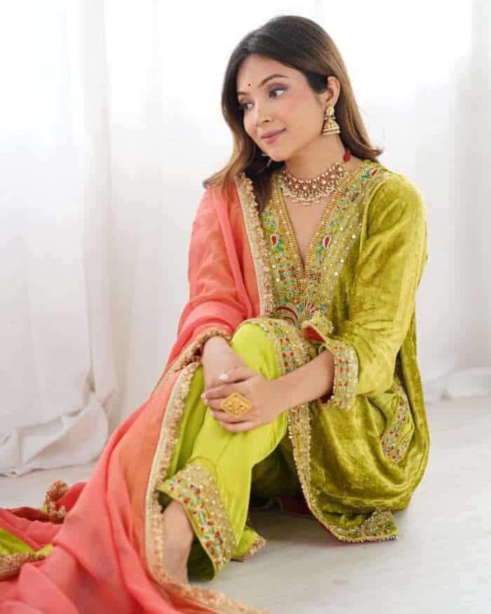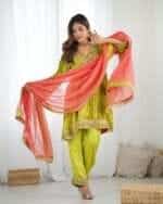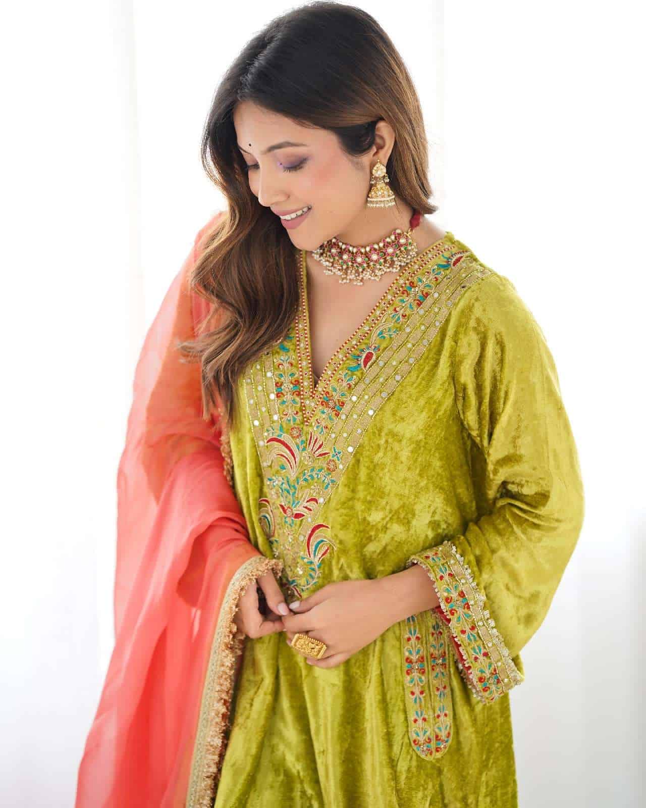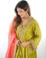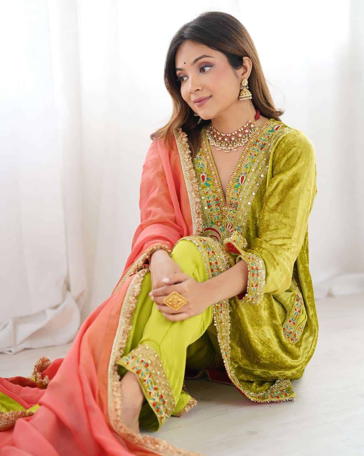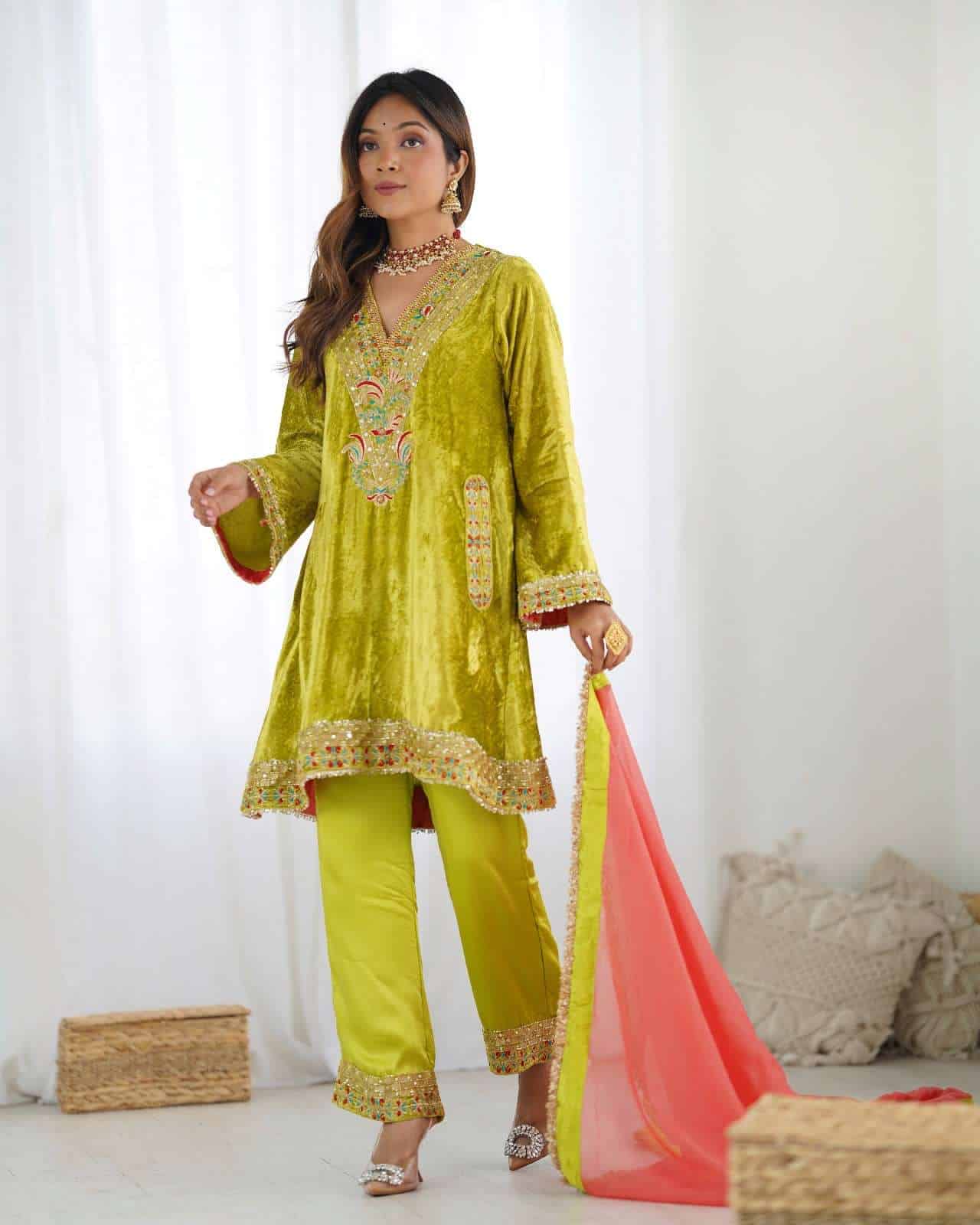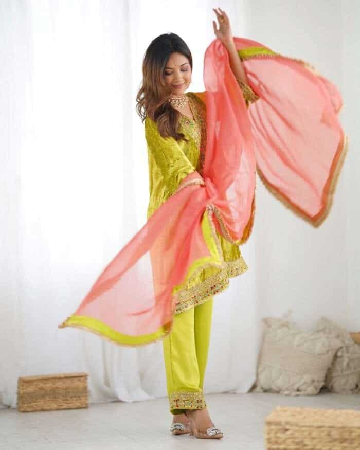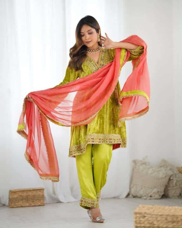 Kurta : Parrot green velvet kurta with handwork detailing