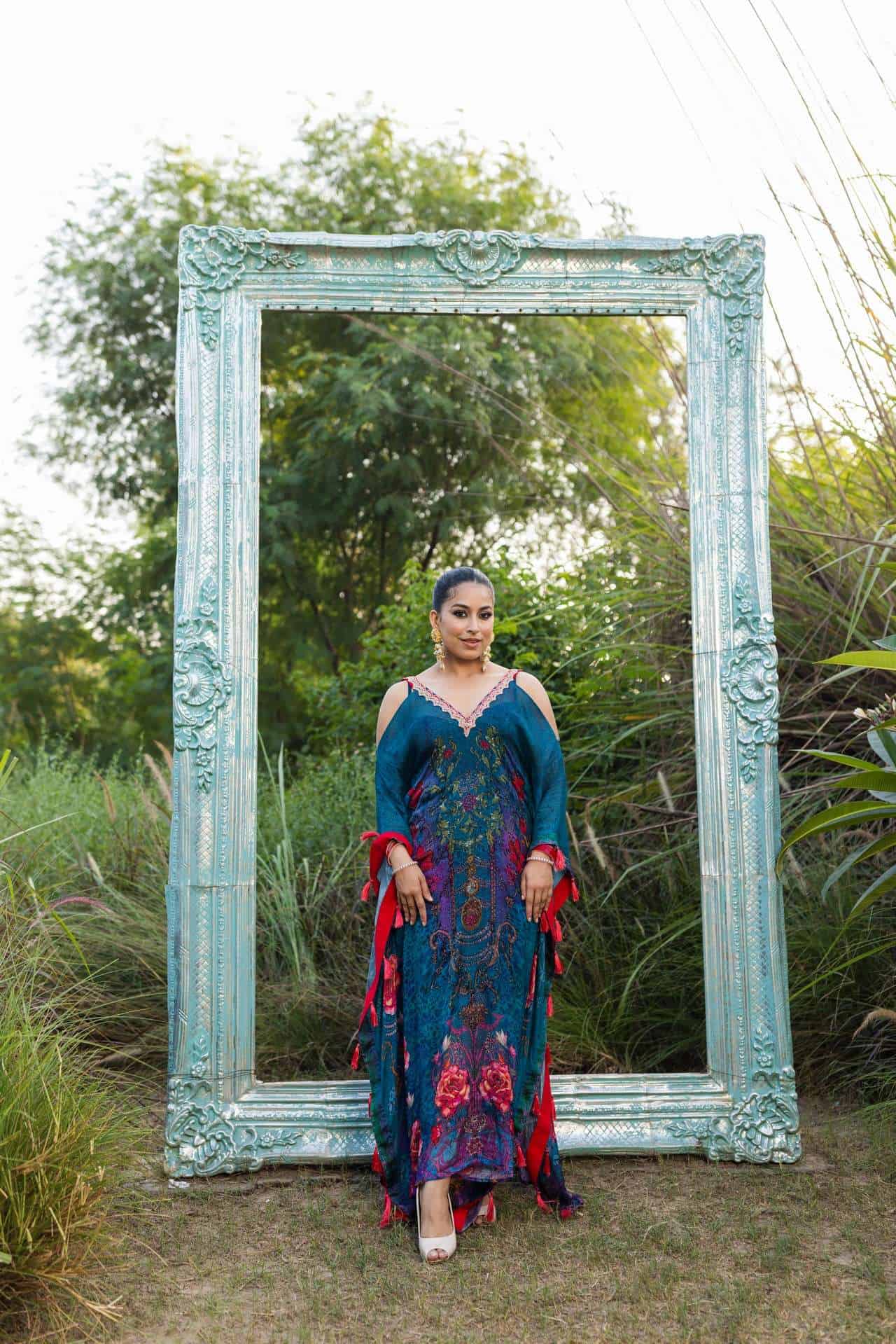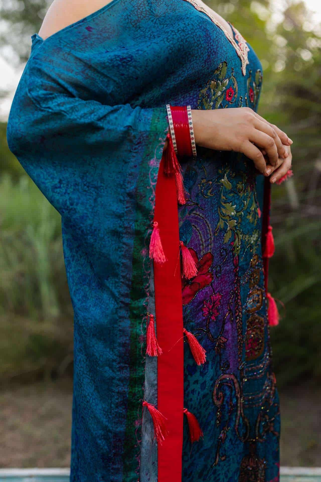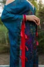 This Chinon kaftan features hand-printed designs, a V-neckline embellished with lace and hanging tassels. It is a one-piece stitched kaftan with an inner lining.