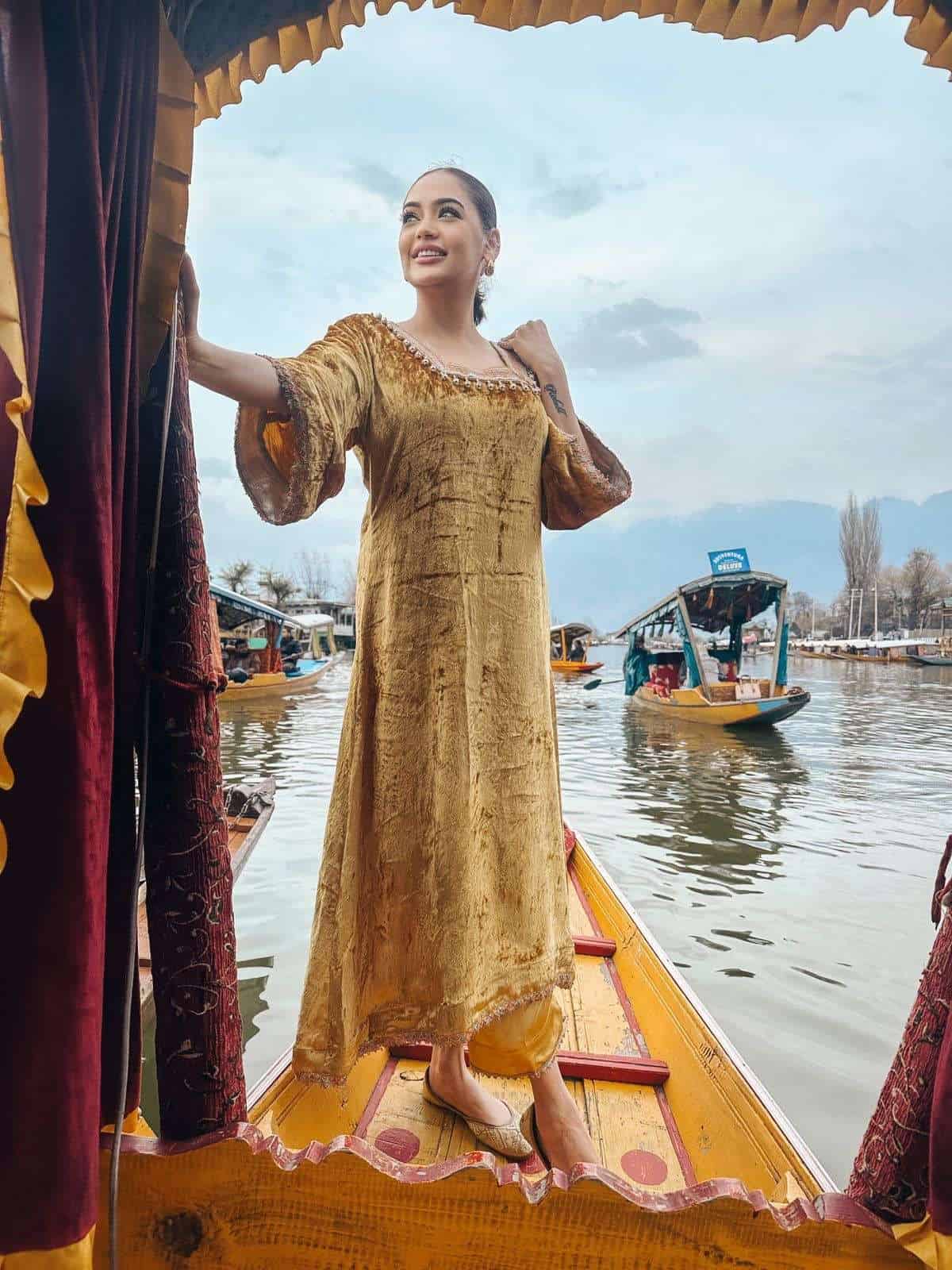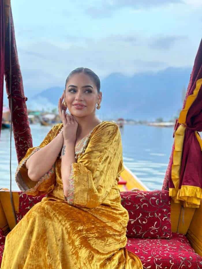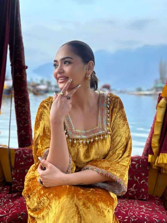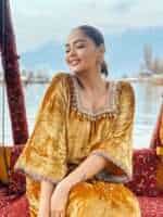 Our contemporary yet classic mustard yellow kurta set features detailed work on the neckline and sleeves. It is paired with a mustard yellow gajji silk velvet palazzo.