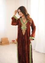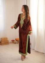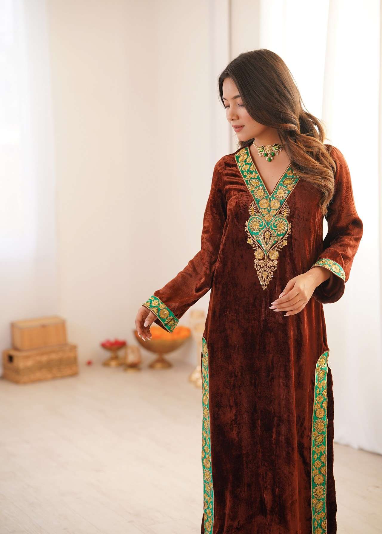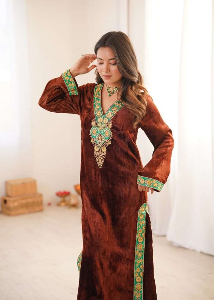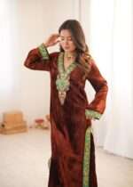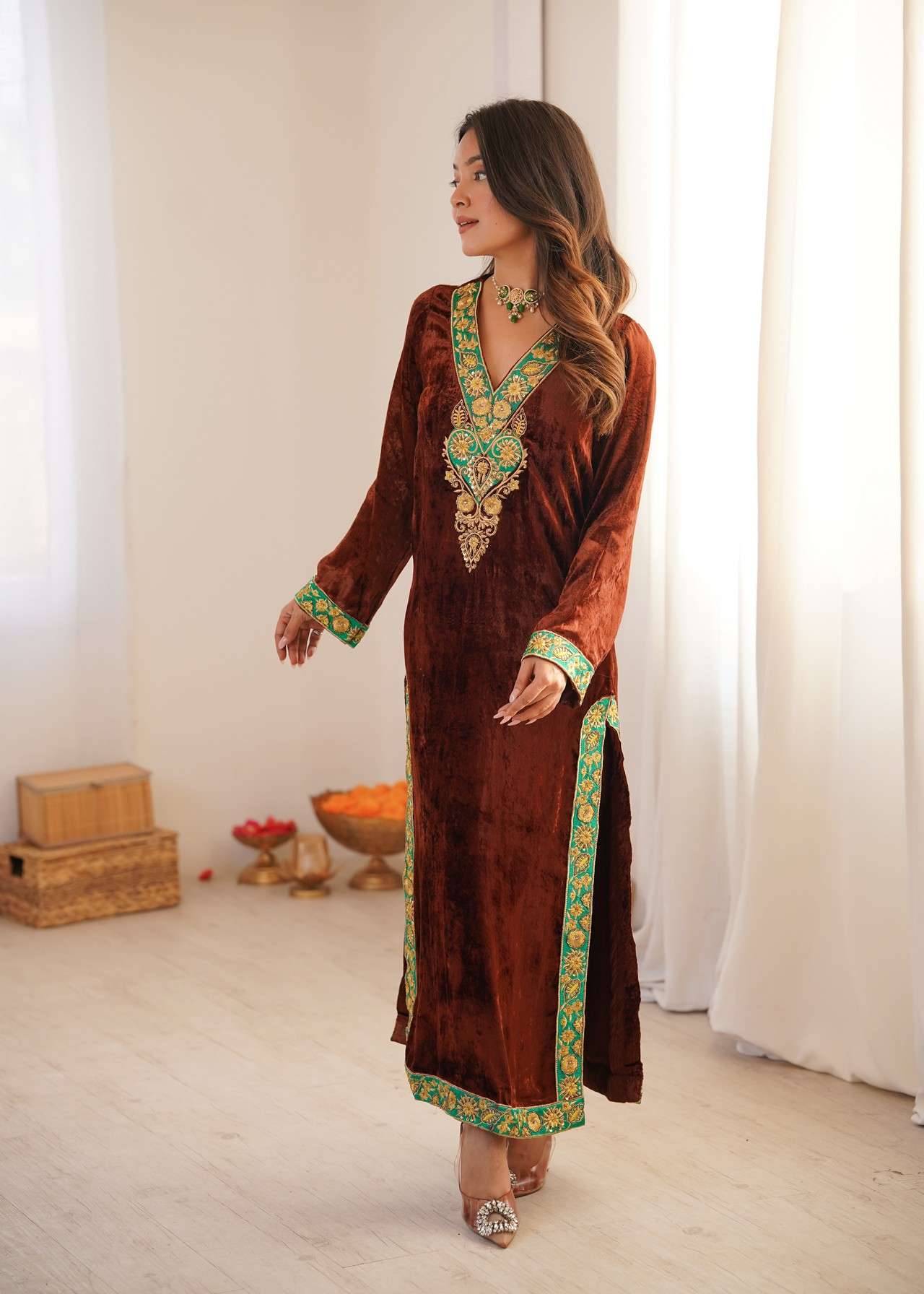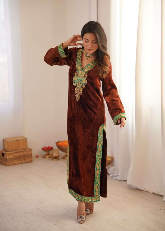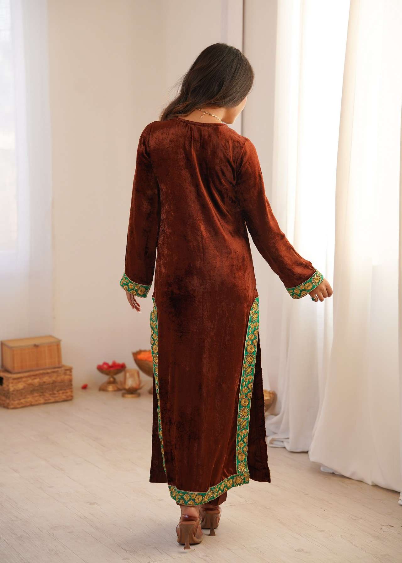Refined blend of richness and elegance, this long velvet kurta is crafted in plush winter velvet, designed to make quiet yet powerful statements. The neckline is adorned with intricate hand-embroidered detailing in contrast tones, adding depth, heritage charm, and festive brilliance to the silhouette. Delicate borders along the sleeves and side slits elevate the overall craftsmanship. Paired with smooth, straight-fit satin pants, the ensemble balances structure with fluid movement—making it effortless to wear from day festivities to evening celebrations.