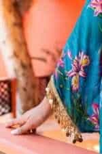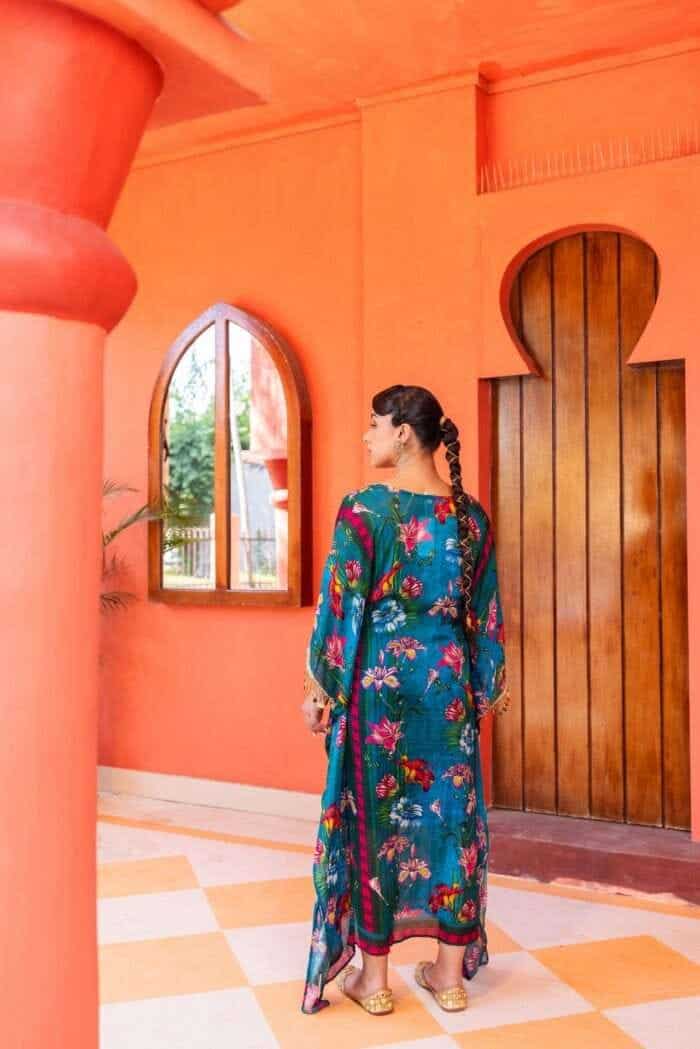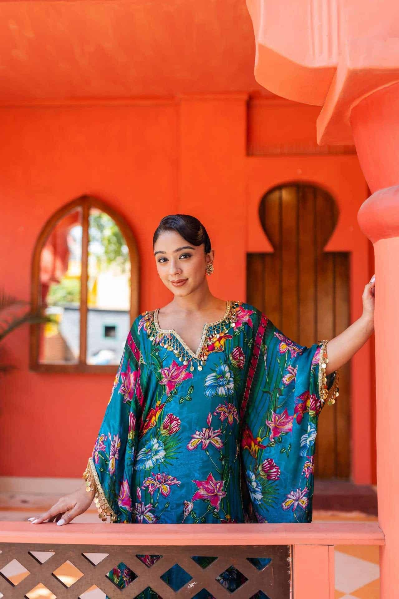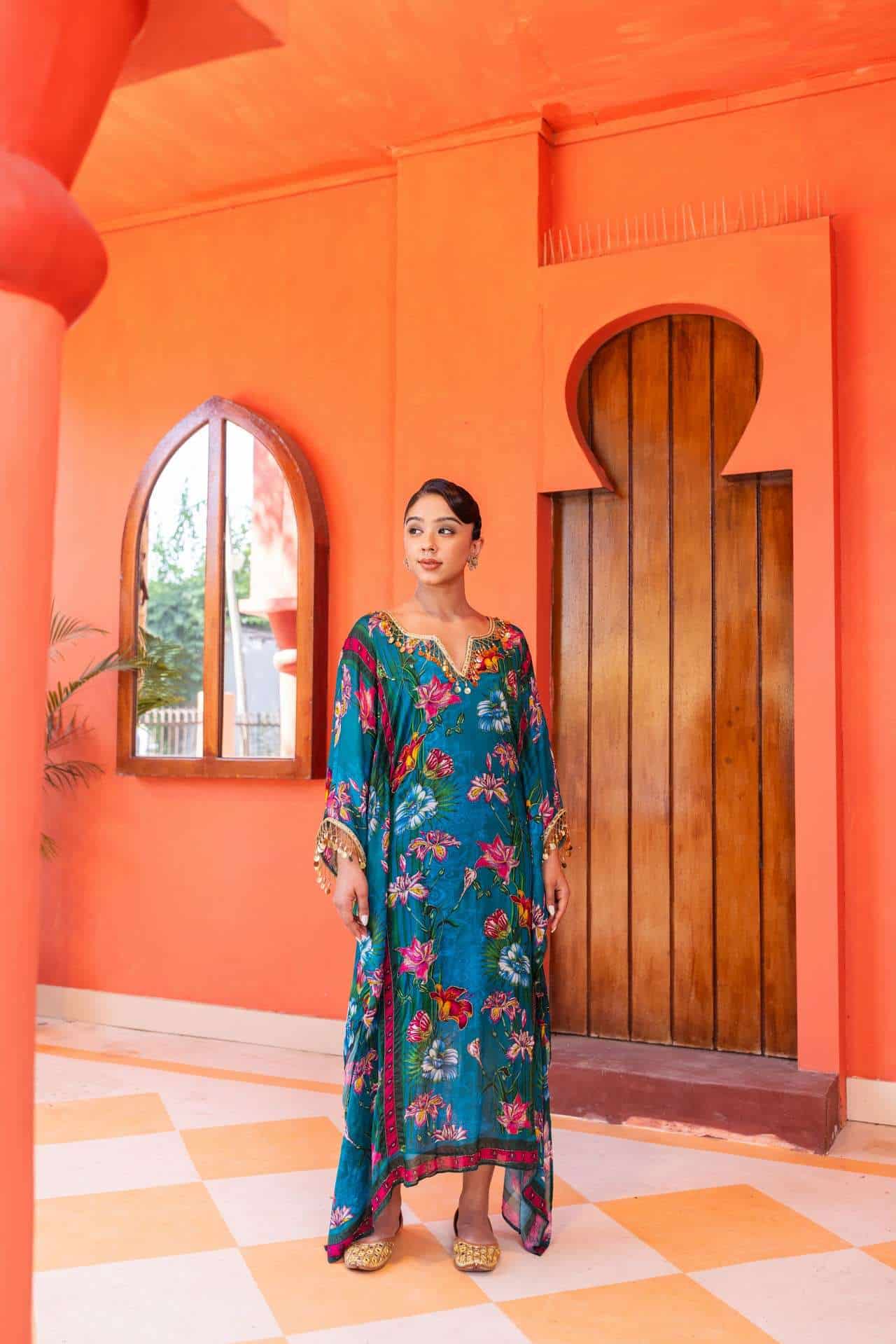 Effortlessly elegant, this Chinon kaftan showcases intricate handwork over a printed base. The V-neckline is adorned with delicate lace and playful tassels, while the one-piece design includes a stitched inner for added comfort. A perfect blend of tradition and modern charm.