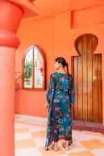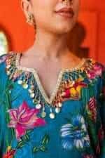 Decollete neck with Coin Detailing, Cutdana Hand work to Enhance Print on front panel, neck length 9, length 55, comes with slip