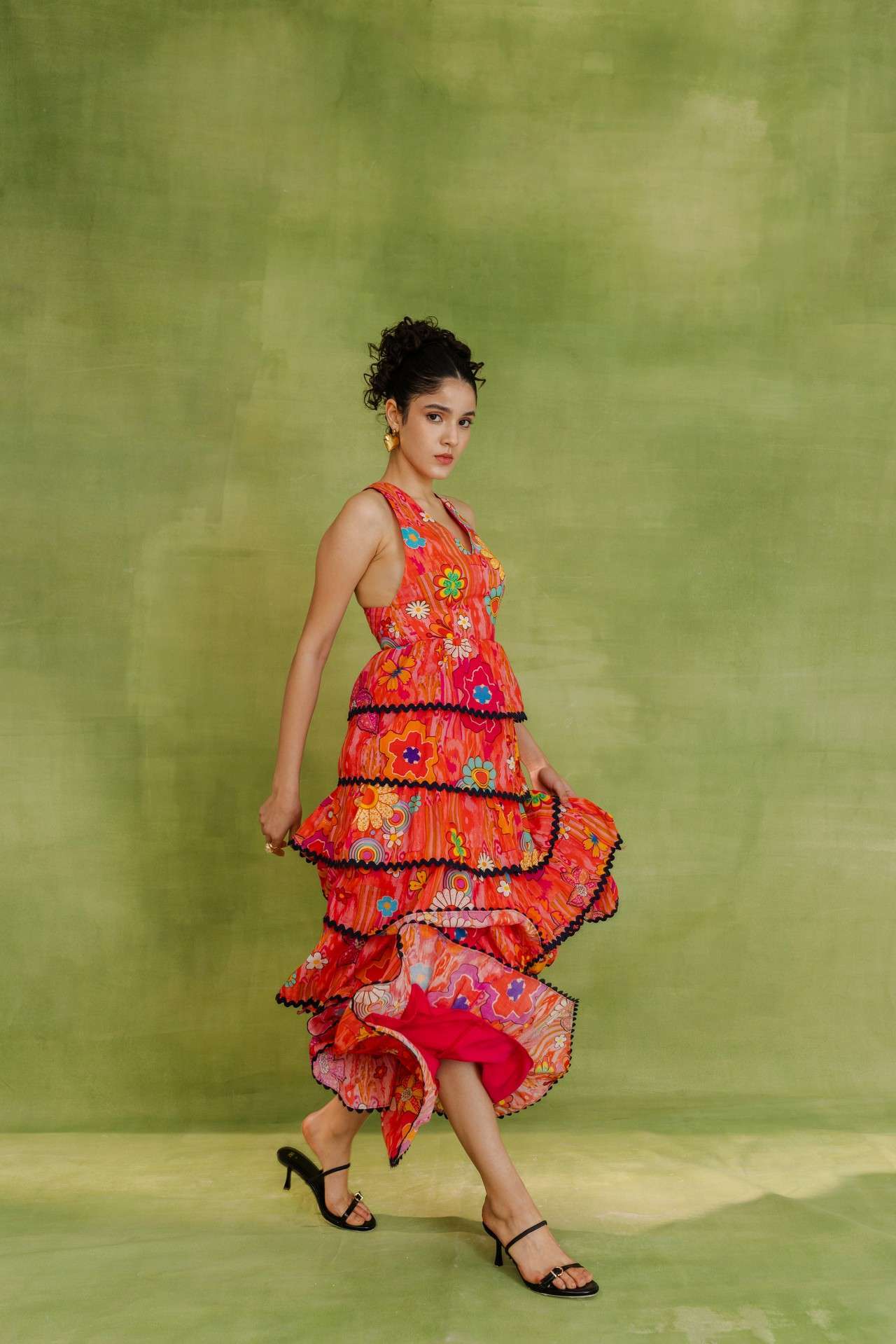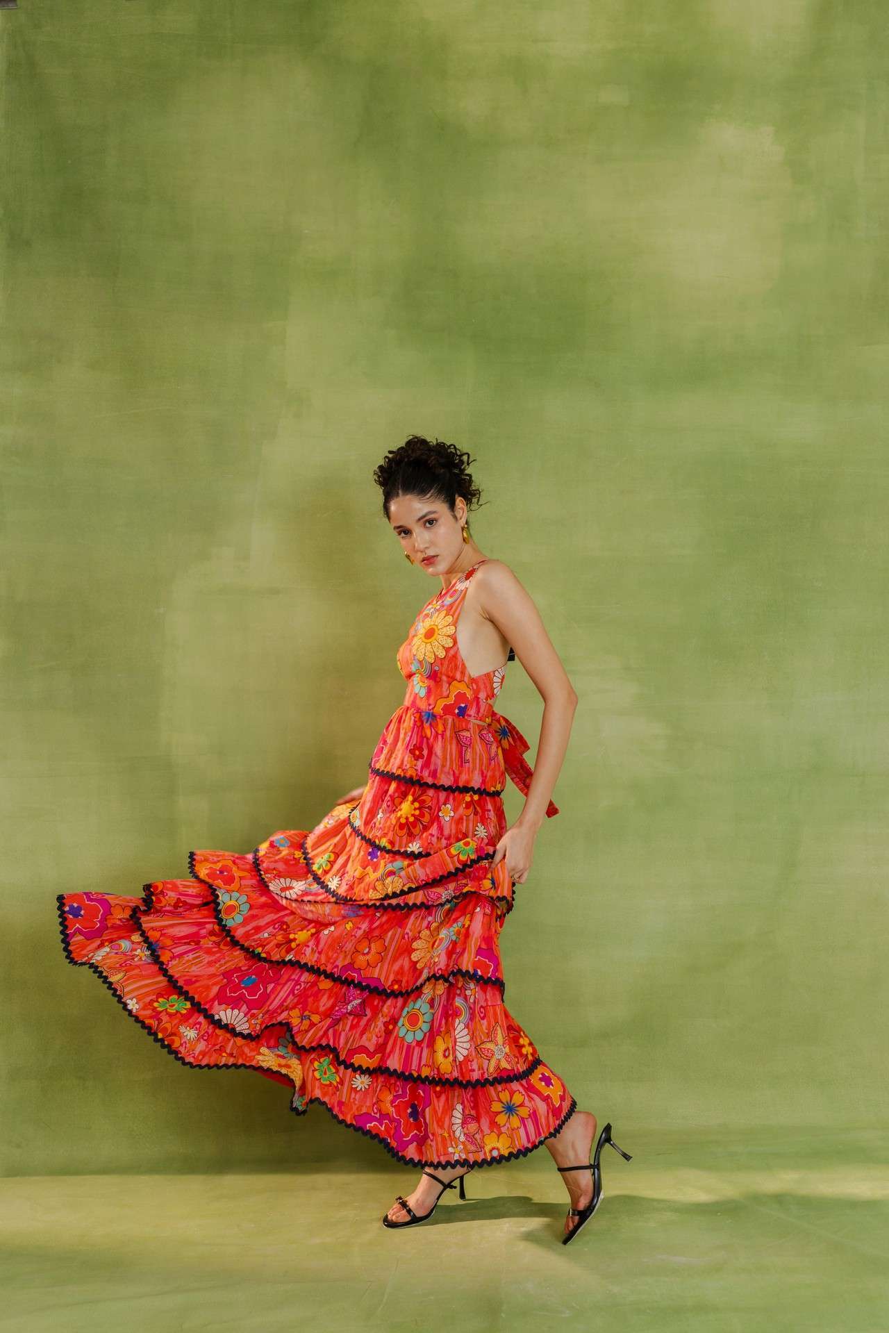 Sleeveless maxi dress with bold floral print in orange, pink, and yellow. Features tiered layers with black lace trim, deep V-neckline, and fitted bodice for a flattering silhouette.