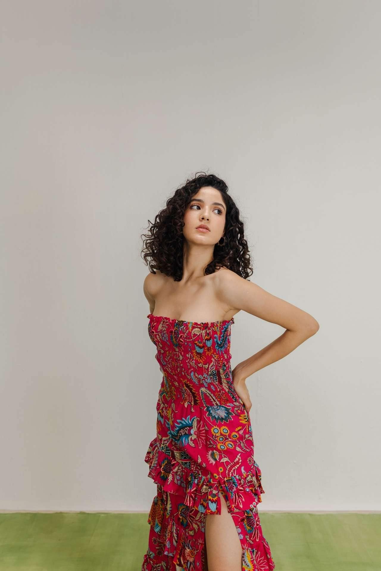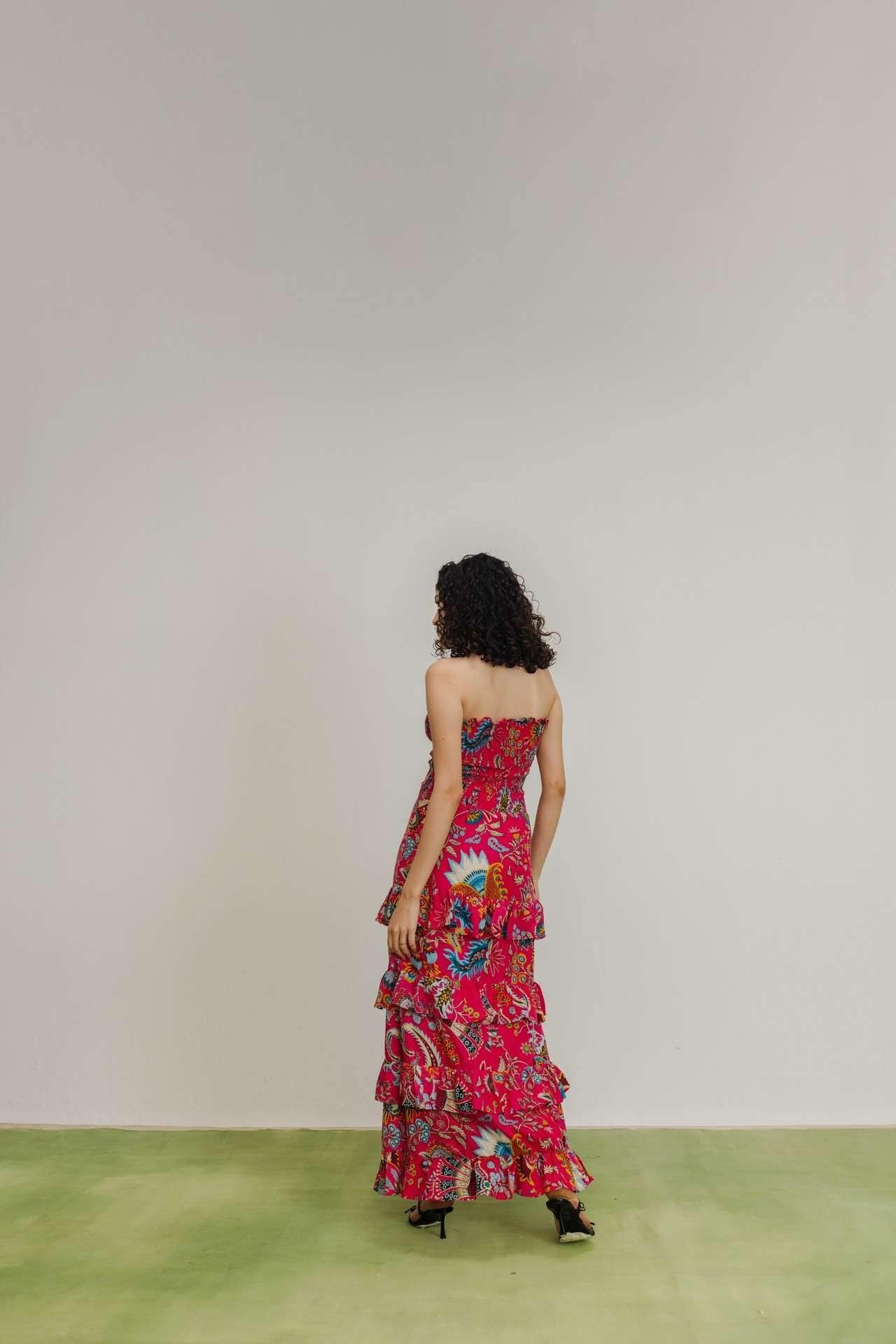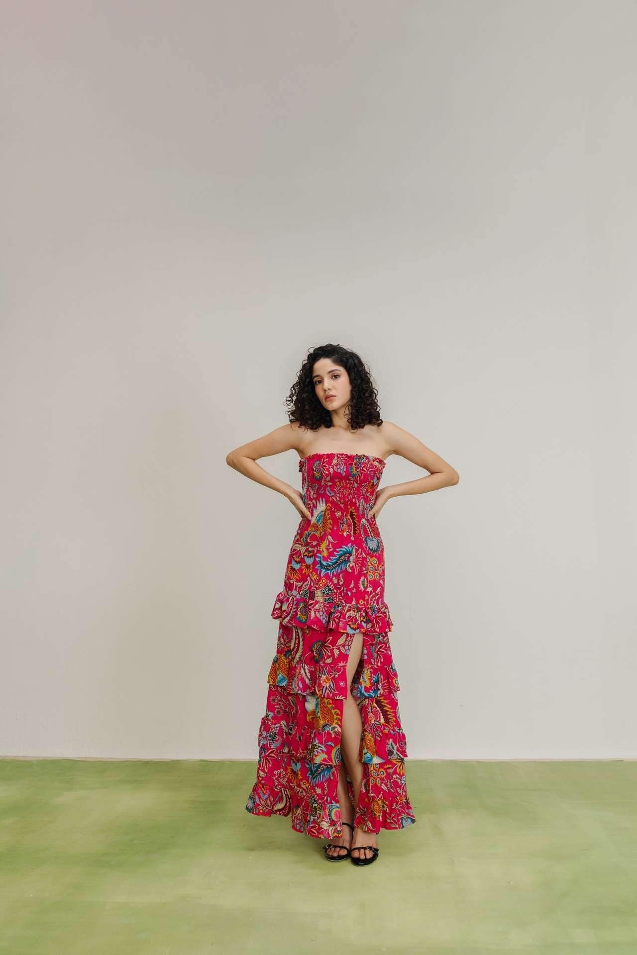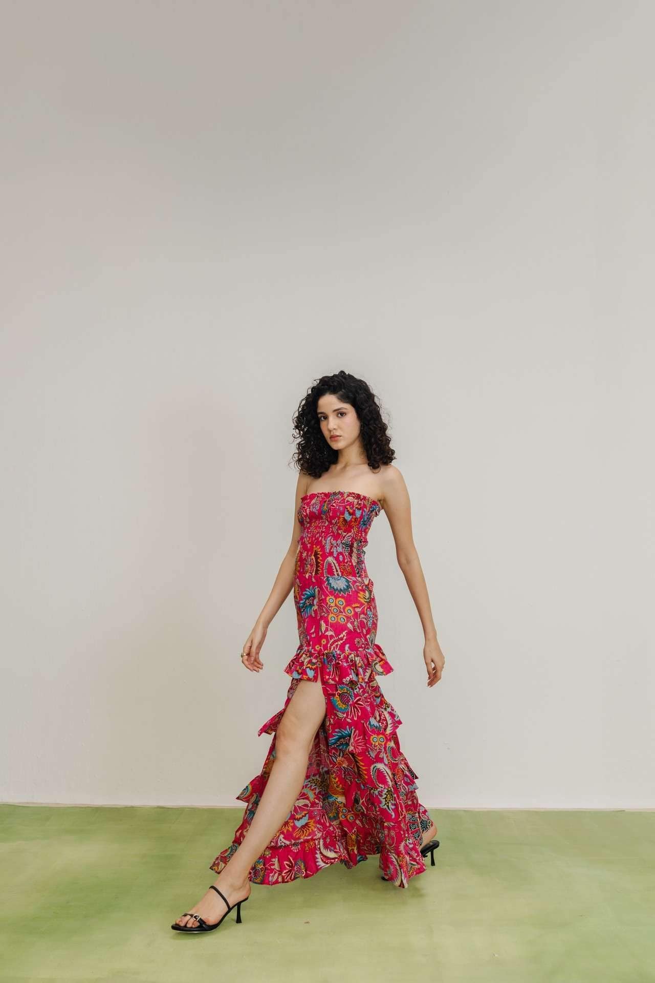 Strapless Bohemian maxi dress with a smocked bodice for comfort and fit. Features cascading ruffle tiers with paisley-inspired print and a high slit. Suitable for vacations, beach dinners, or summer events.
