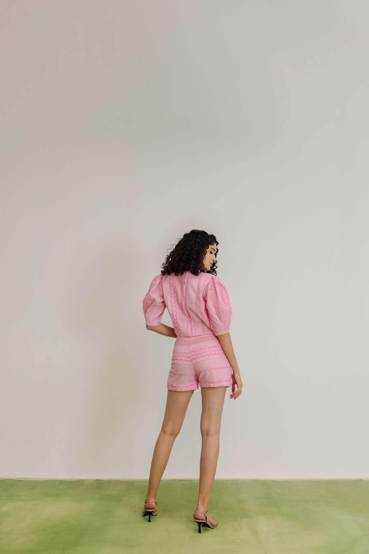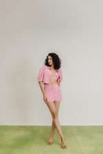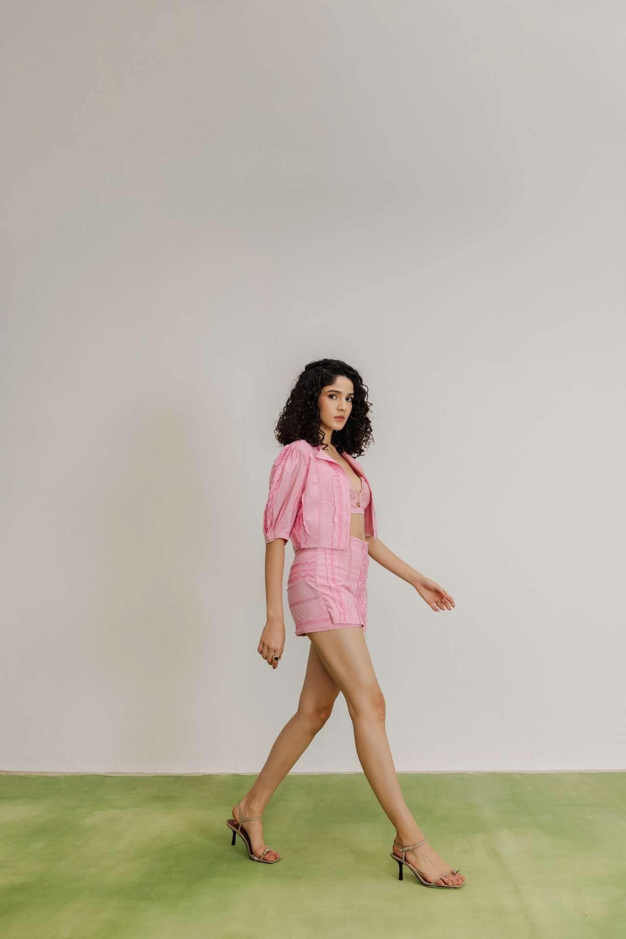 Blush pink three-piece co-ord set comprising a cropped jacket with puffed sleeves and front clasp, a bralette with a statement buckle, and a high-waisted mini skirt with textured patterns.