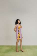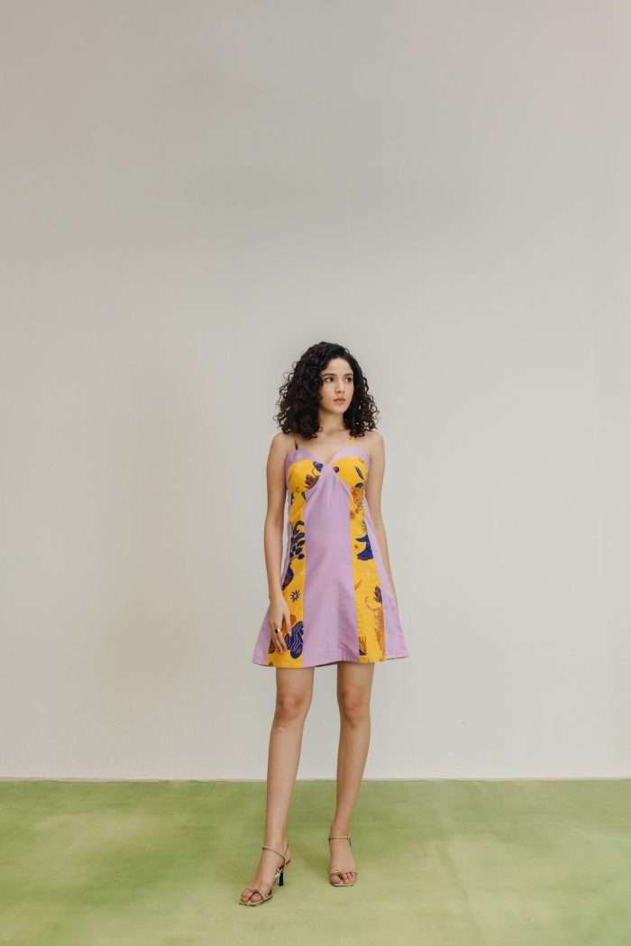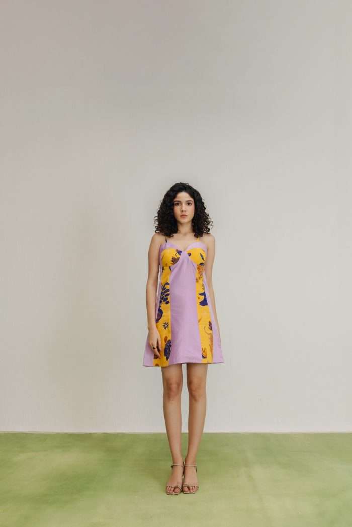 An A-line mini dress featuring lilac and mustard color-blocking with bold prints. It has soft draping at the bust with a central knot detail and a comfortable A-line silhouette.