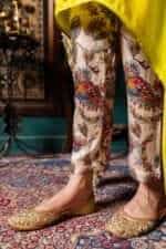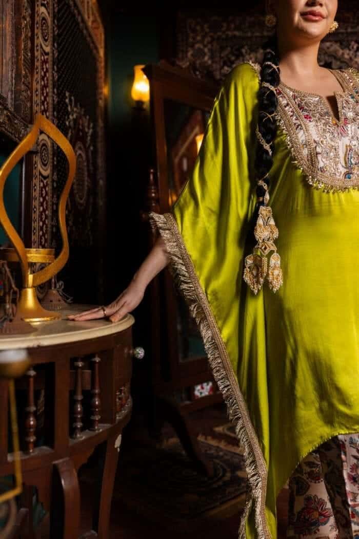 Decollete Neck with lace Detailing on Print patch, C cut Kaftan comes with printed Gajji silk Pants, pant length 36