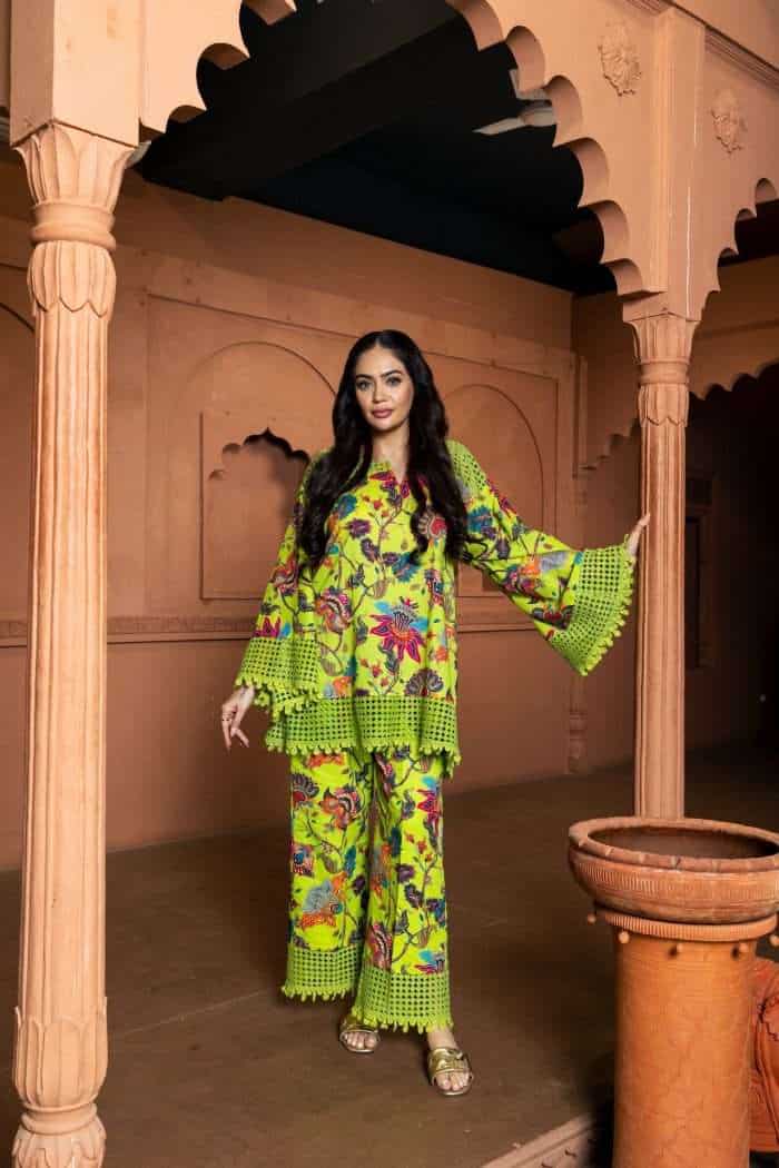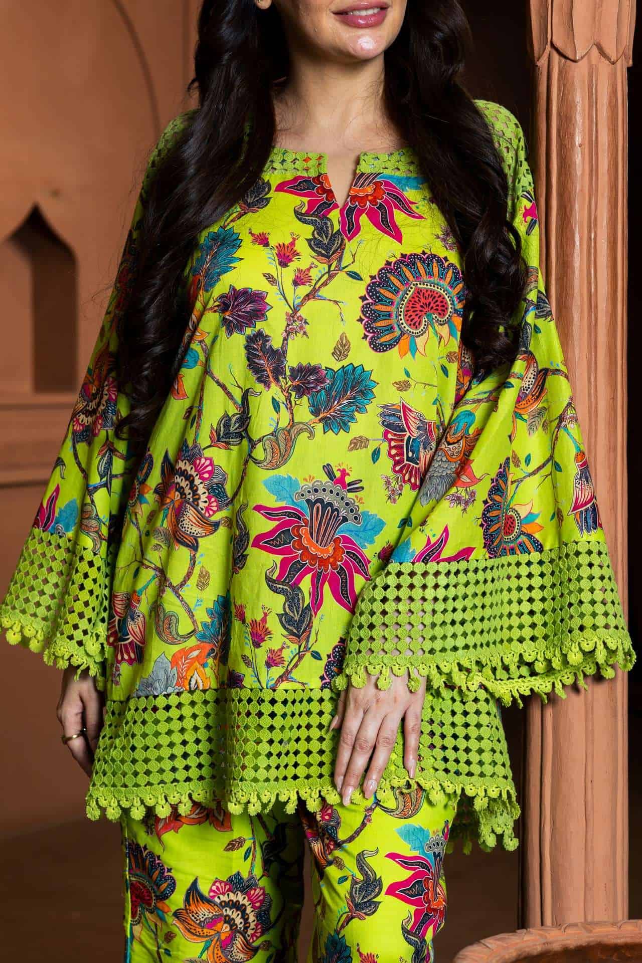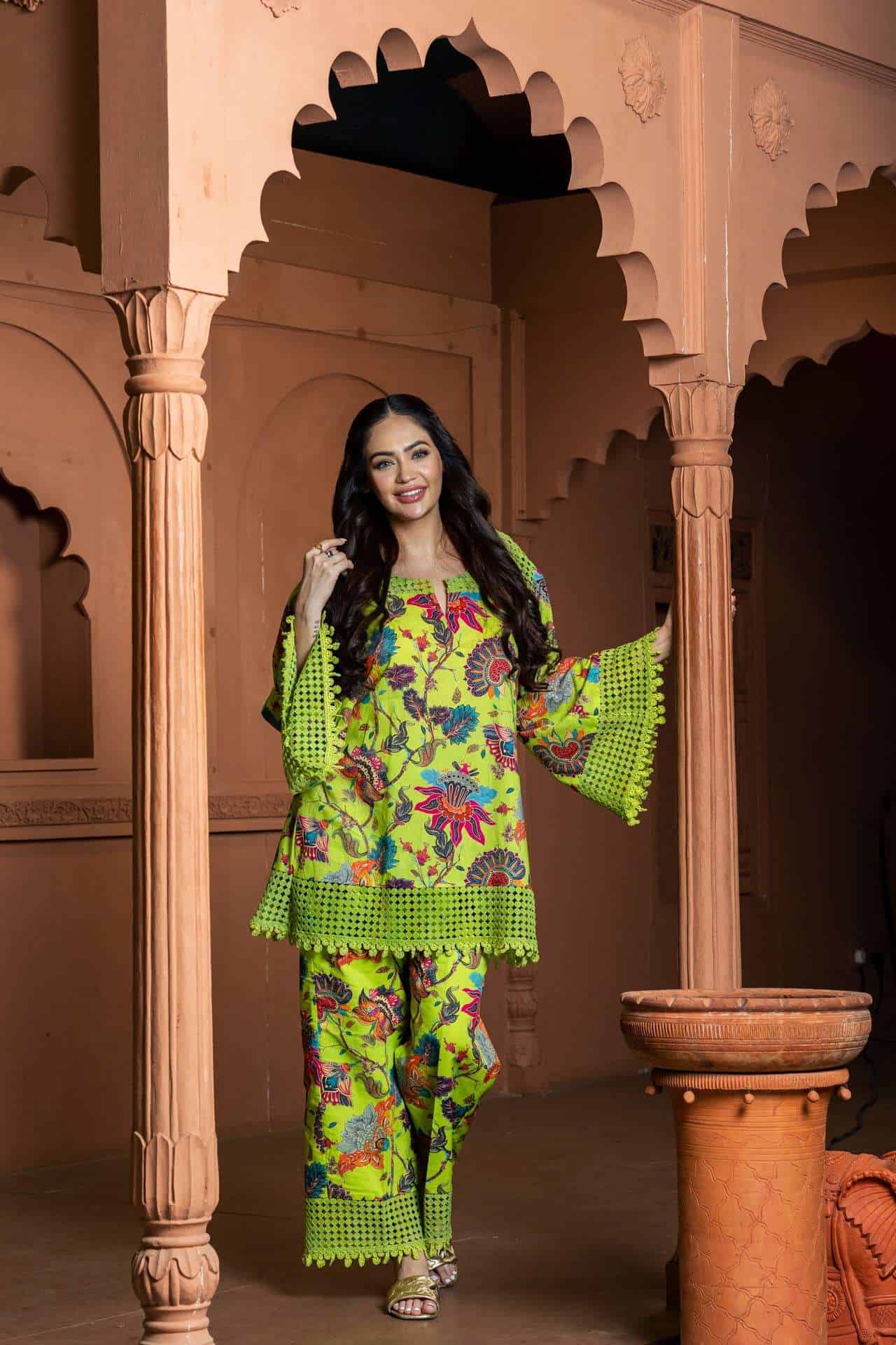 Turn heads effortlessly in this vibrant chartreuse green co-ord set! Featuring bell sleeves, intricate embroidery, and playful fringe trims, this ensemble’s multicolor floral print and delicate lattice cutwork bring a fresh, sophisticated charm to your wardrobe. Perfect for making a bold style statement.