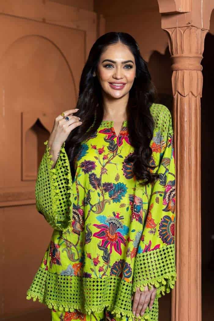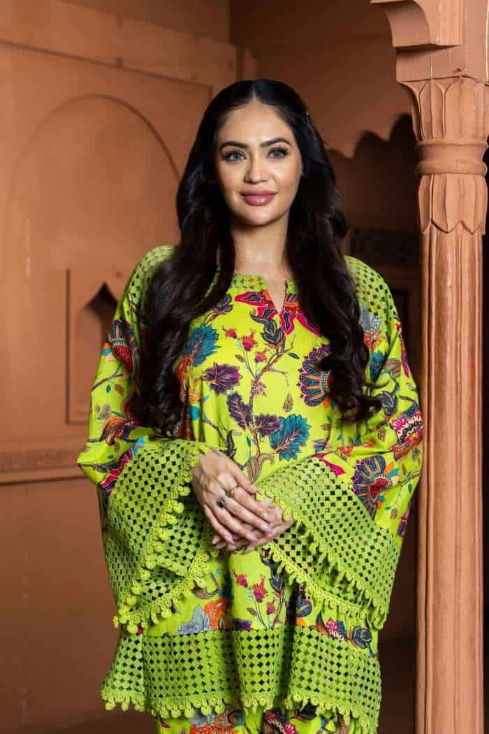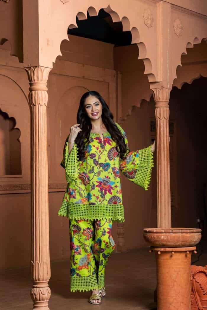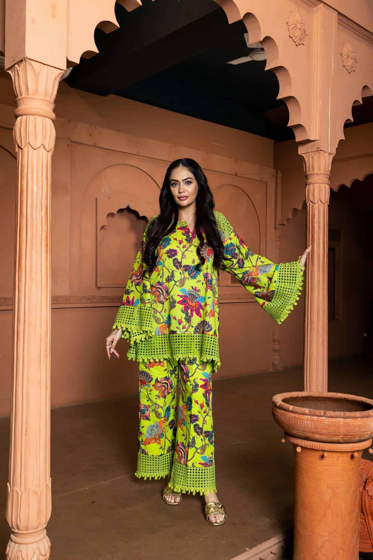 Turn heads effortlessly in this vibrant chartreuse green co-ord set! Featuring bell sleeves, intricate embroidery, and playful fringe trims, this ensemble’s multicolor floral print and delicate lattice cutwork bring a fresh, sophisticated charm to your wardrobe. Perfect for making a bold style statement.