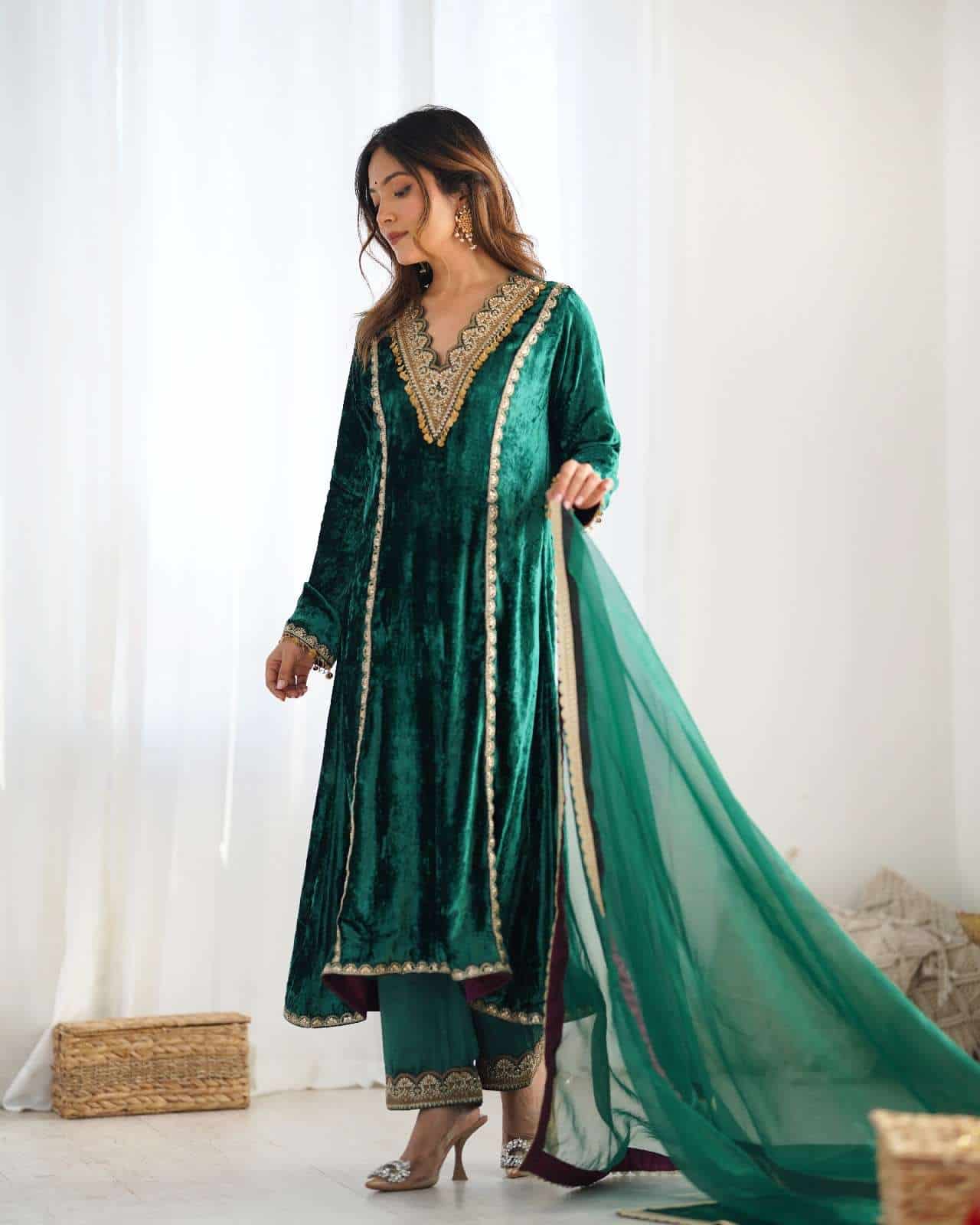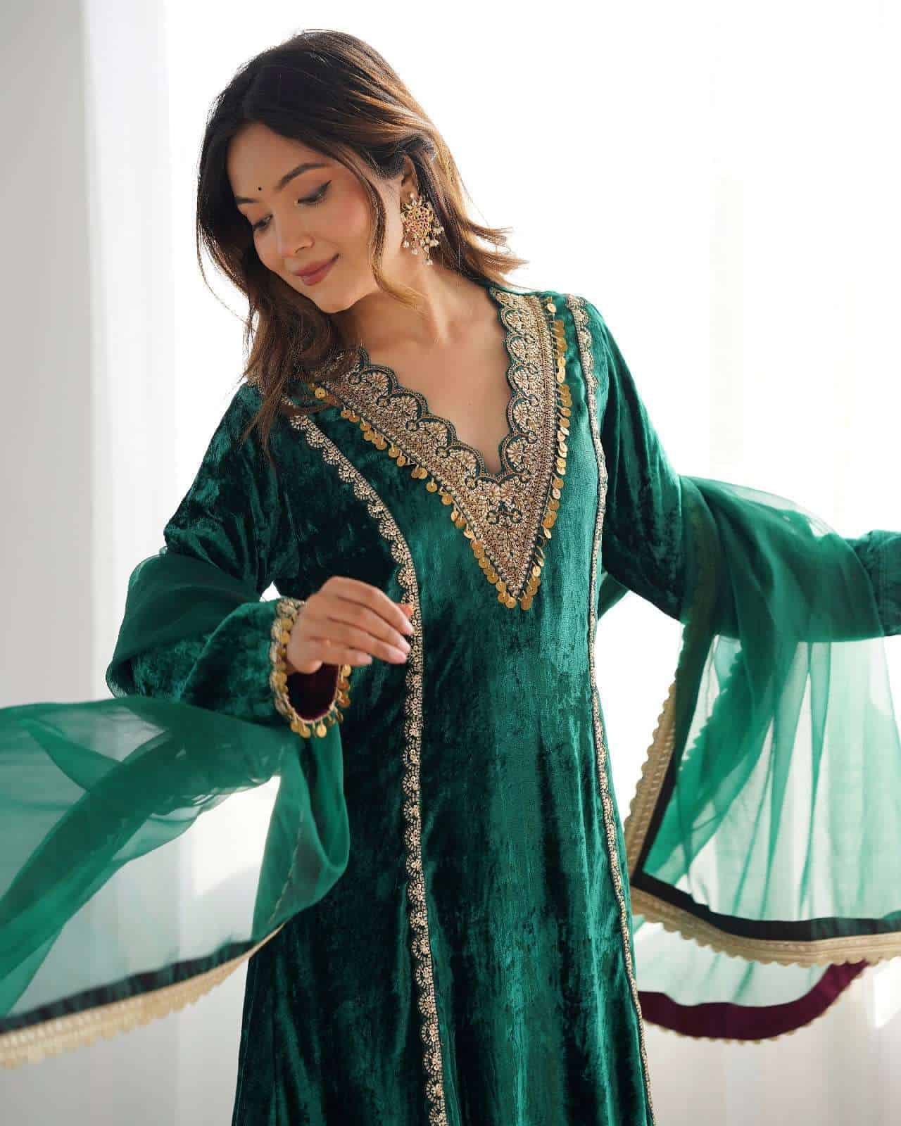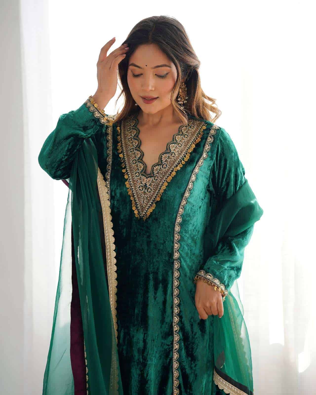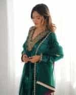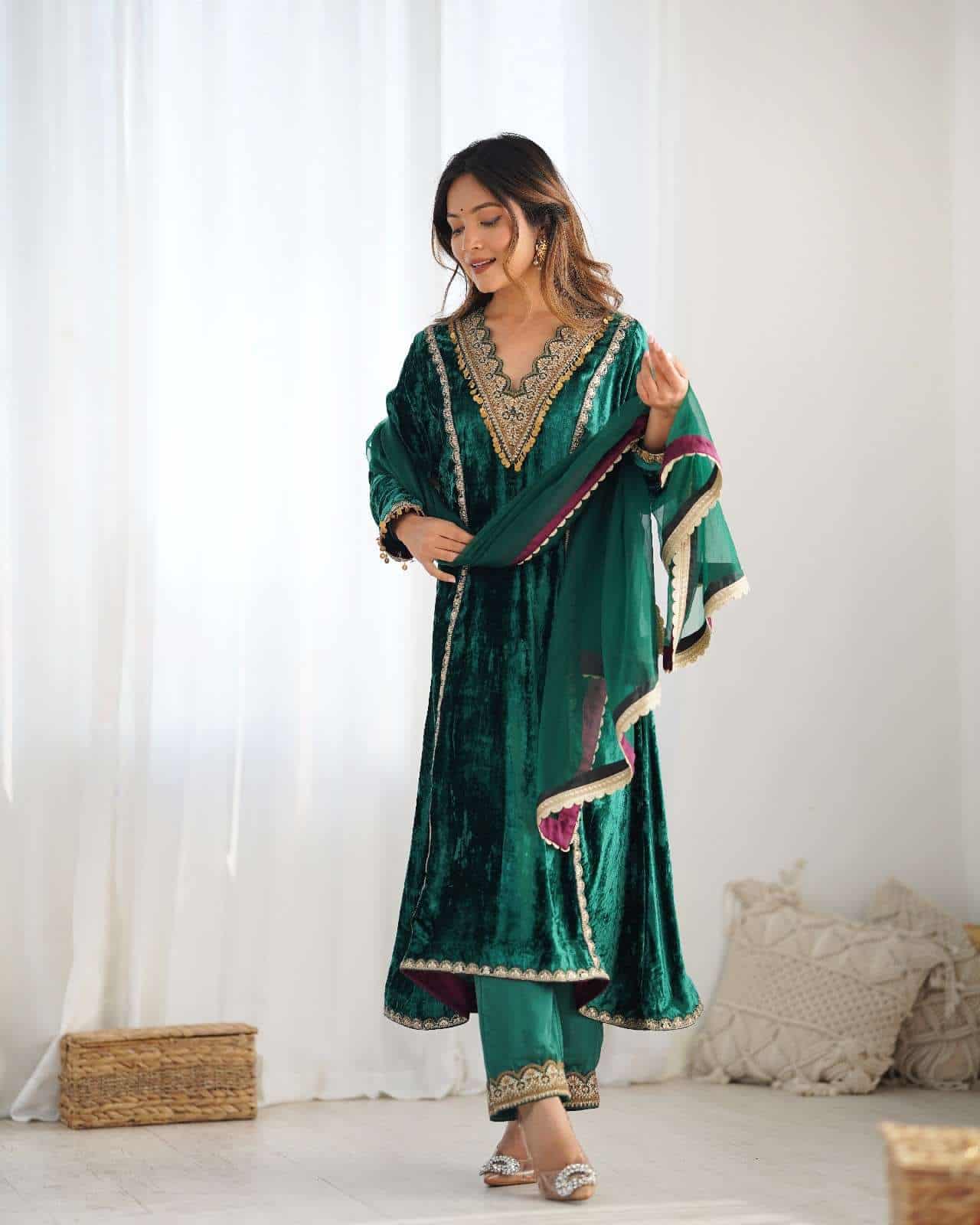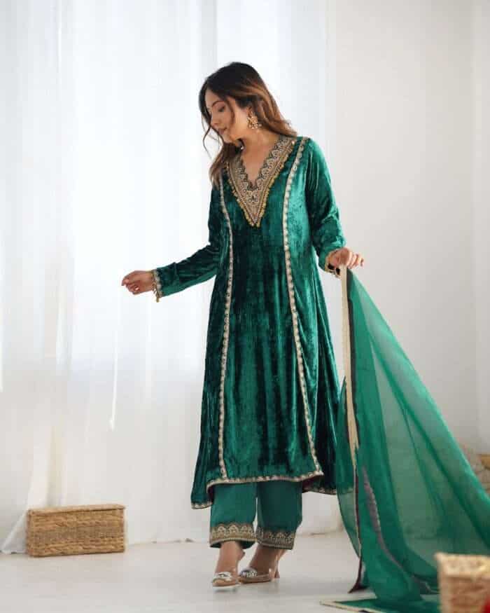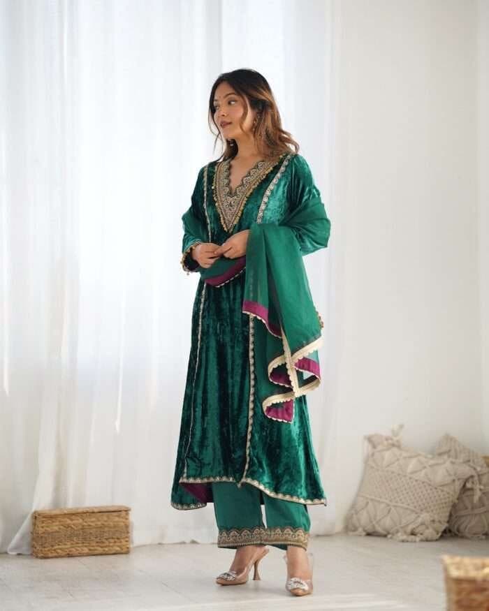 This winter outfit includes a bottle green velvet kurta with lace detailing and a loose fit, solid modal satin palazzo pants with elastic and lace accents, and a breathable organza dupatta with lace detailing.