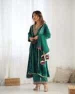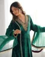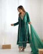 Step into winter in regal style with this stunning bottle green velvet kurta set, featuring intricate lace detailing and a relaxed fit for ultimate comfort. Complemented by elegant modal satin palazzo pants with elastic waist and a soft, breathable organza dupatta, this ensemble perfectly balances sophistication and coziness.