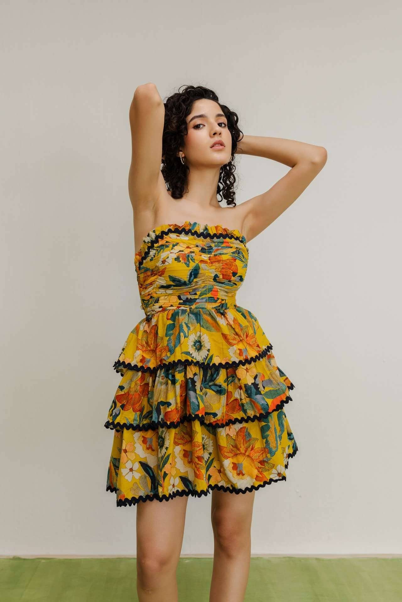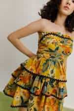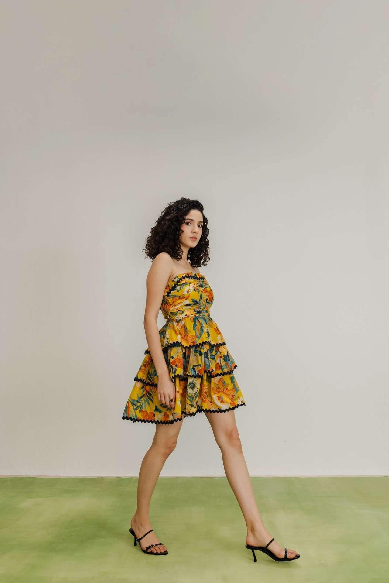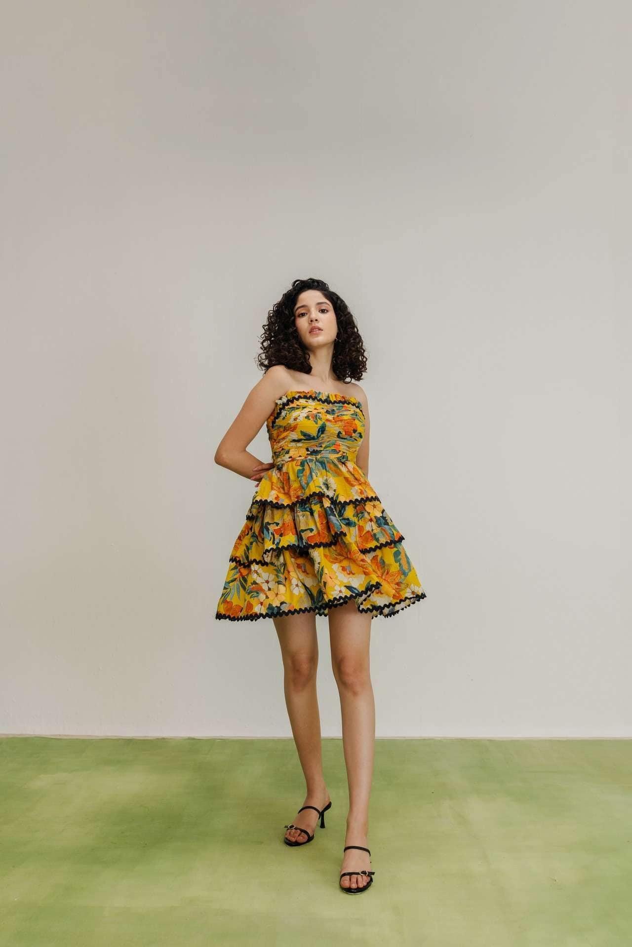 Tropical Ruffle Strapless Dress with a fitted ruched bodice and cinched waist. Features layered ruffles for a playful silhouette. Printed with vibrant tropical florals in warm earthy tones and accented with black lace trim for contrast.
