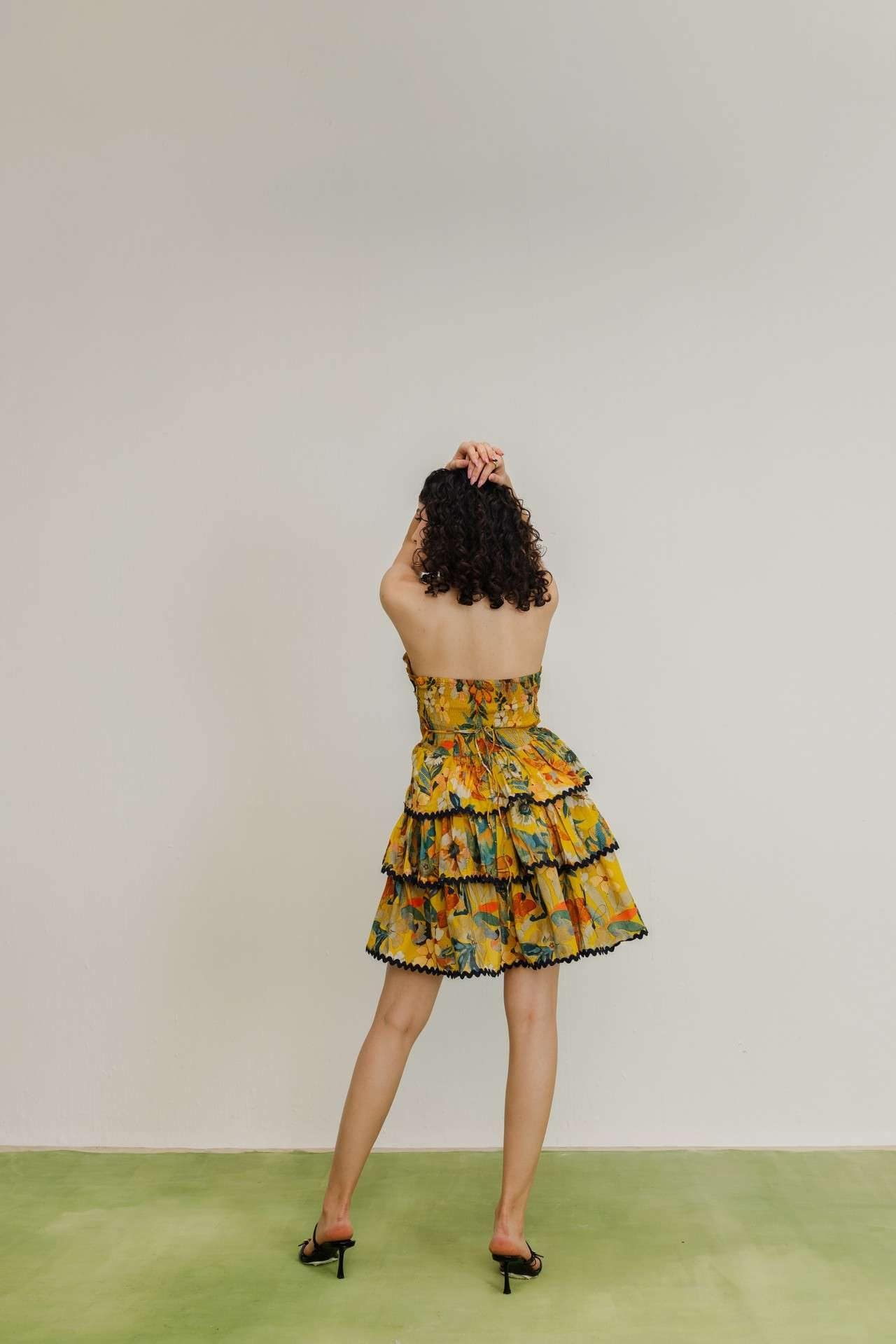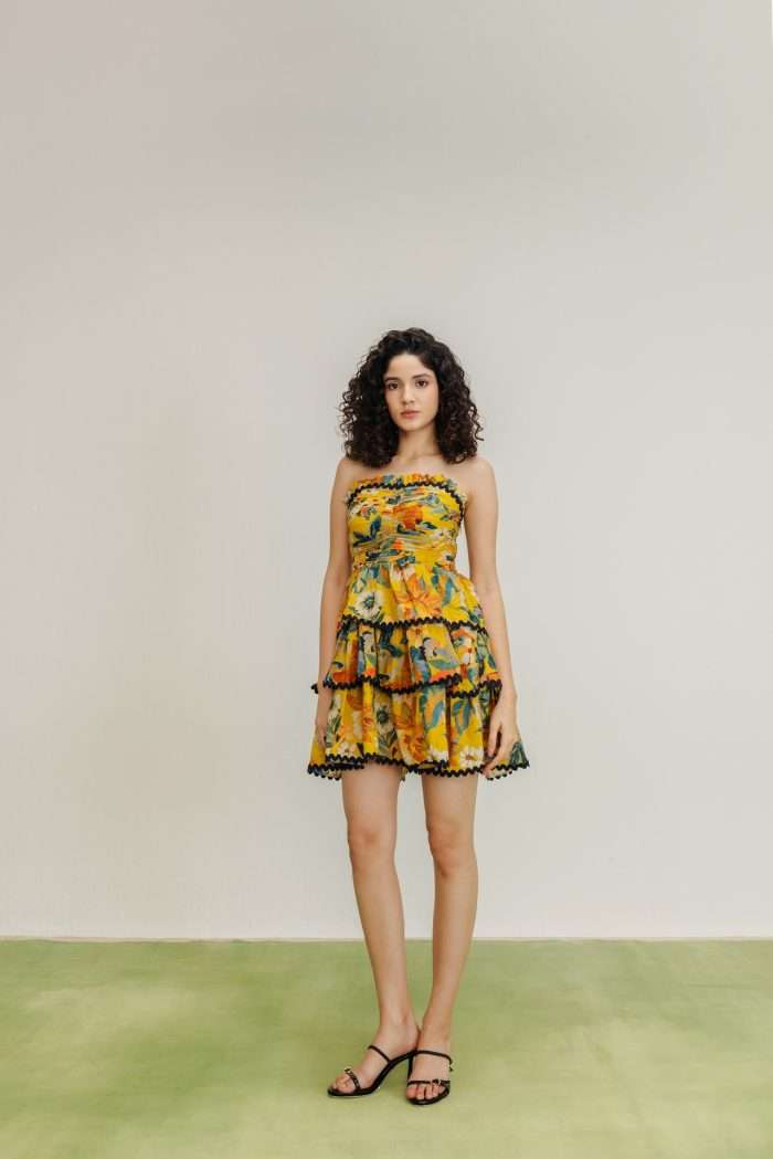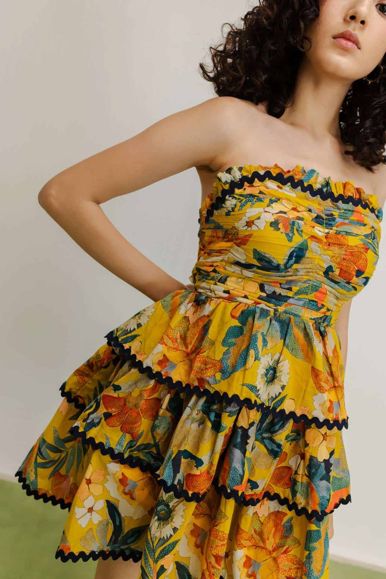 Tropical Ruffle Strapless Dress with a fitted ruched bodice and cinched waist. Features layered ruffles for a playful silhouette. Printed with vibrant tropical florals in warm earthy tones and accented with black lace trim for contrast.
