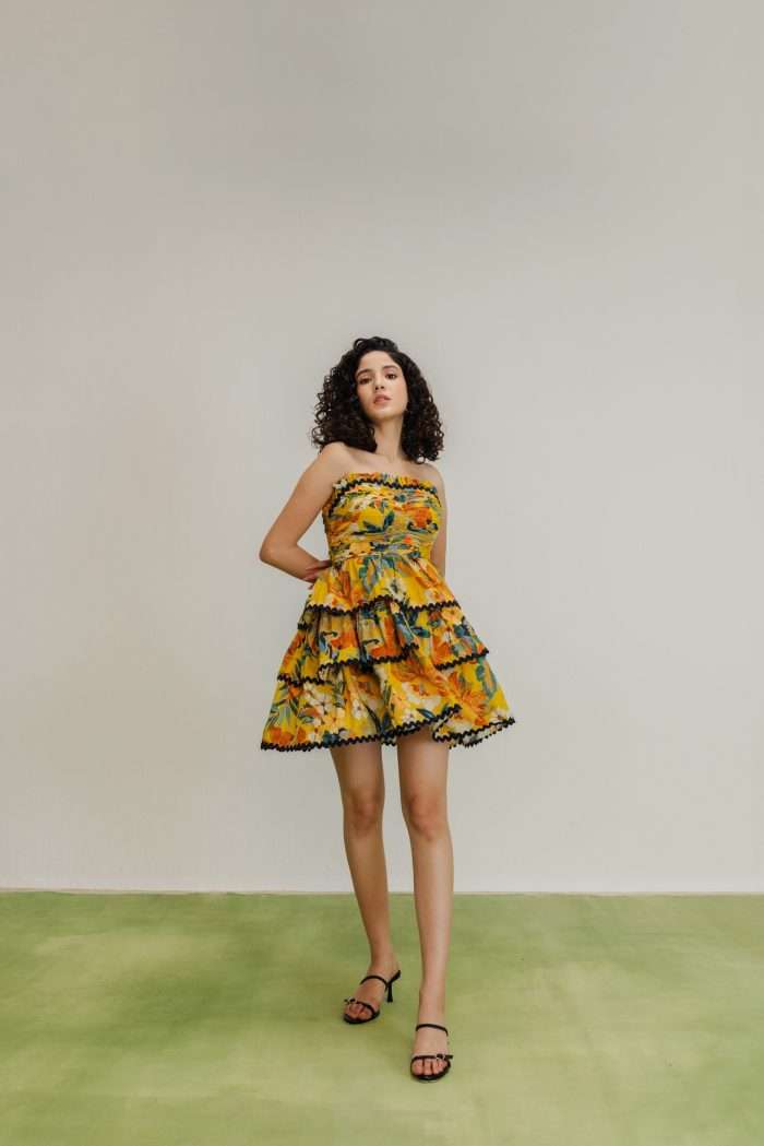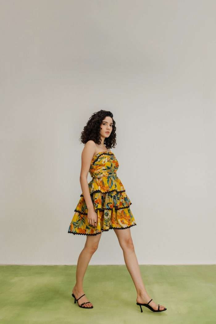 Turn heads in our vibrant Tropical Ruffle Strapless Dress! Designed with a ruched bodice that perfectly hugs your waist, this dress flows into playful layered ruffles. The lively tropical floral print in warm earthy hues radiates sunshine, while the delicate black lace trim adds a sophisticated edge for a look that’s both fun and elegant.