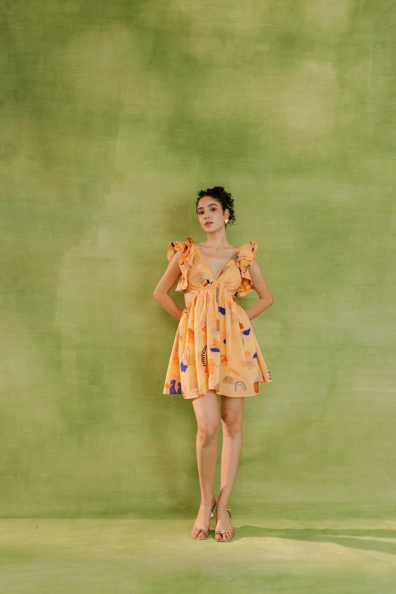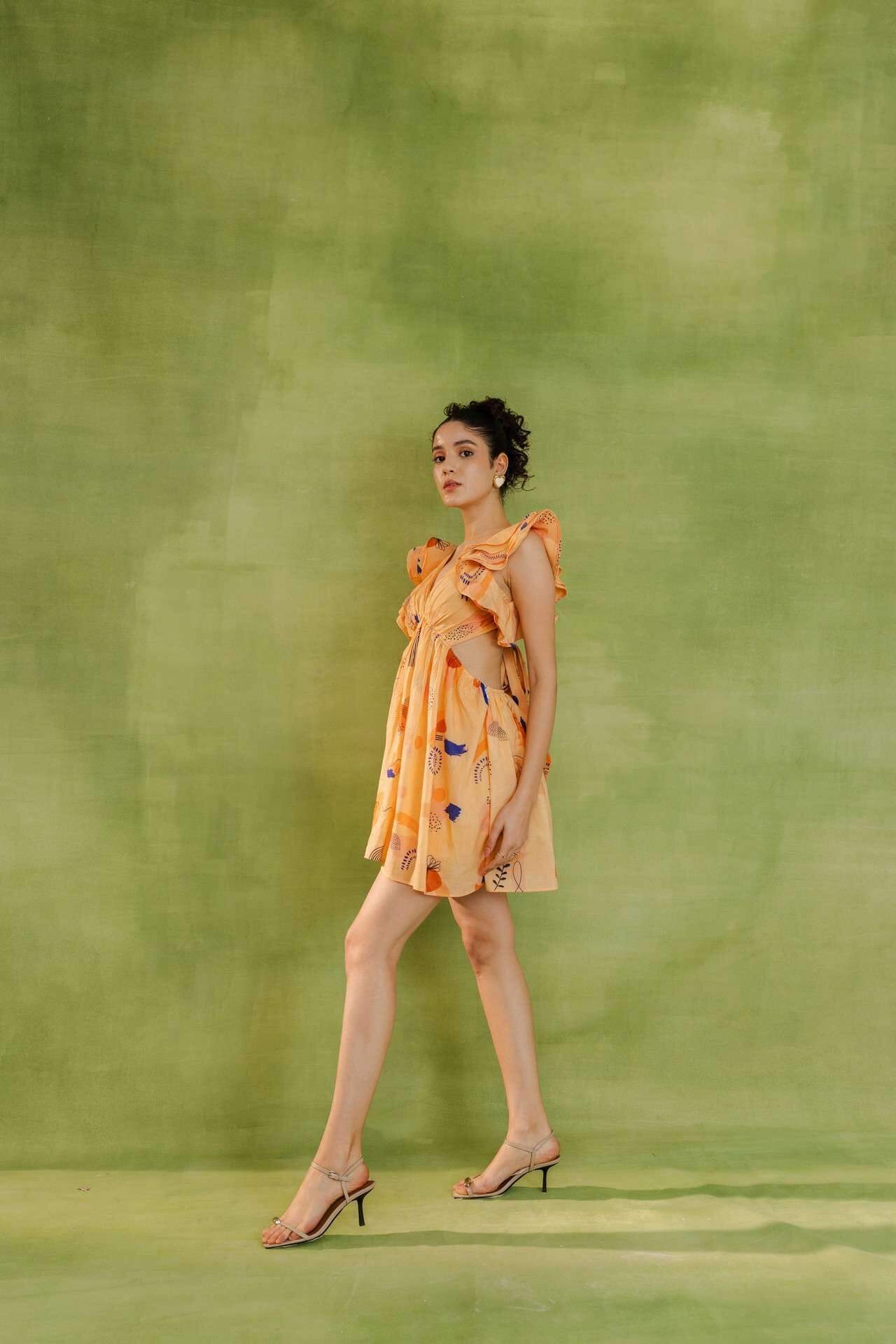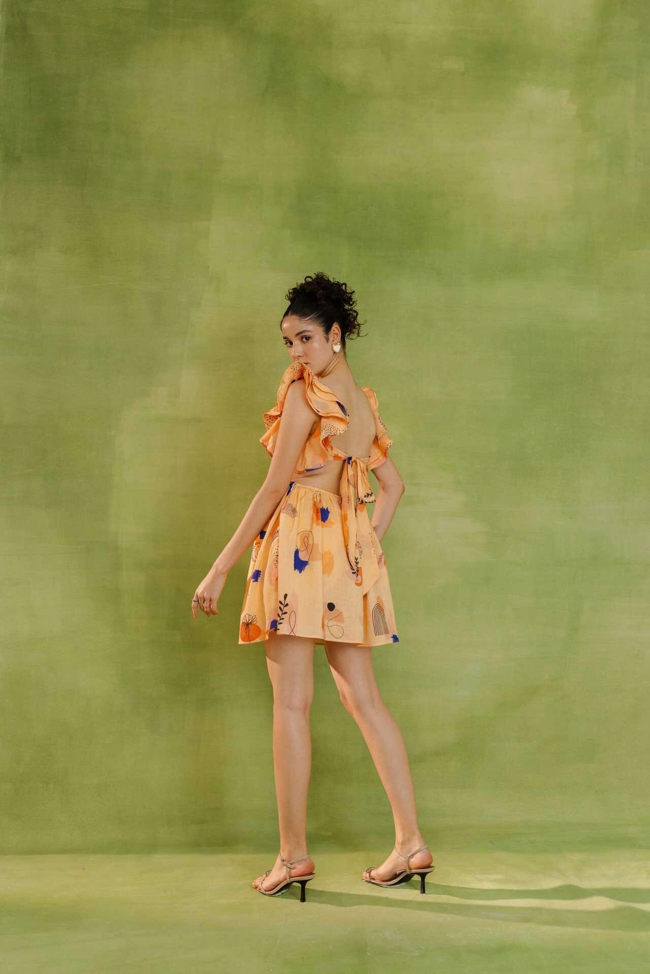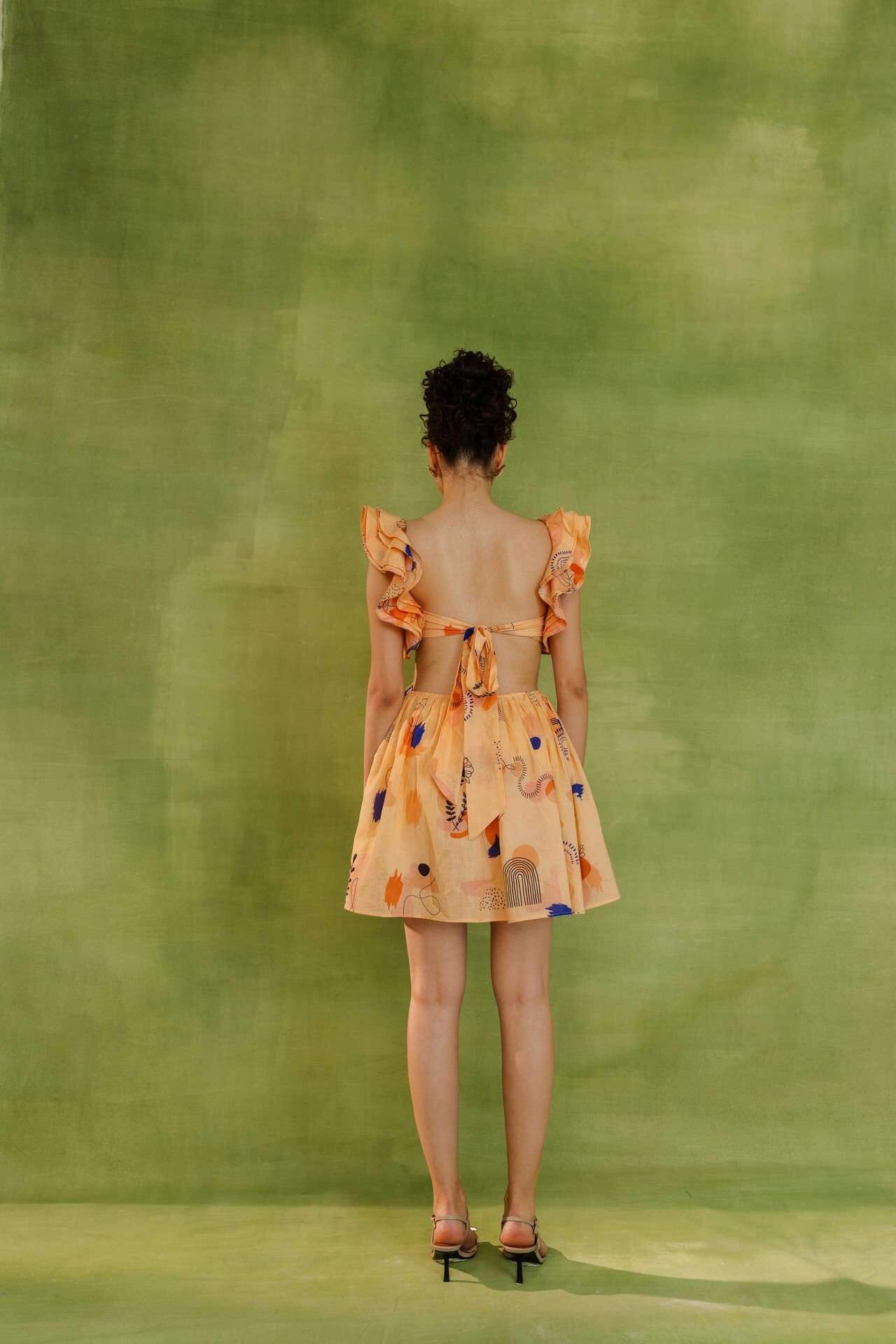 Peach summer dress with flowy silhouette, deep V-neck, ruffled sleeves, abstract print, side cut-outs, and front-tie waist detail. Relaxed fit.