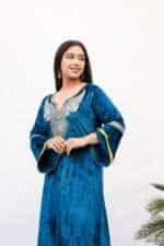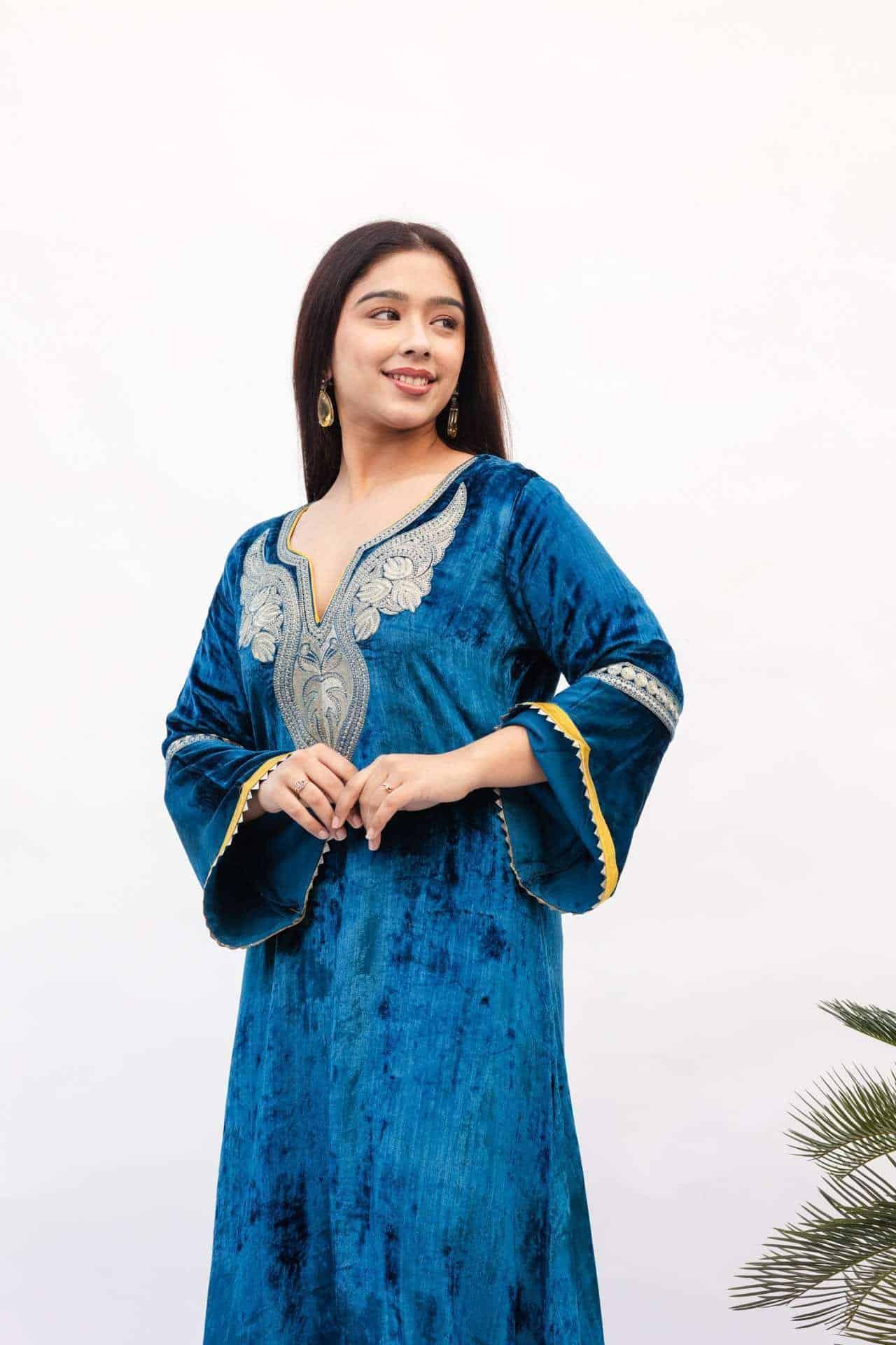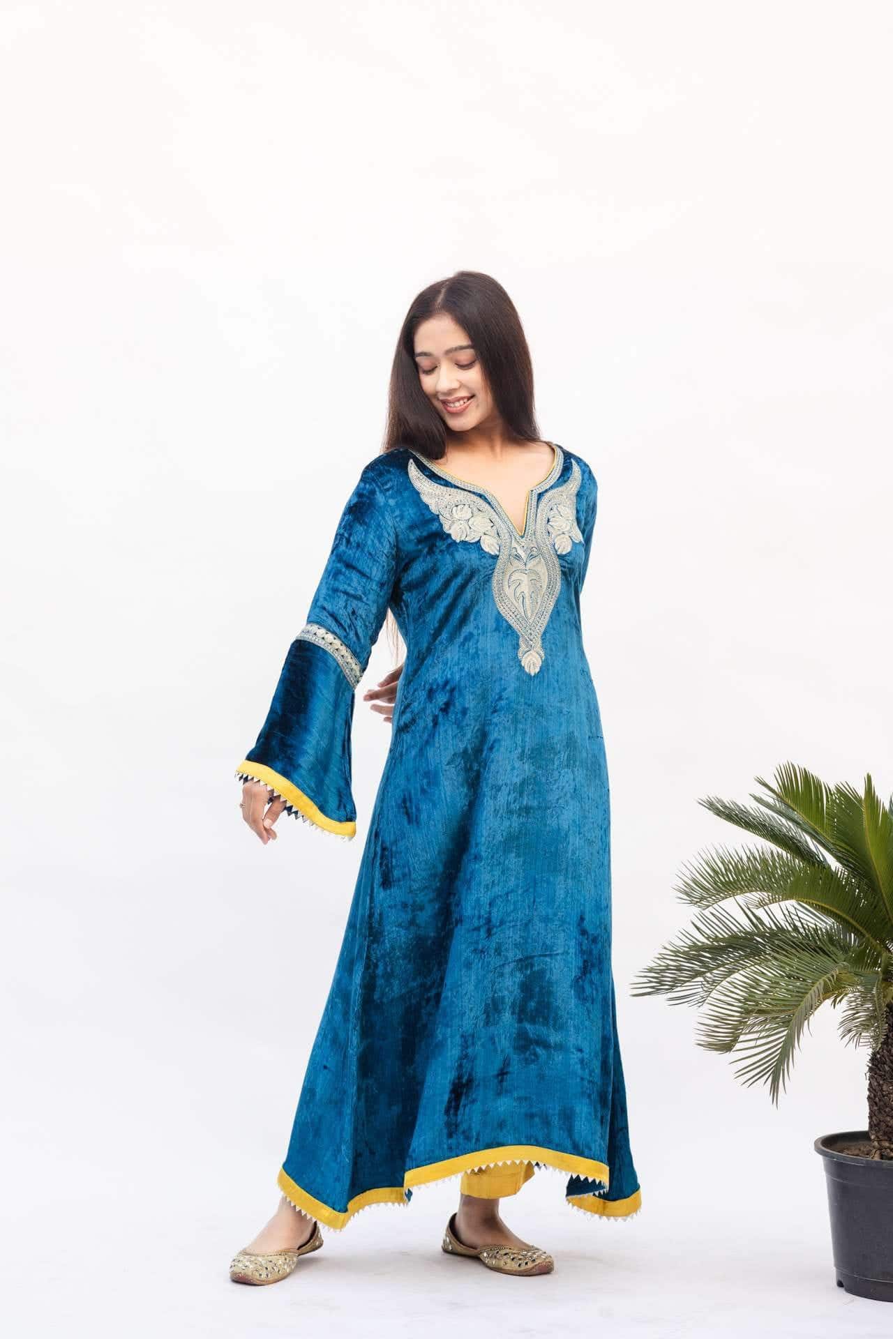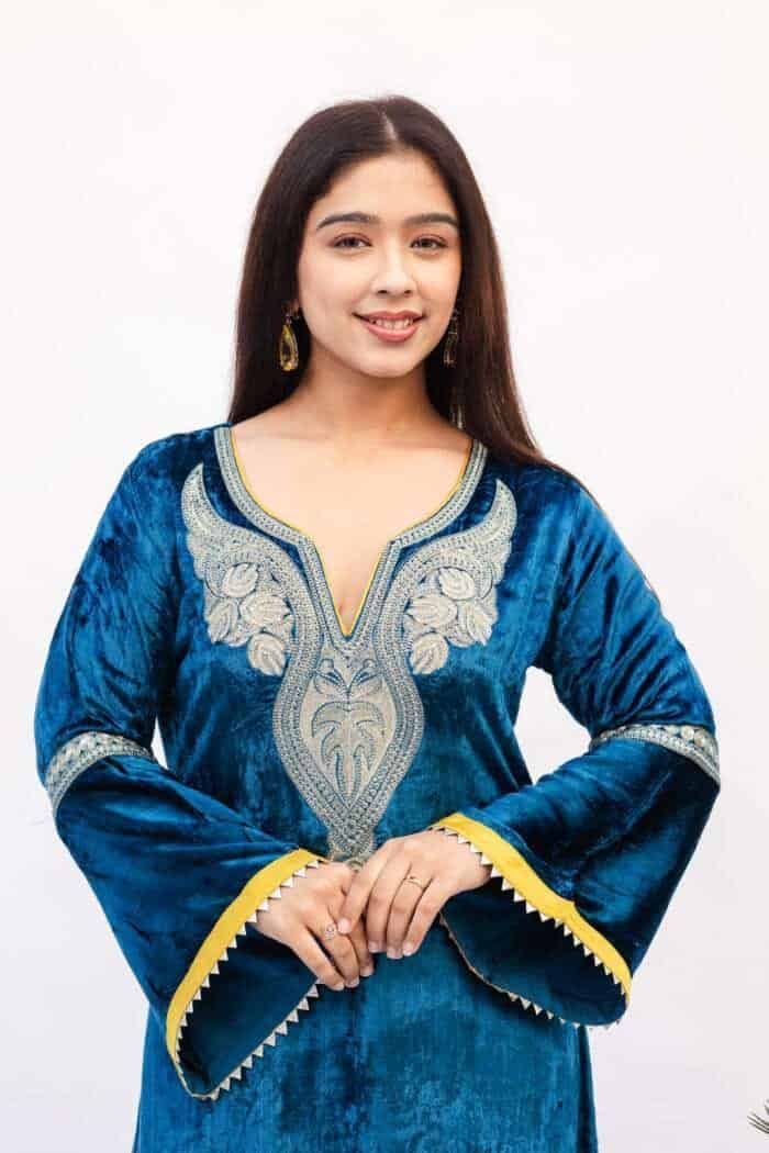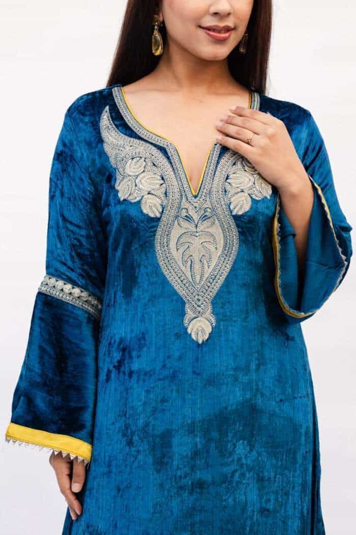 Zuni Velvet Kurta Set featuring exquisite brocade neckline detailing with handwork. Paired with Gajji silk pants.