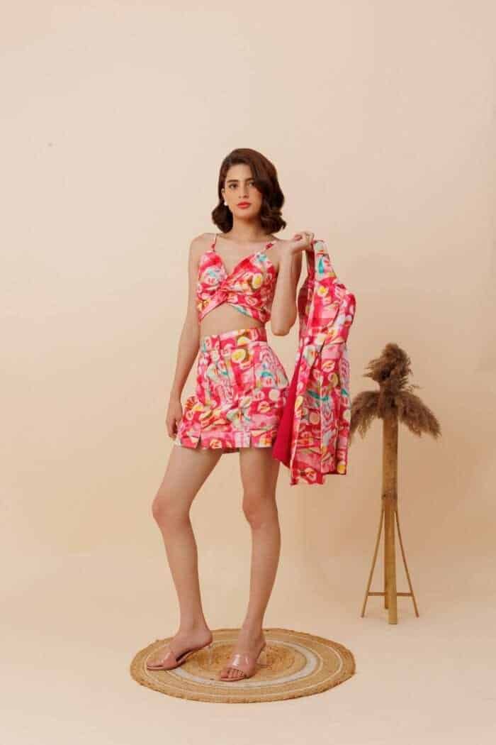 lapel collar with long sleeves and padded shoulders. Front flap pockets. Double-breasted button closure. Noodle straps top. Chic fit Short skirt with cuts on the front