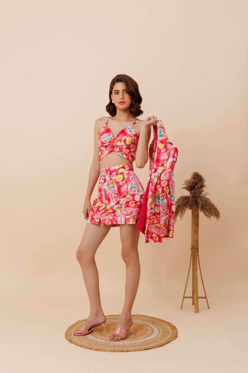Blazer with lapel collar, padded shoulders, long sleeves, and front flap pockets. Double-breasted button closure. Includes a noodle strap top and fitted short skirt with front slits. Ideal for date nights.
