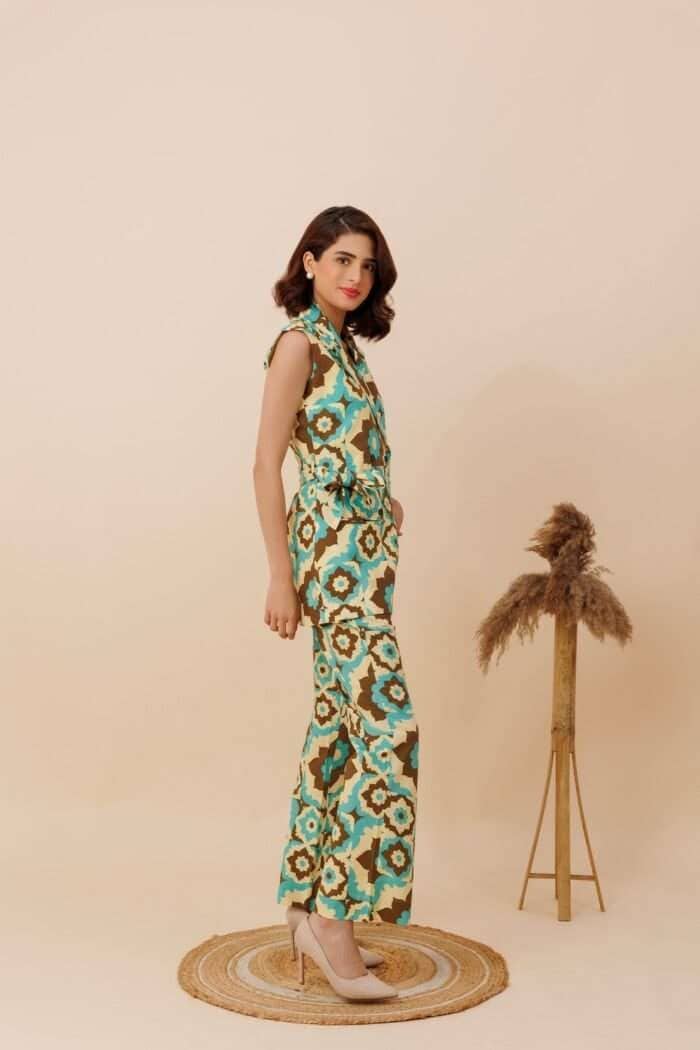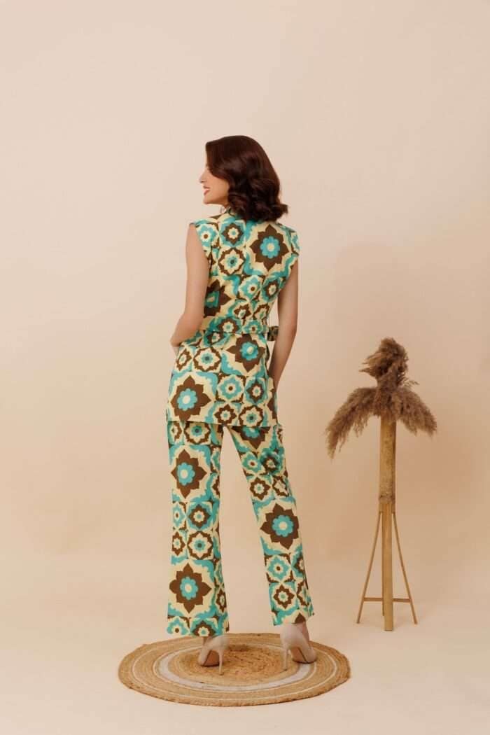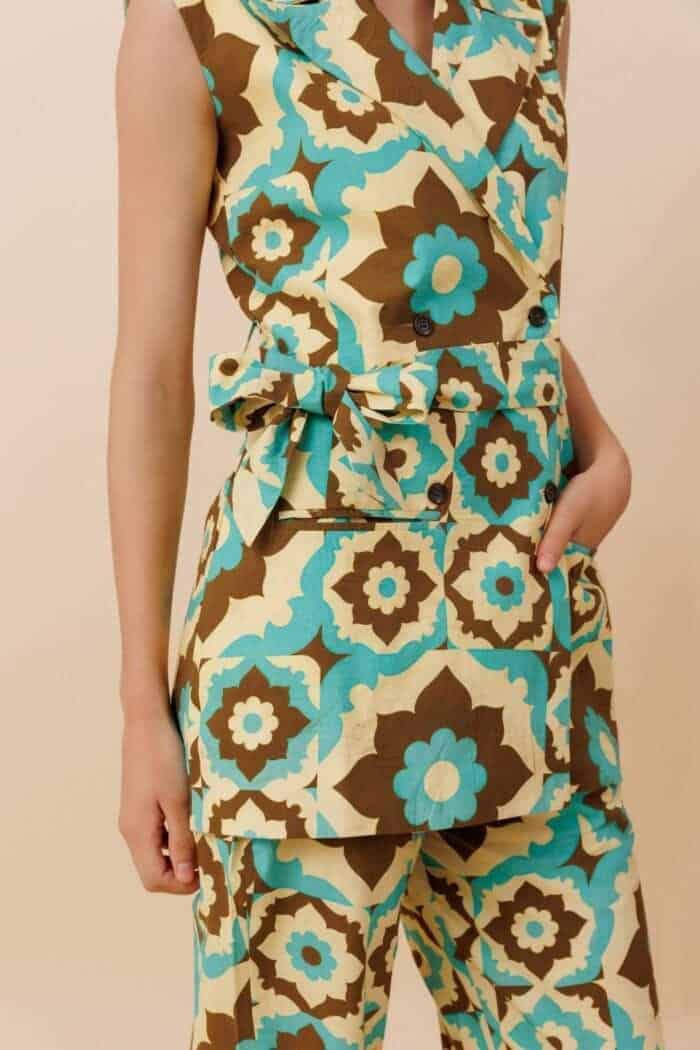 Sleeveless loose-fit waistcoat in abstract print blend, featuring a lapel collar, flap front pockets, chest welt pockets, matching lining, back vent, button-up front, and a belt for added shape.