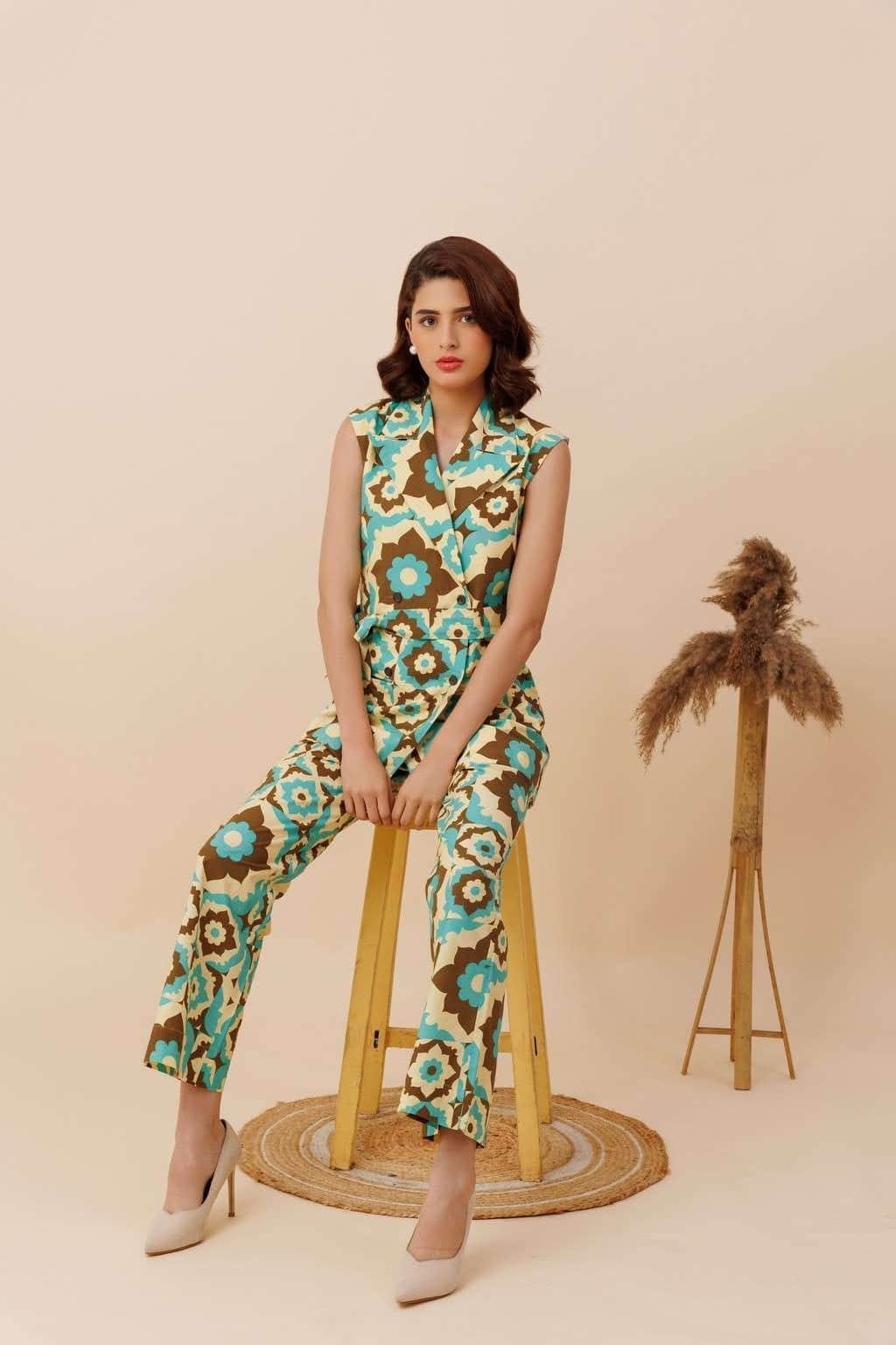 abstract print blend. Lapel collar. Flap pockets on the front and chest welt pockets. Matching lining. Back vent at the hem. Button-up front.